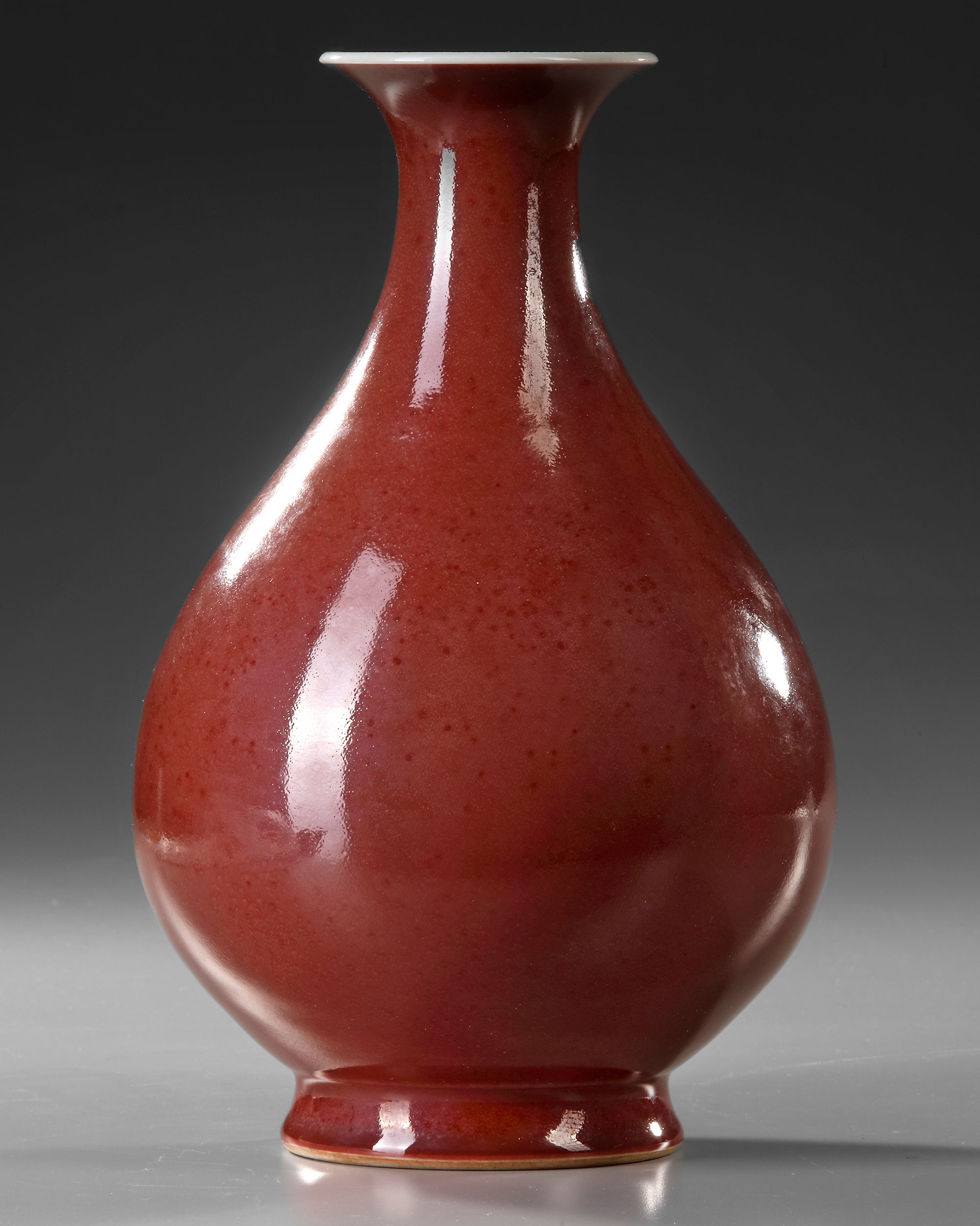 The pear-shaped body with a tall slender neck decorated overall with a thick dark red glaze with pale blue streaks running from the rim, all raised on a gently flared foot.