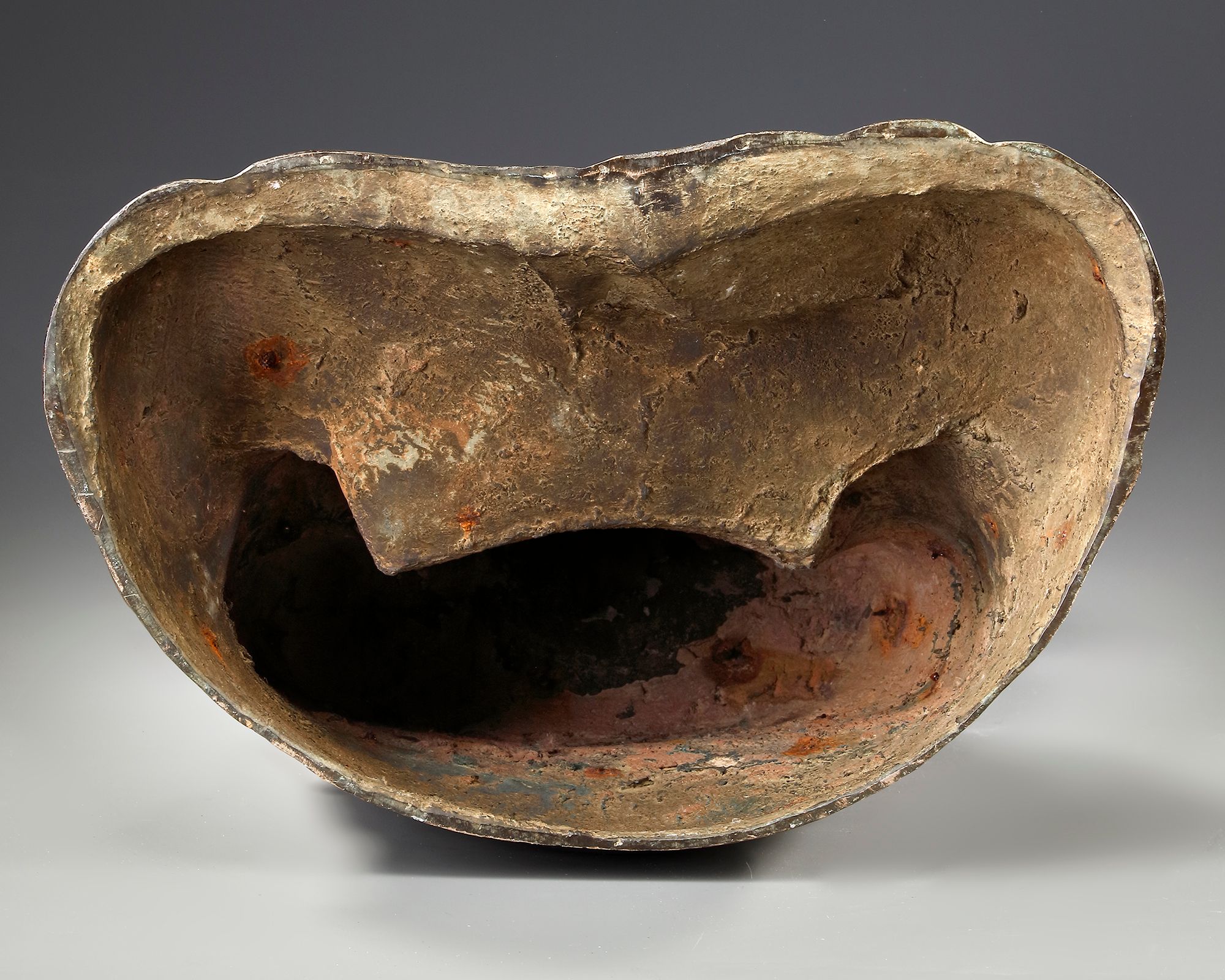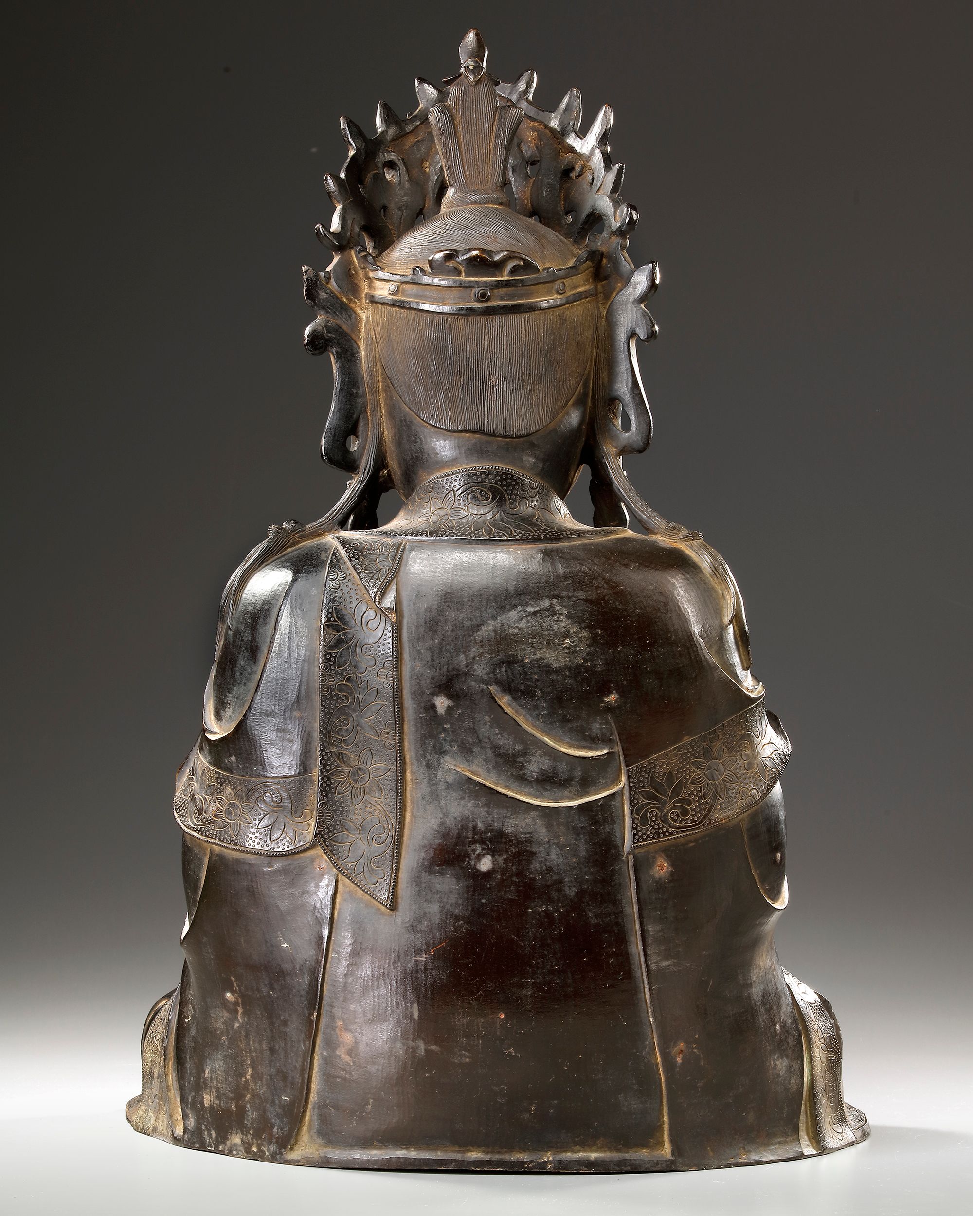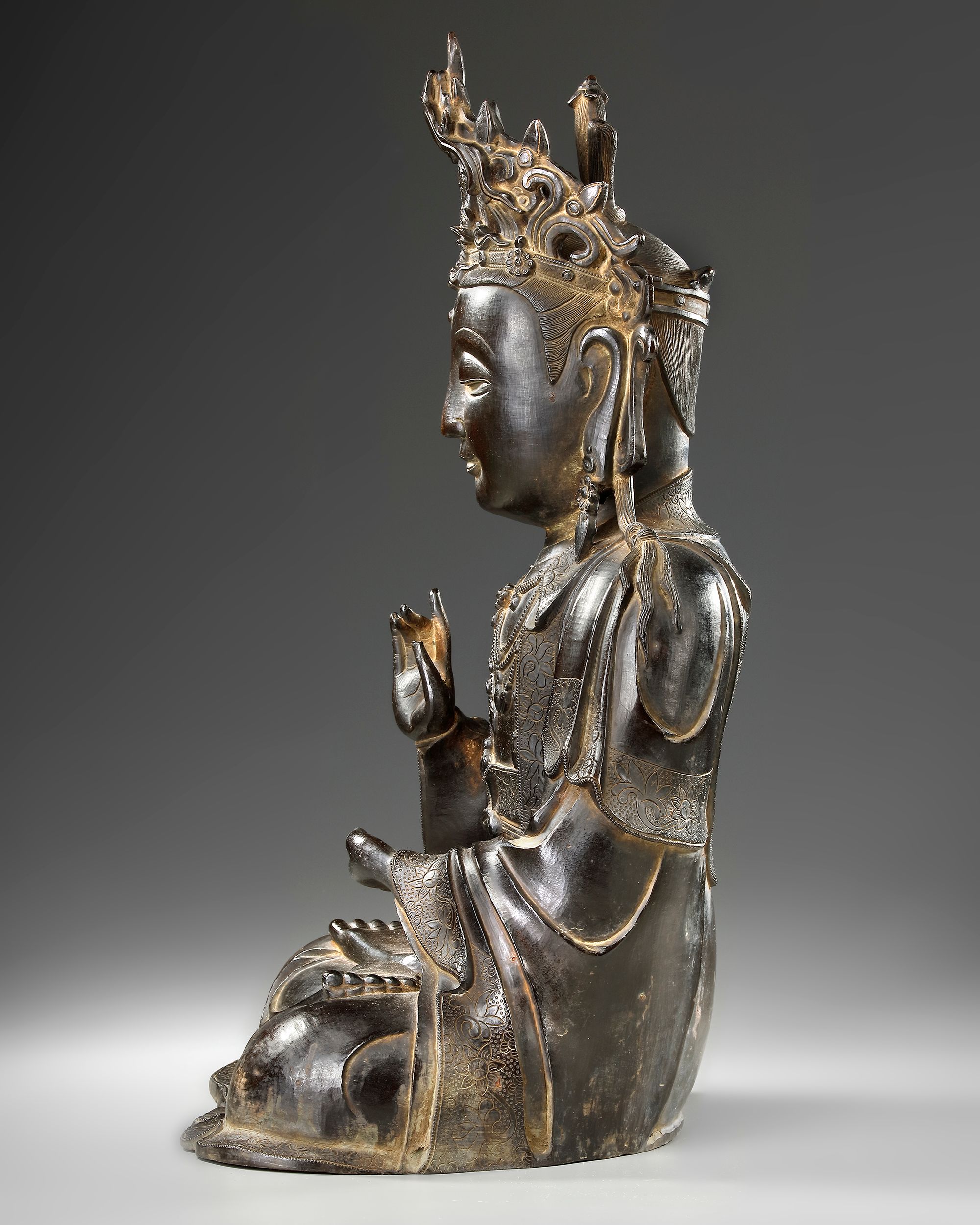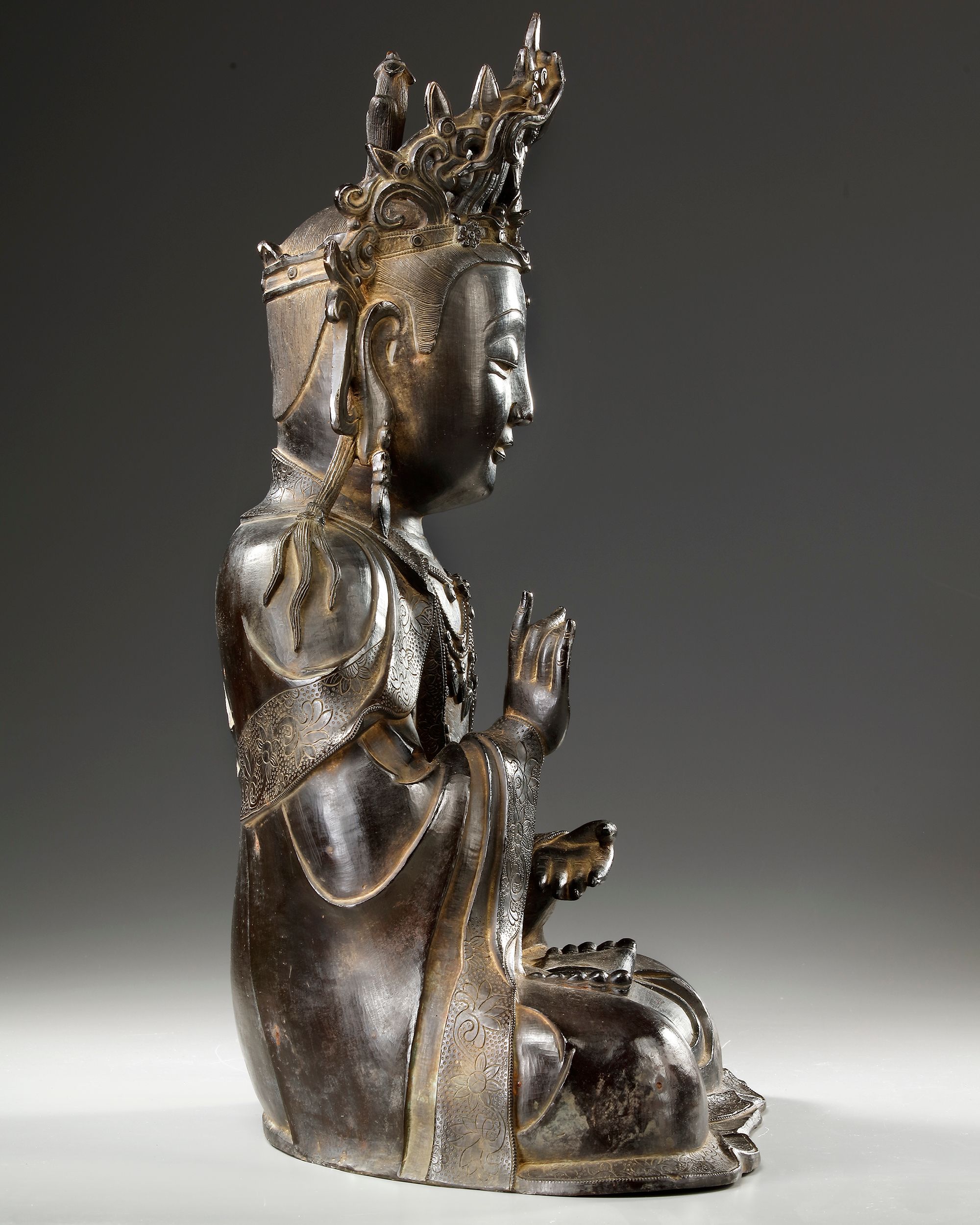 A heavily cast seated dhyanasana, wearing jewels and long robes decorated with flowers at the hem. Her hair is held behind an elaborate crown with Amitabha Buddha in the centre. With one hand held in vitarka mudra and the other one in dhyanamudra.