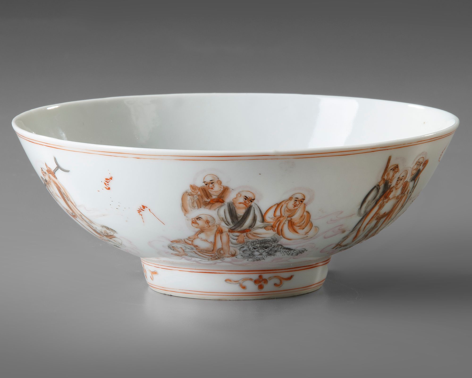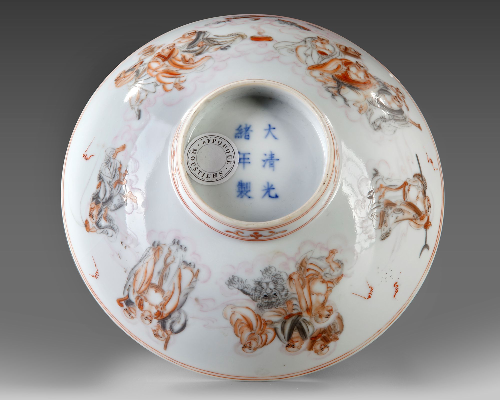 Superbly painted in shaded tones with immortals. 7 cm. height. 16 cm. diam.