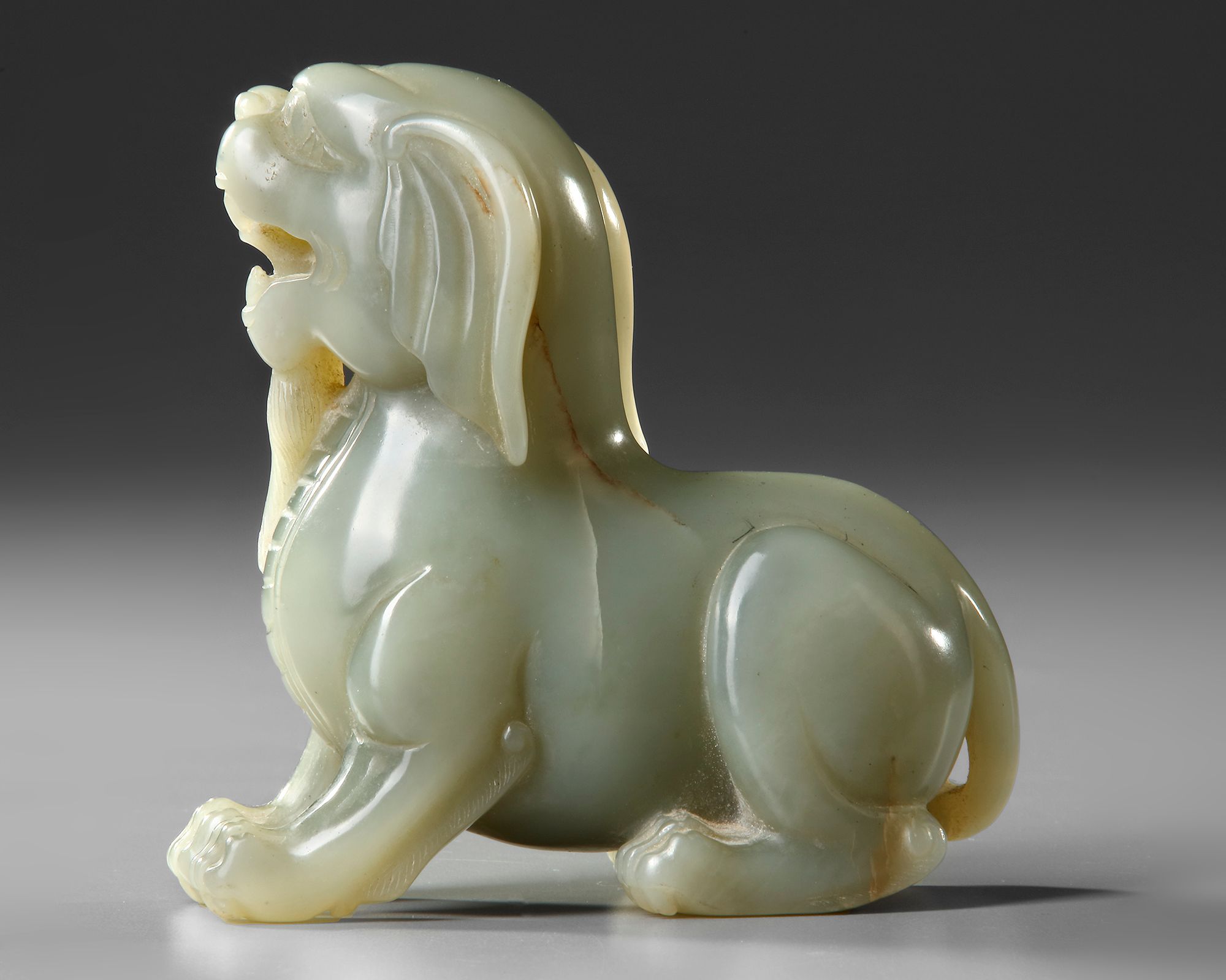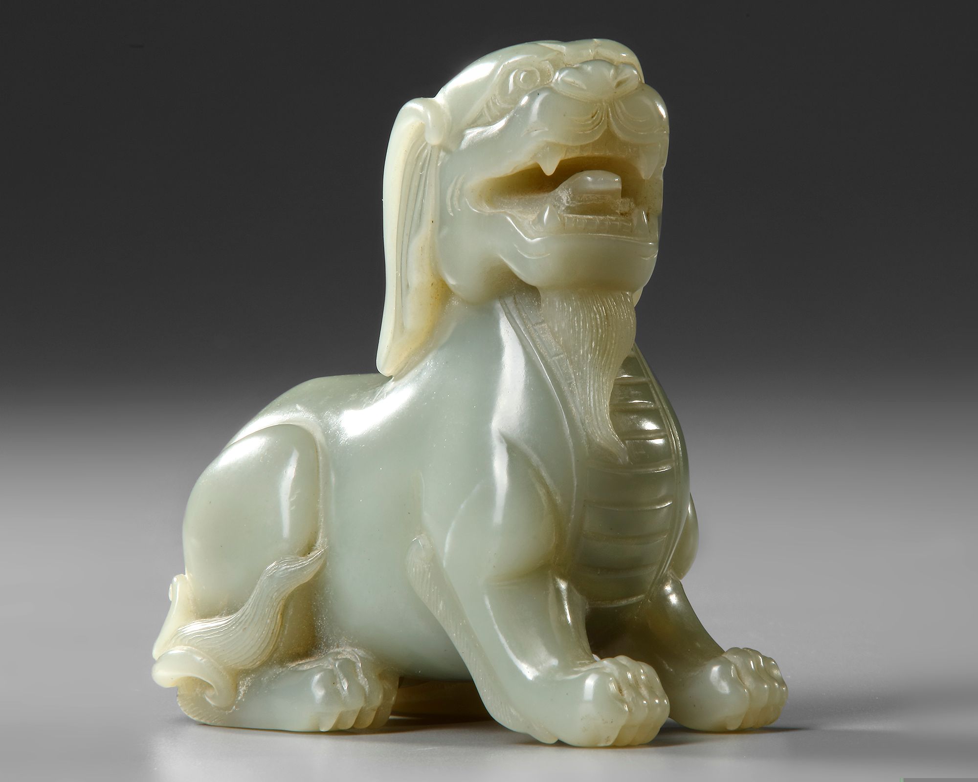 The mythical beast carved with its head held high, with bulging eyes below prominent eyebrows and horned head, with the mane finely incised and resting on the back, the bifurcated tail flicked on the hindquarters.