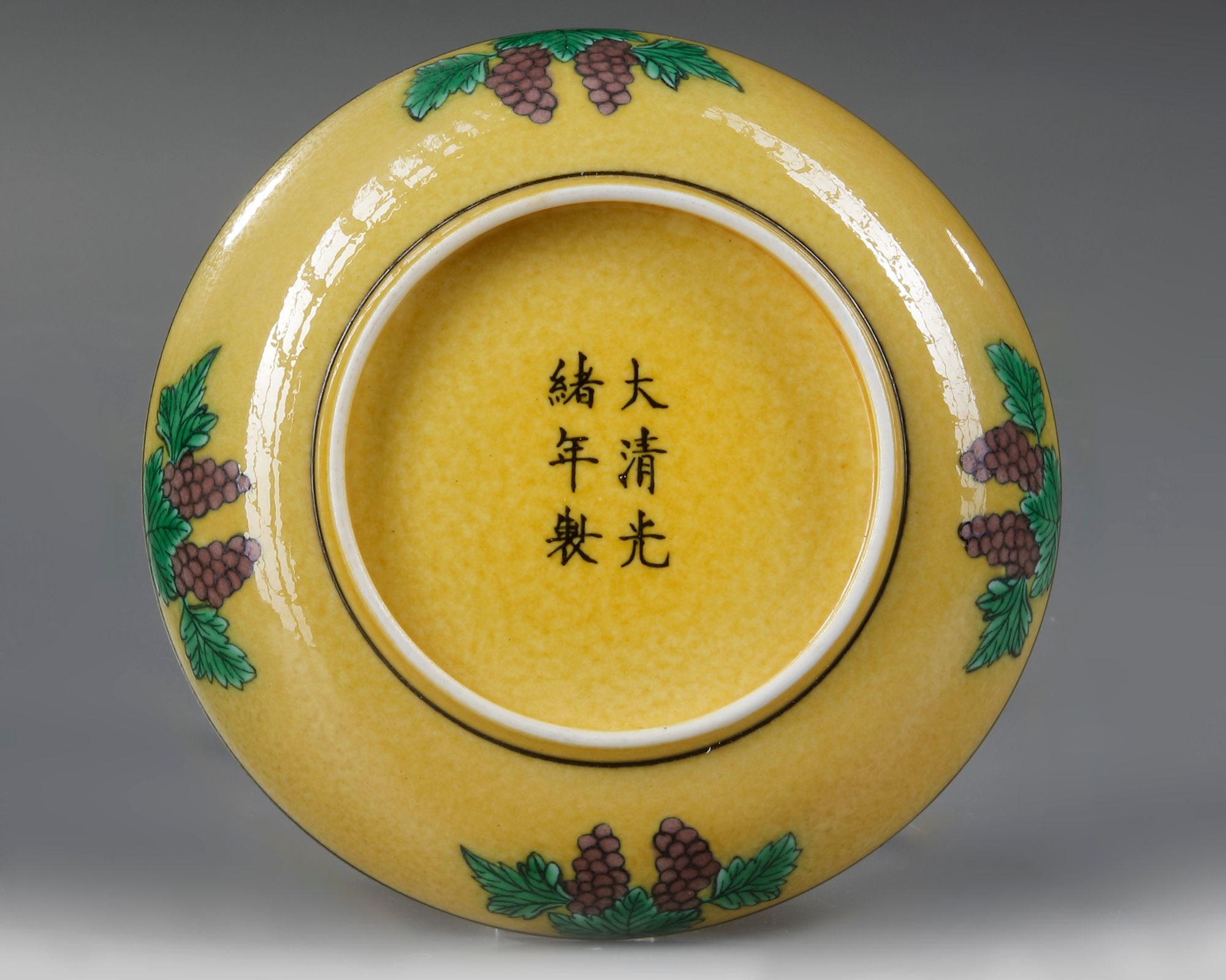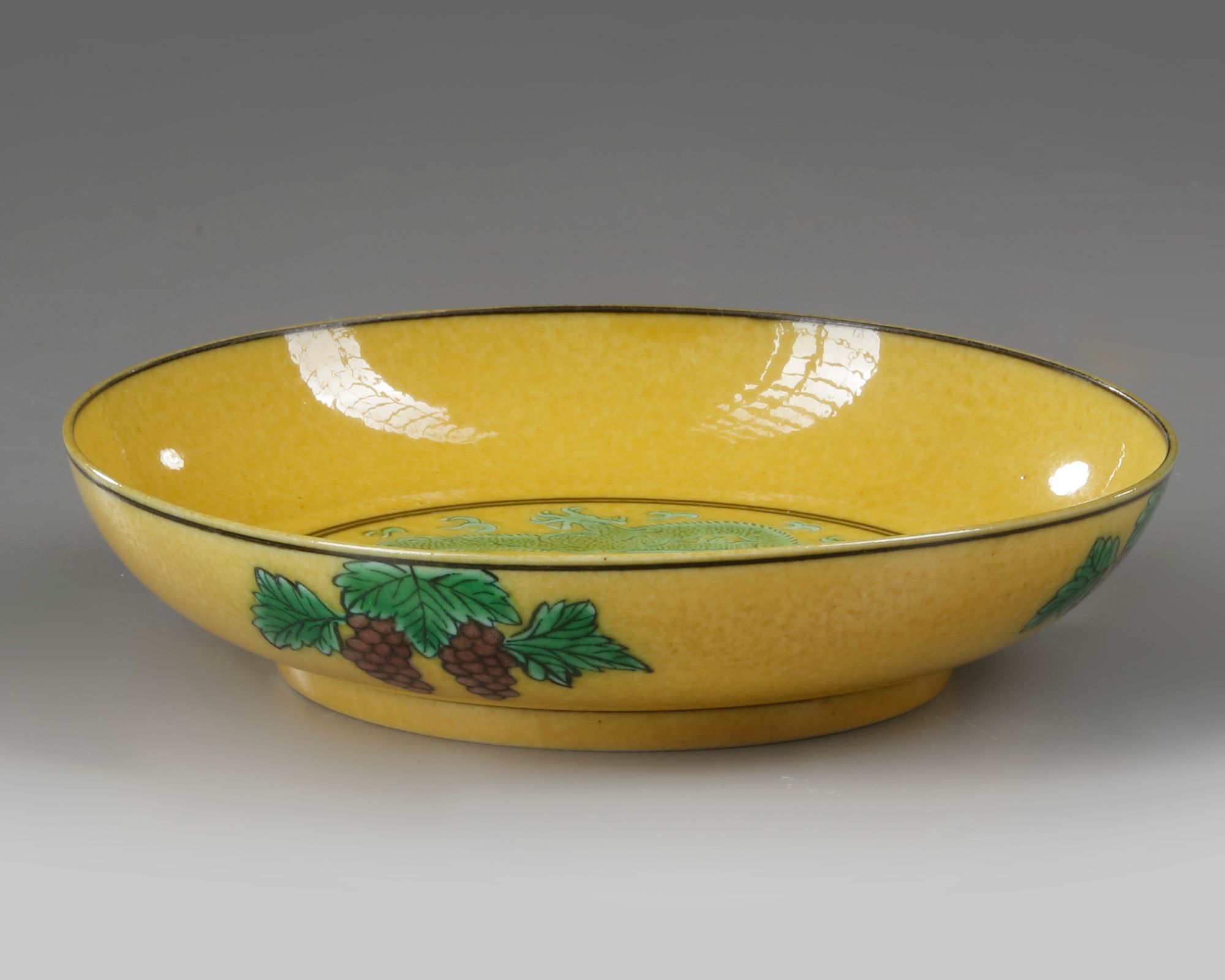 A Chinese dish on a small foot, decorated on a yellow ground to the interior with a roundel enclosing two dragons with five claws chasing a flaming pearl, the exterior with grapes, branches and a Chinese Guangxu six character mark to the bottom.