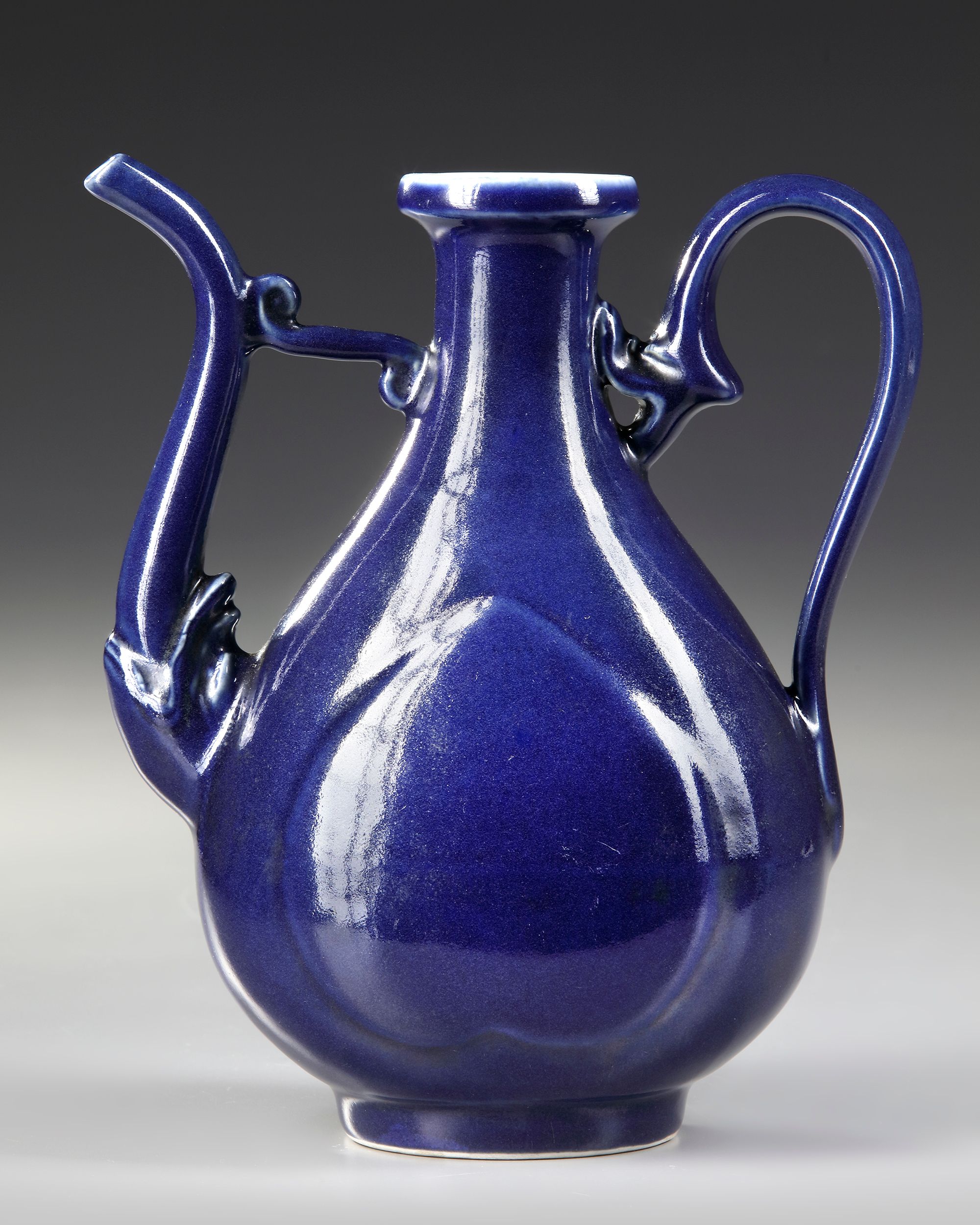 The pear-shaped body tapering up to a narrow neck and an everted rim, set on one side with a curved spout joined to the neck by a leaf shaped strut, opposite the arched strap handle adorned by dragon head, covered allover with a deep blue glaze.