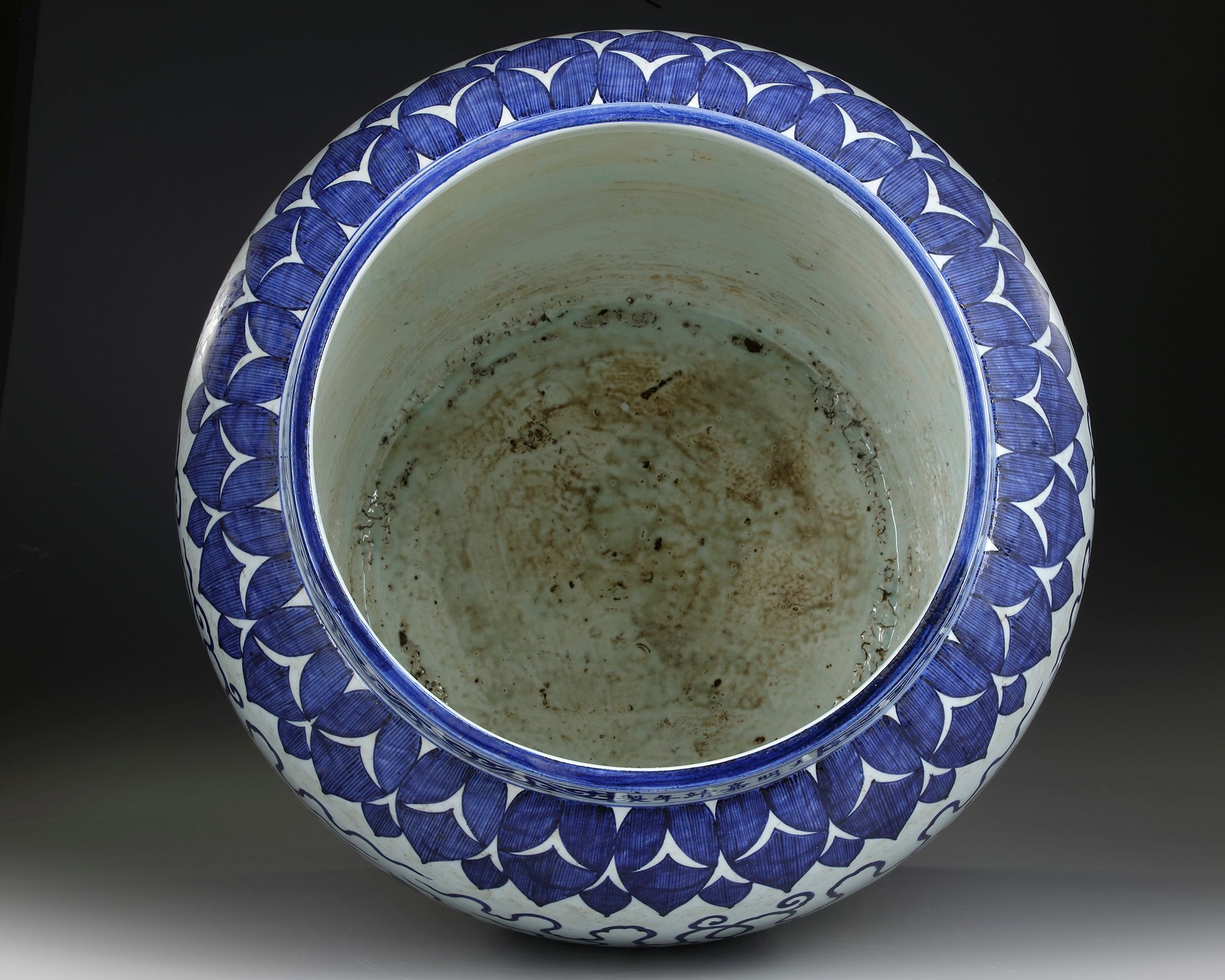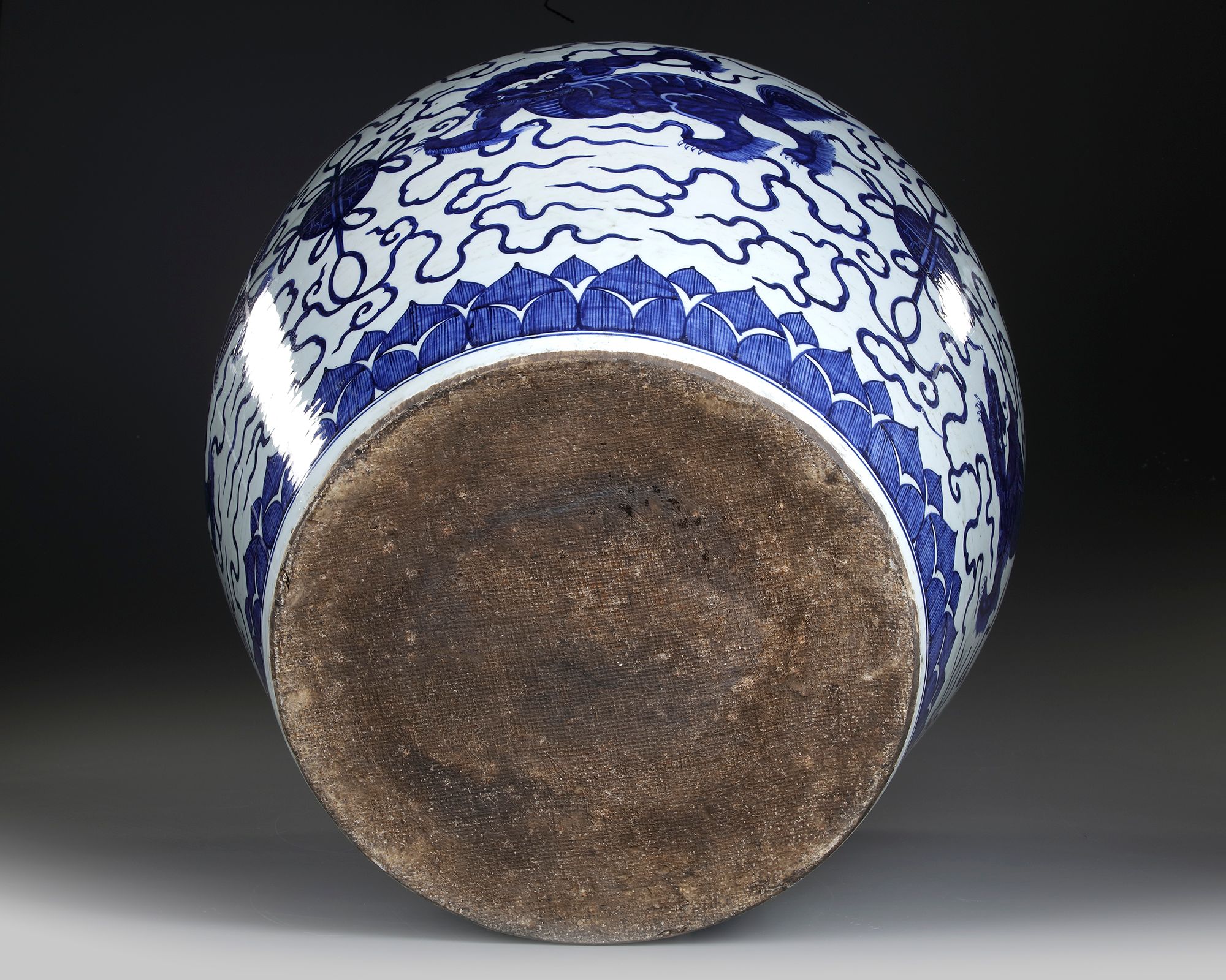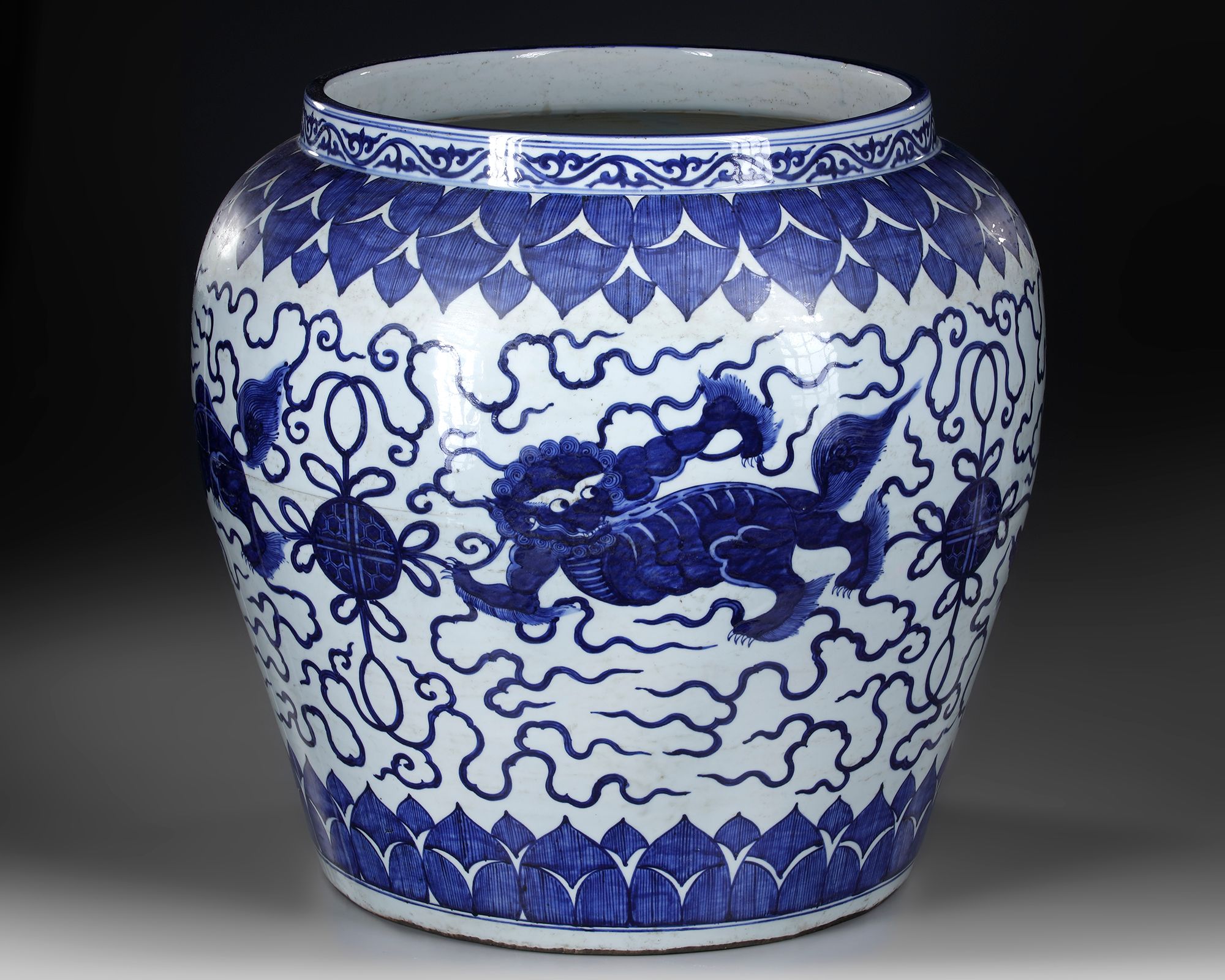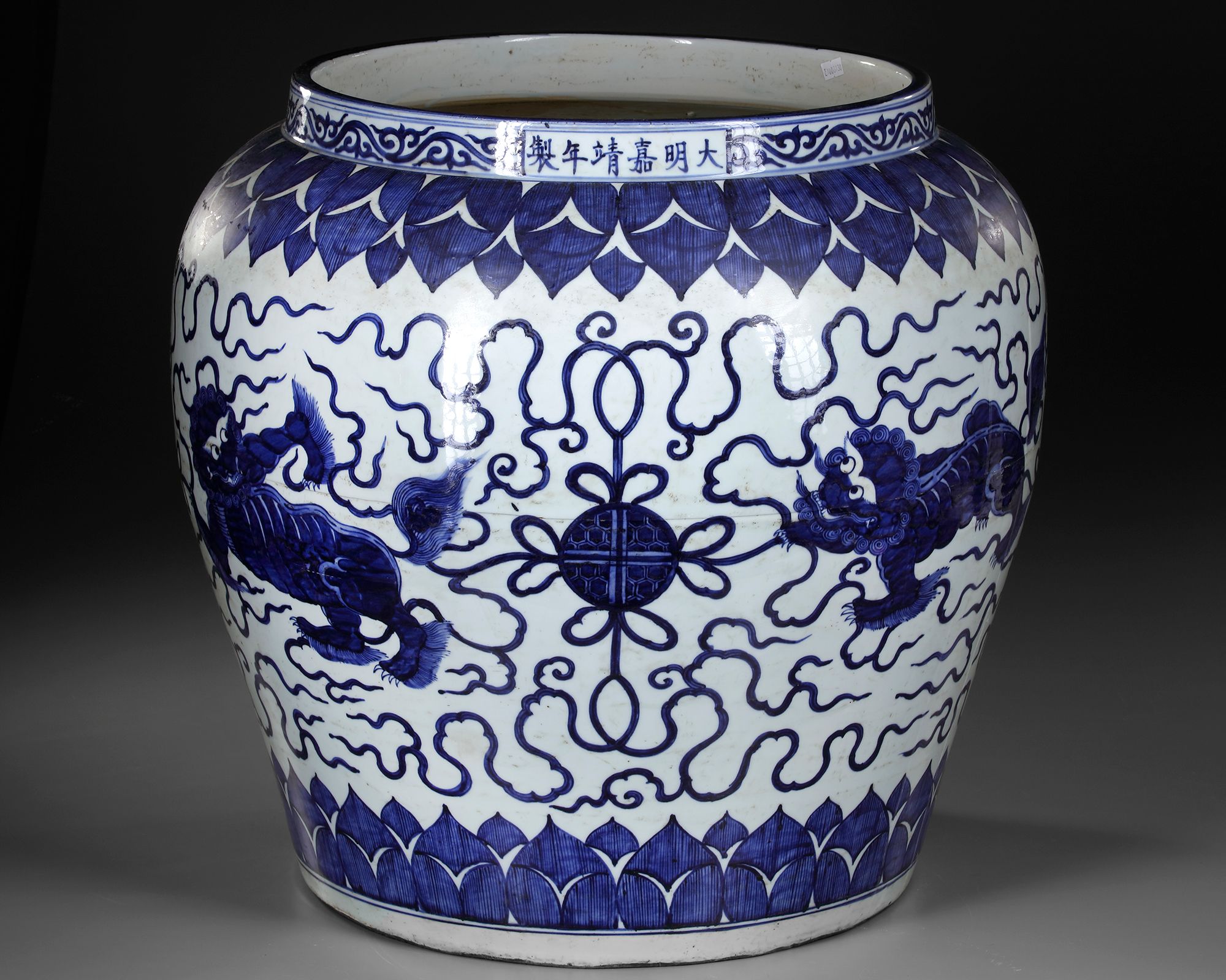A Chinese blue and white pot decorated in cobalt blue with Buddhist Lions with knotted balls amongst clouds, set between two borders of stiff leaves to the shoulder and the base. The rim with a Chinese Jiajing six character mark.