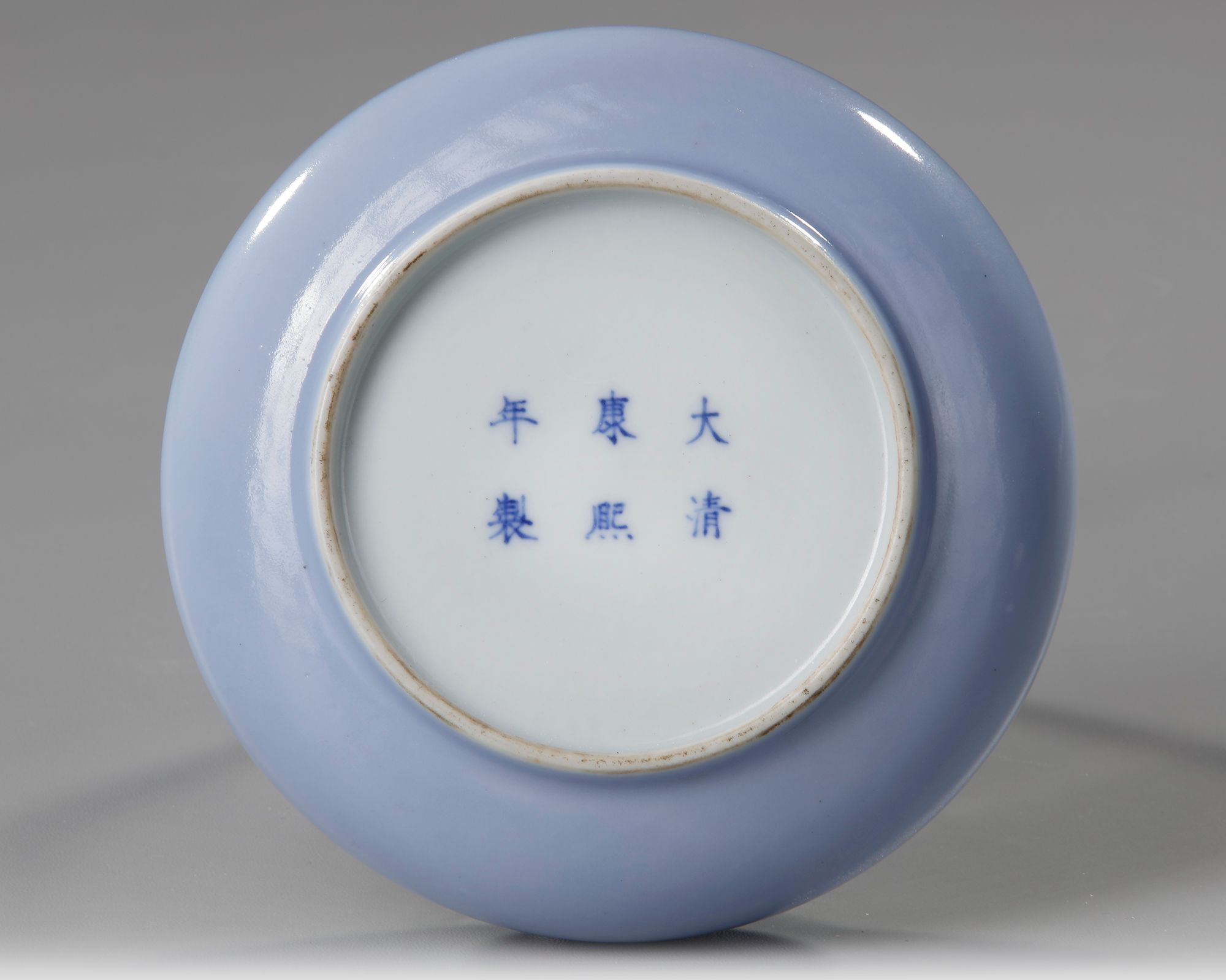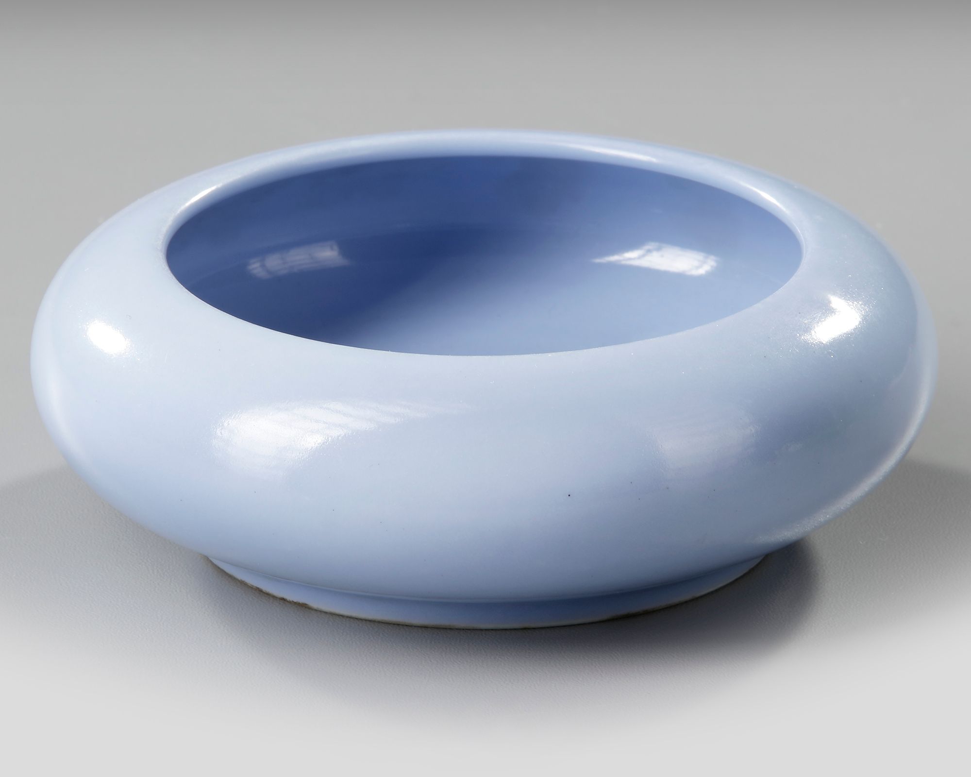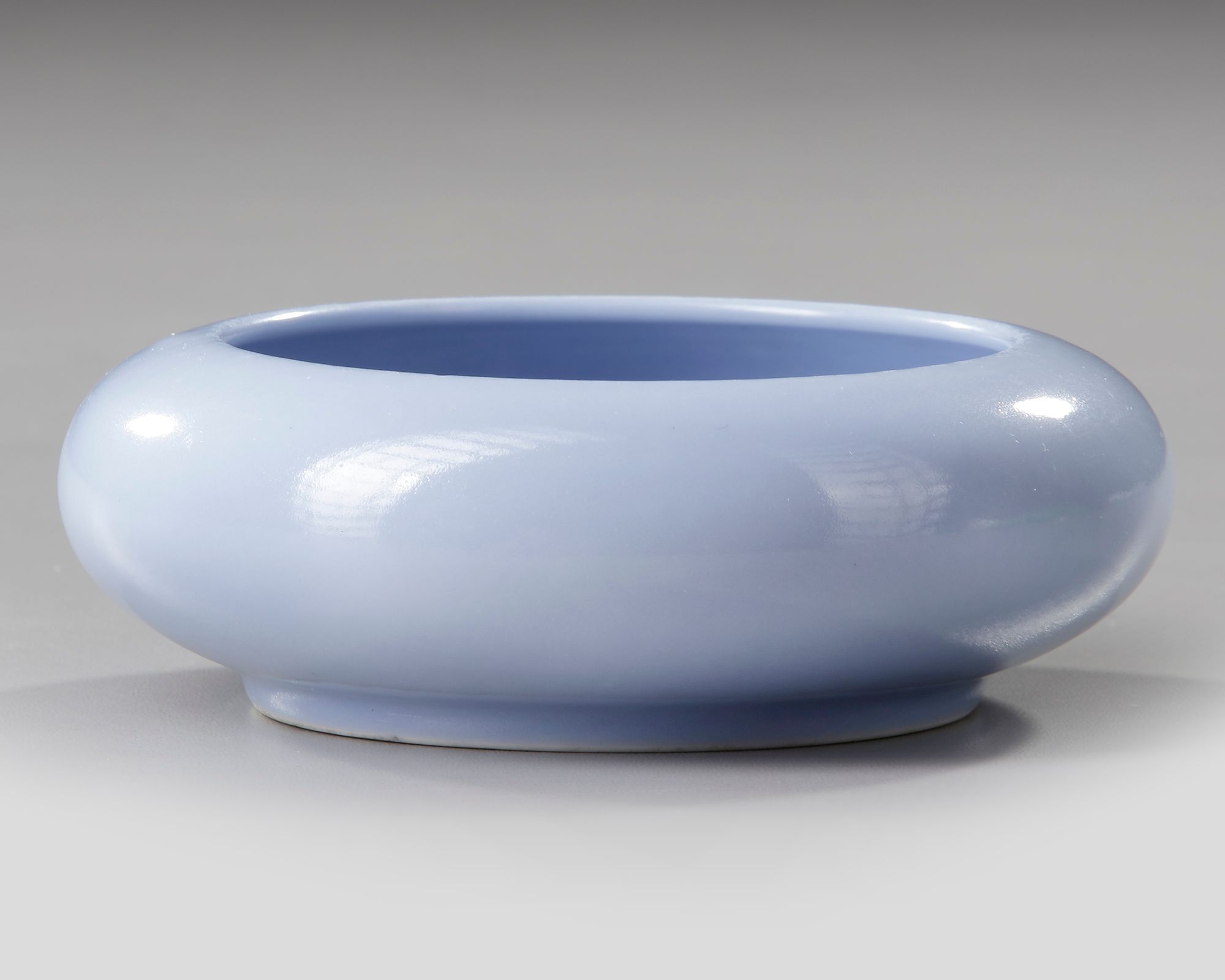 Of compressed circular form, supported on a shallow tapered foot, the rounded sides rising to an incurved rim, covered overall with a pale lavender-blue glaze draining to white at the mouth, the white-glazed base with a six-character mark in underglaze blue.