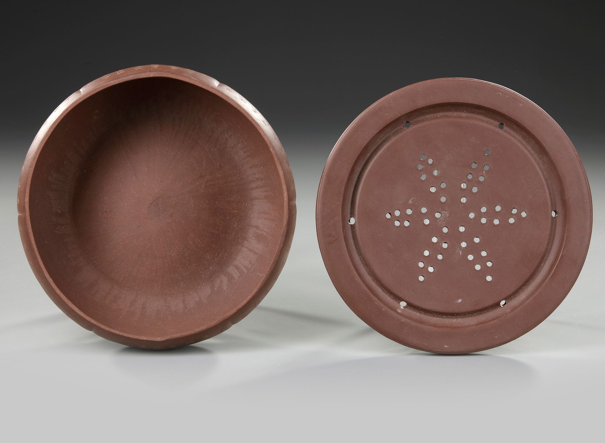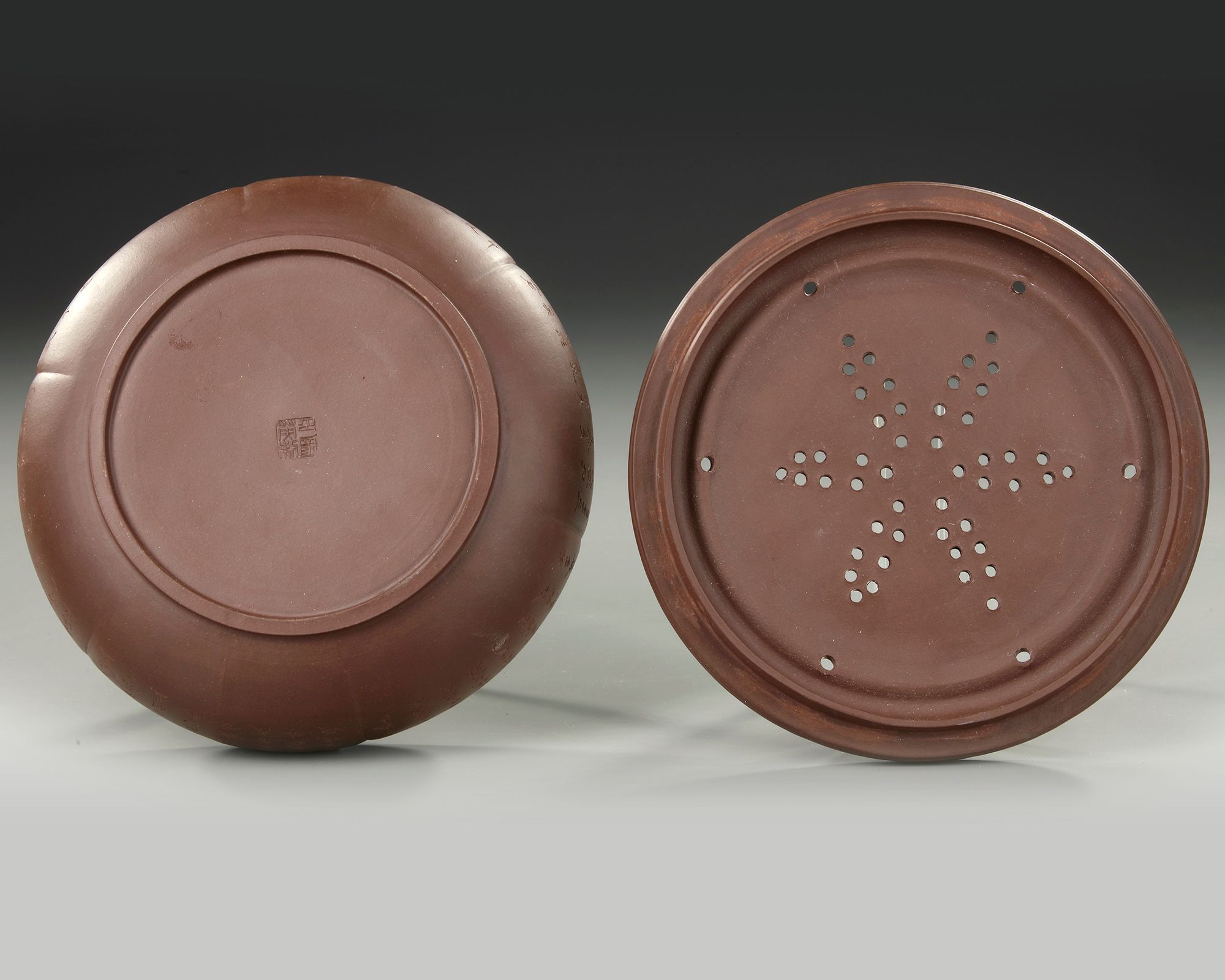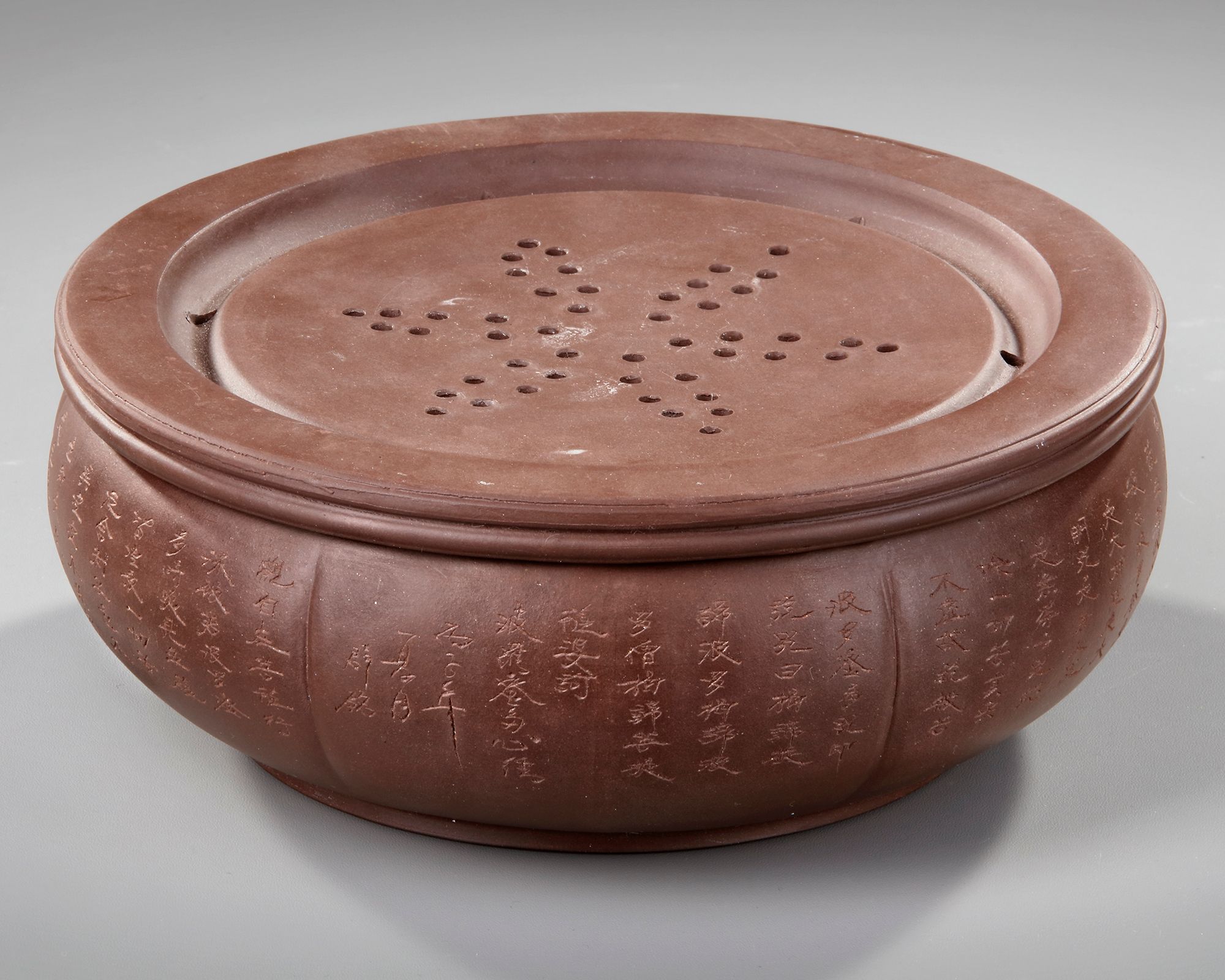 A Chinese yixing lobbed censer with cover. The exterior is incised with a poetic inscription. Diameter 21.2 cm. Height 8.4 cm.