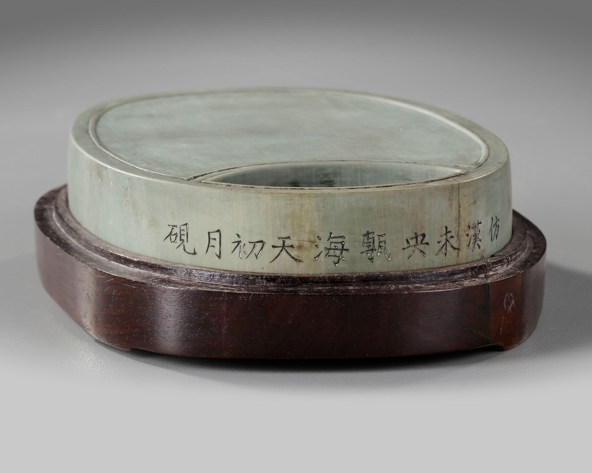 A Chinese inkstone carved from green Duanxi-stone found in South-East Gaoyao County in Guangdong Province. 19.5 by 9.5 by 2.5 cm.