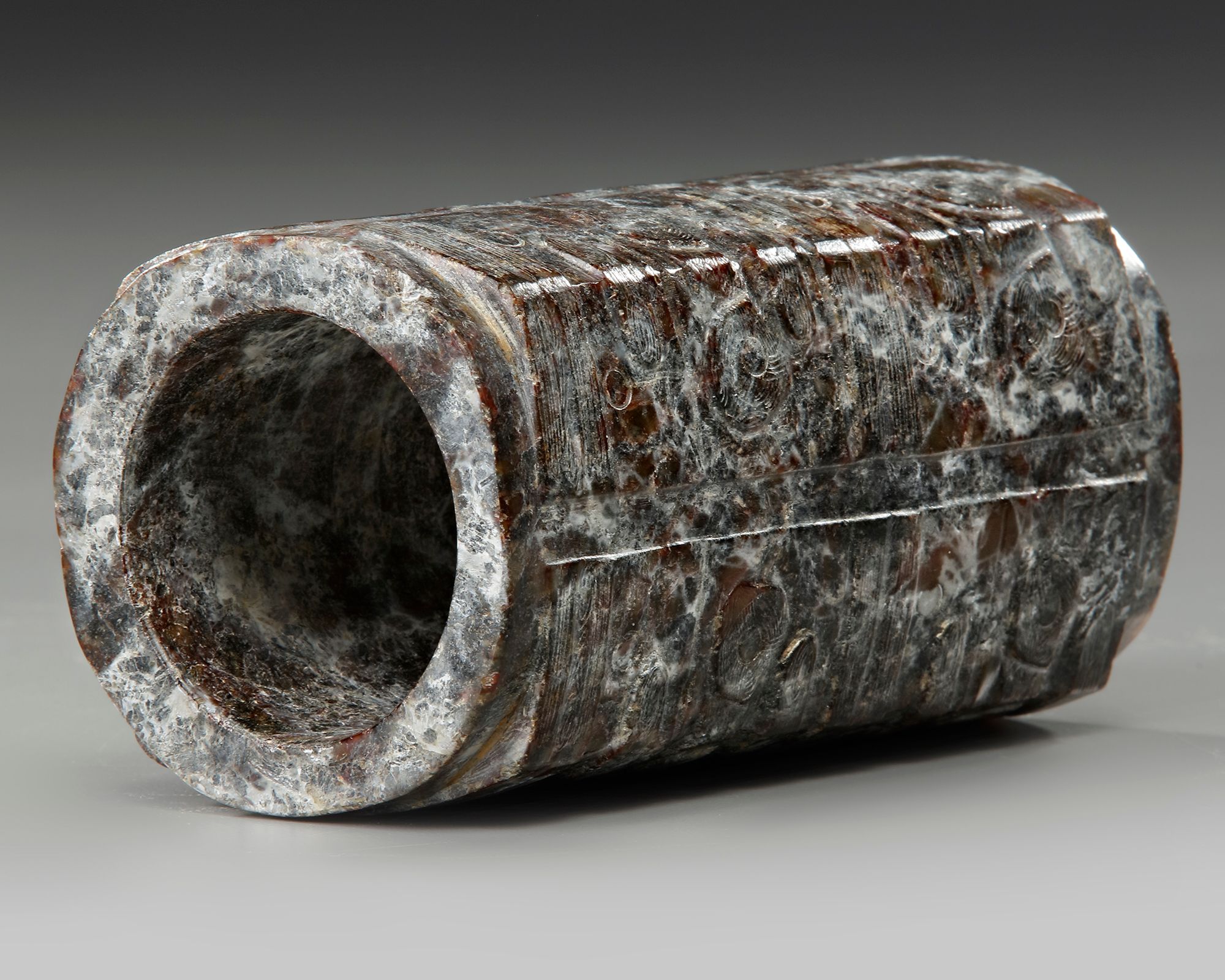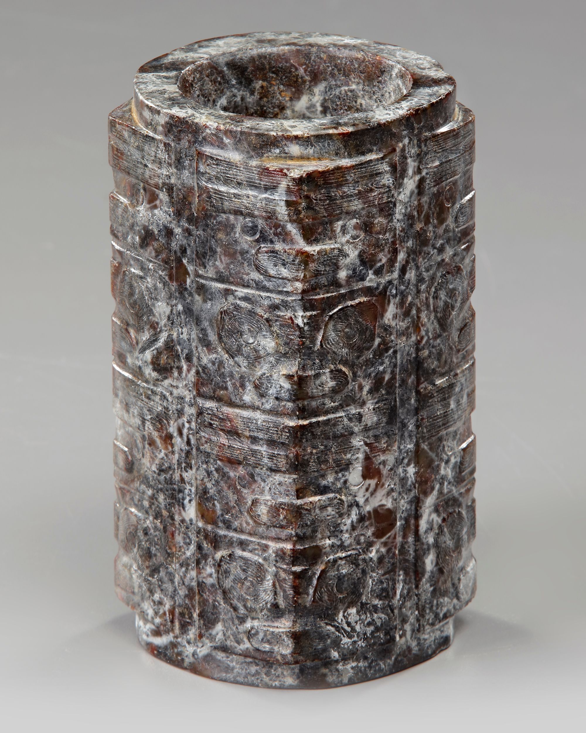 The thick-walled vessel of square-sectioned tubular form, the sides divided into five registers, each carved with a stylised mask formed by raised bands and incised details, the stone of rich black colour suffused with silvery-white flecks.