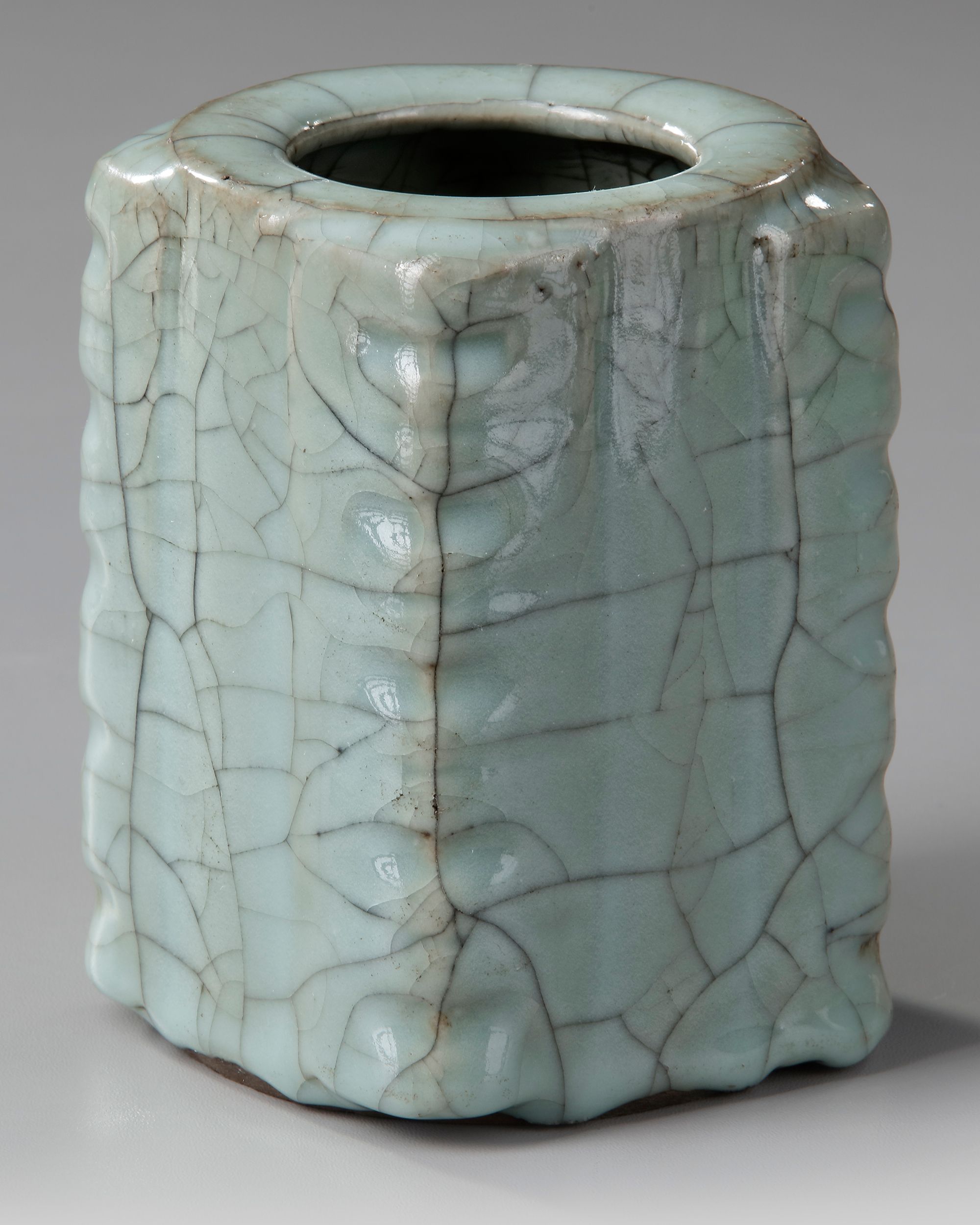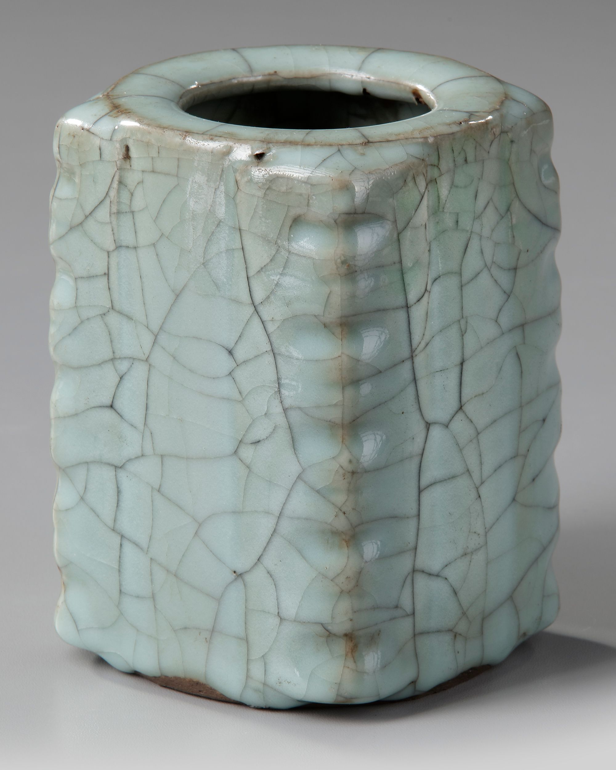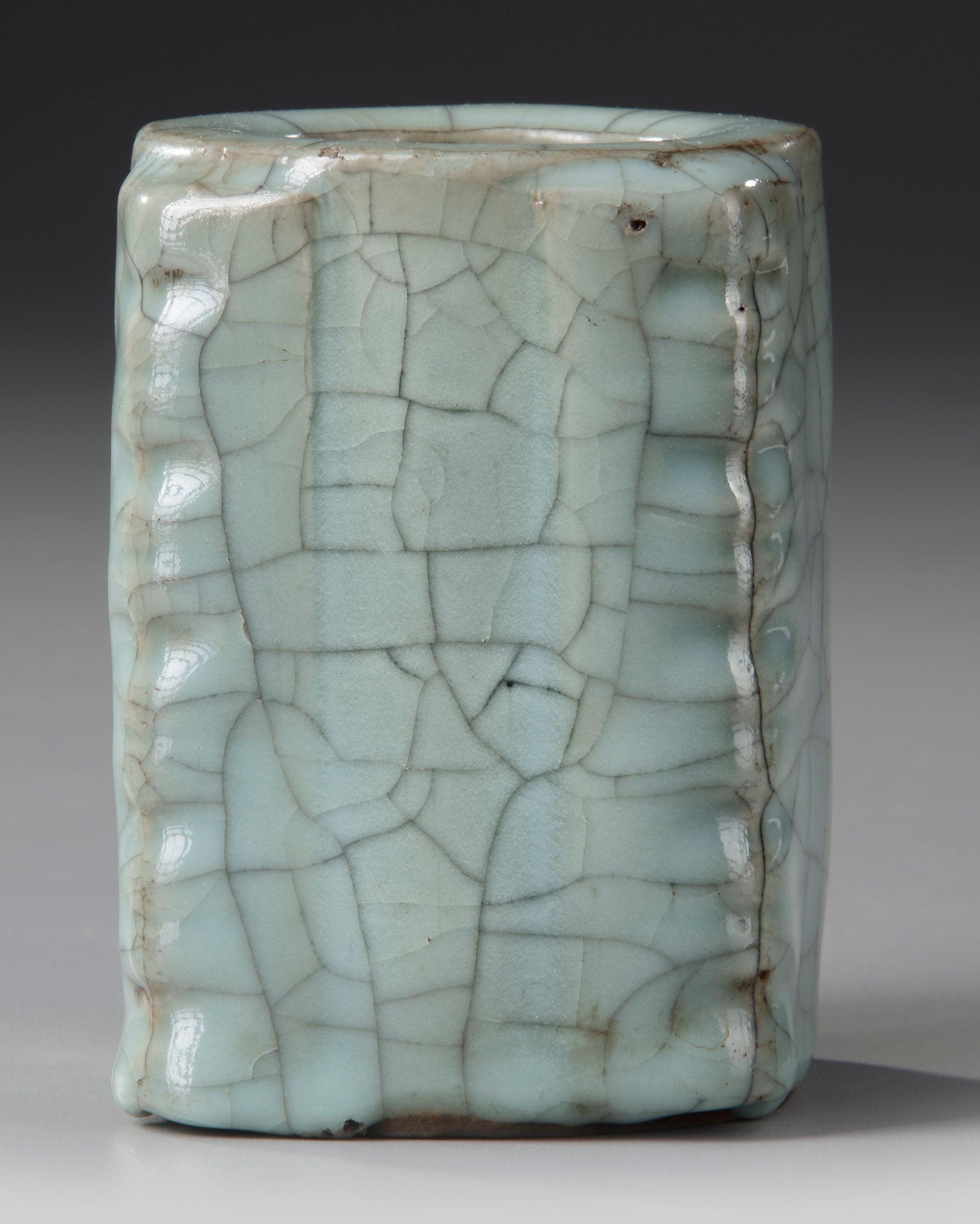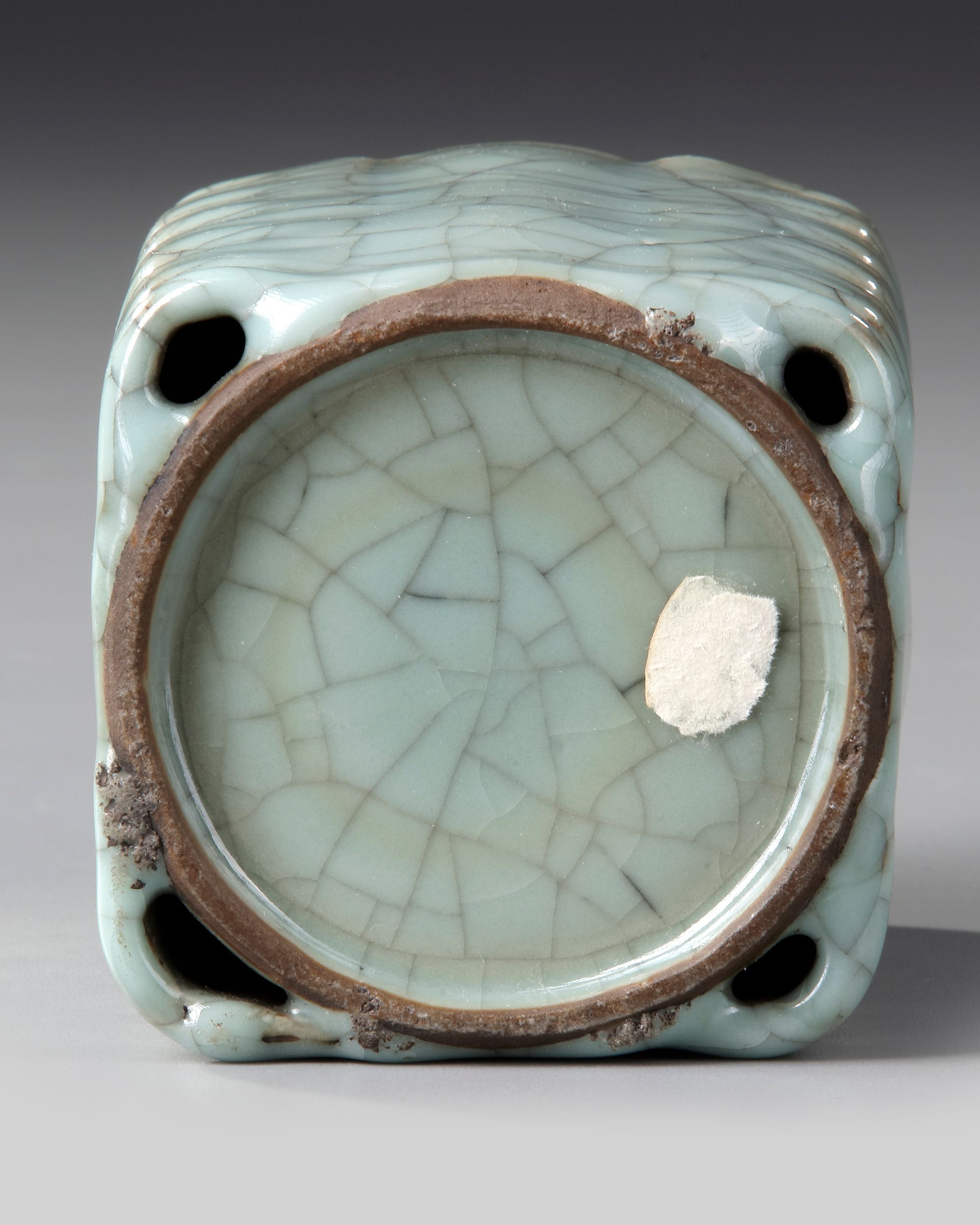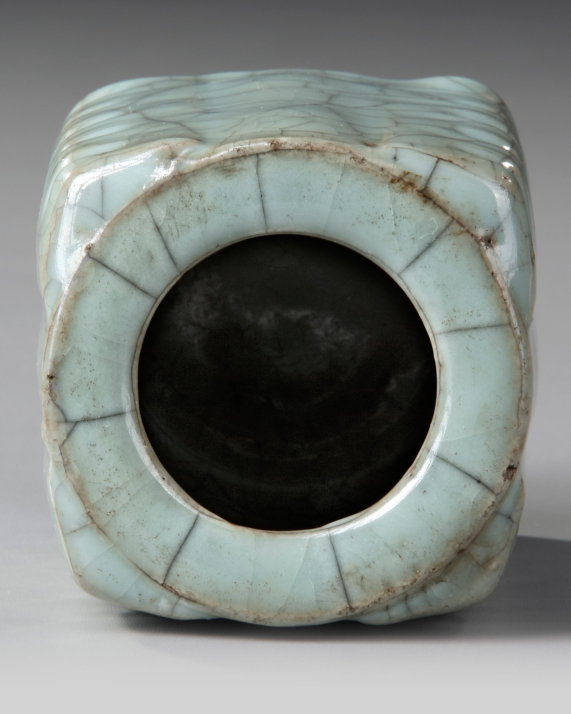 The heavily-potted vase is moulded on the edges of the rectangular body with evenly-spaced decoration in imitation of a jade cong. The vase is covered with a crackled olive-green glaze.