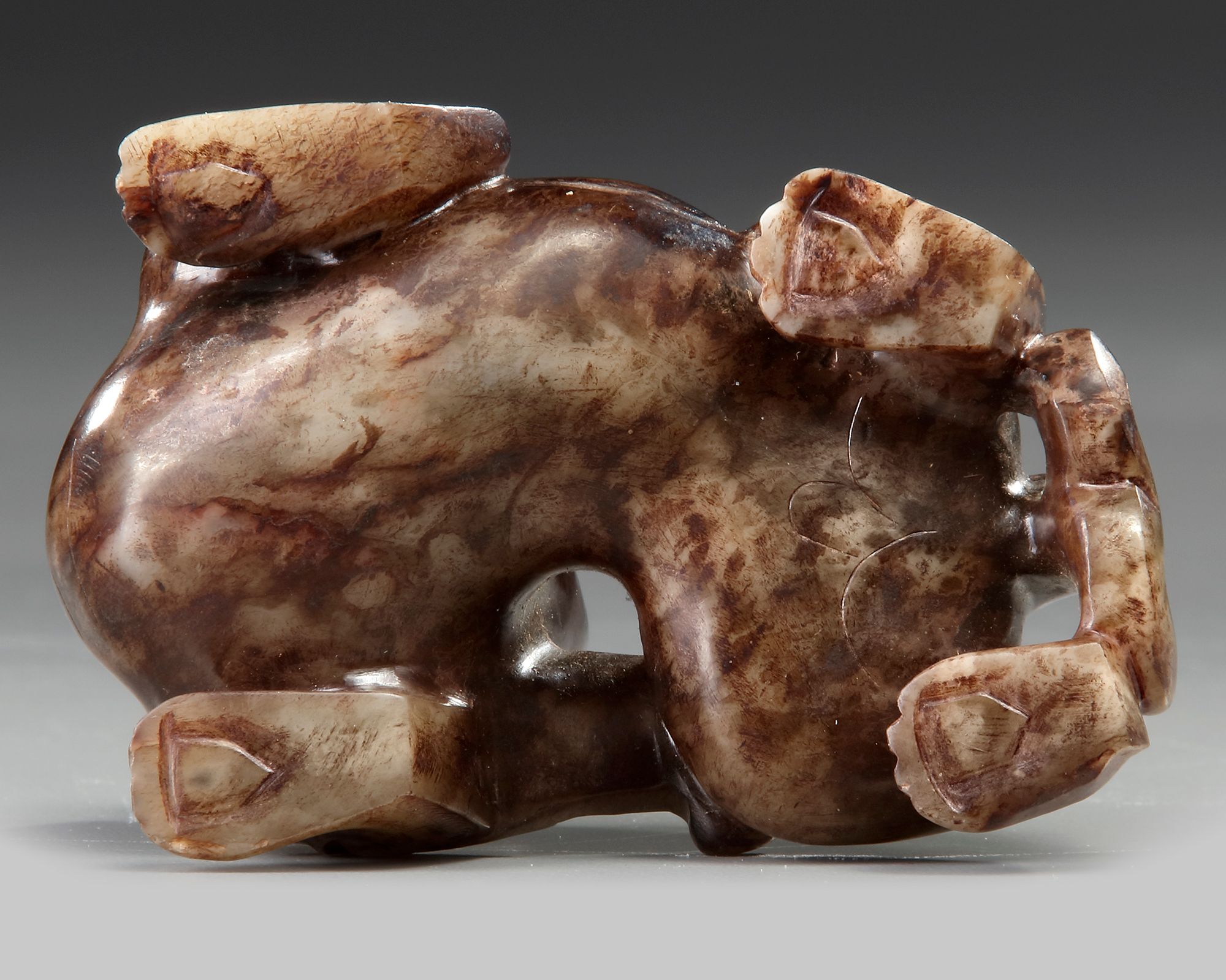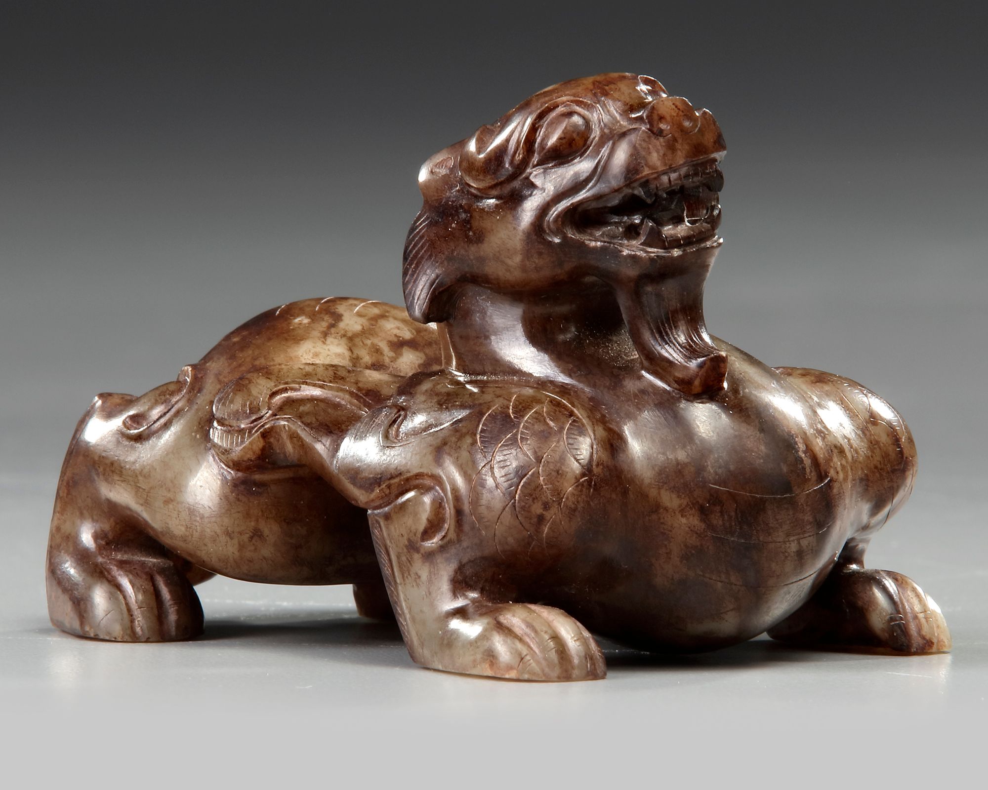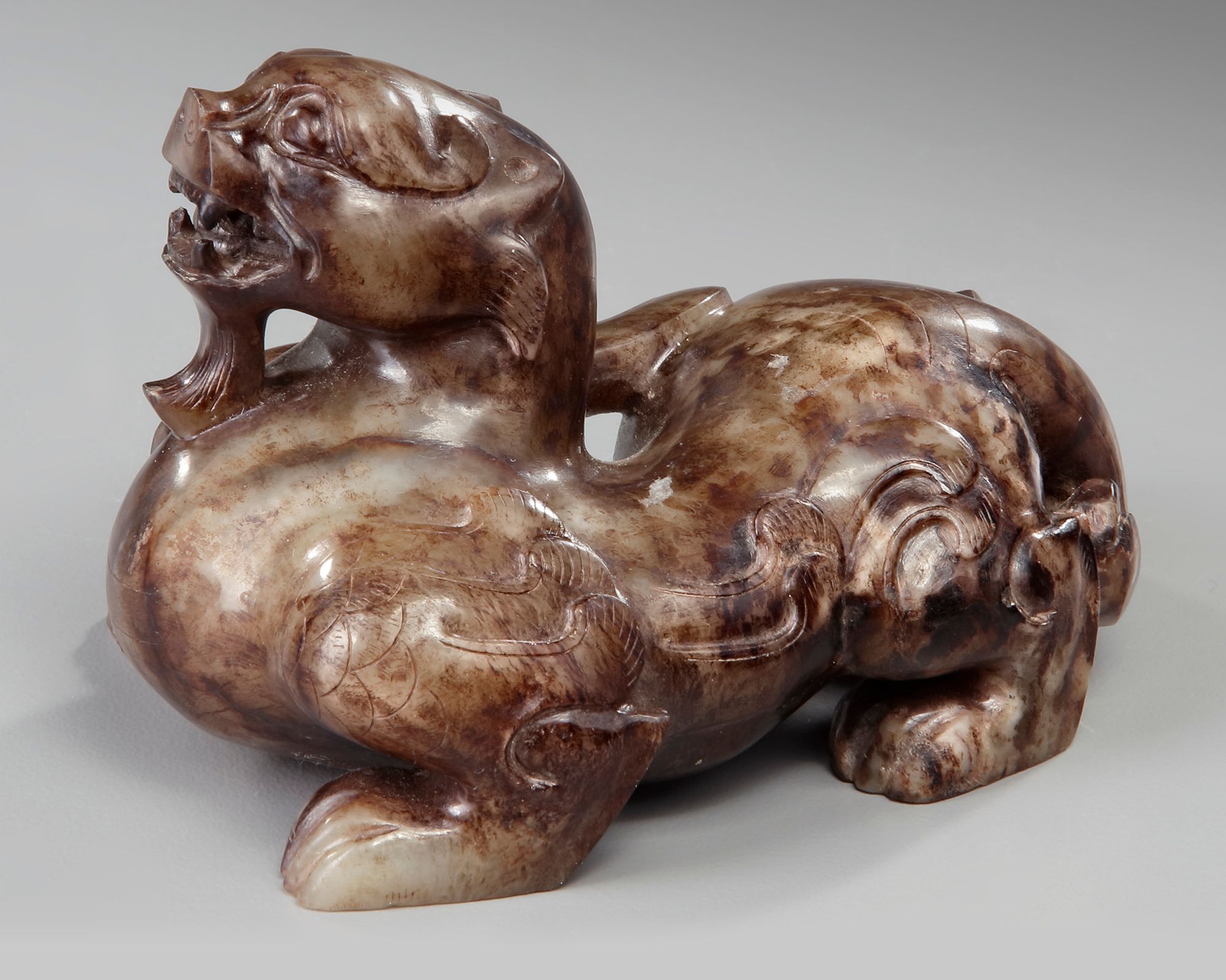Carved with wings issuing from the muscular front legs with a bifurcated tail, the beast's head with opened jaws depicting a ferocious facial expression framed by beard, the yellowish white stone with calcified opaque brown areas.