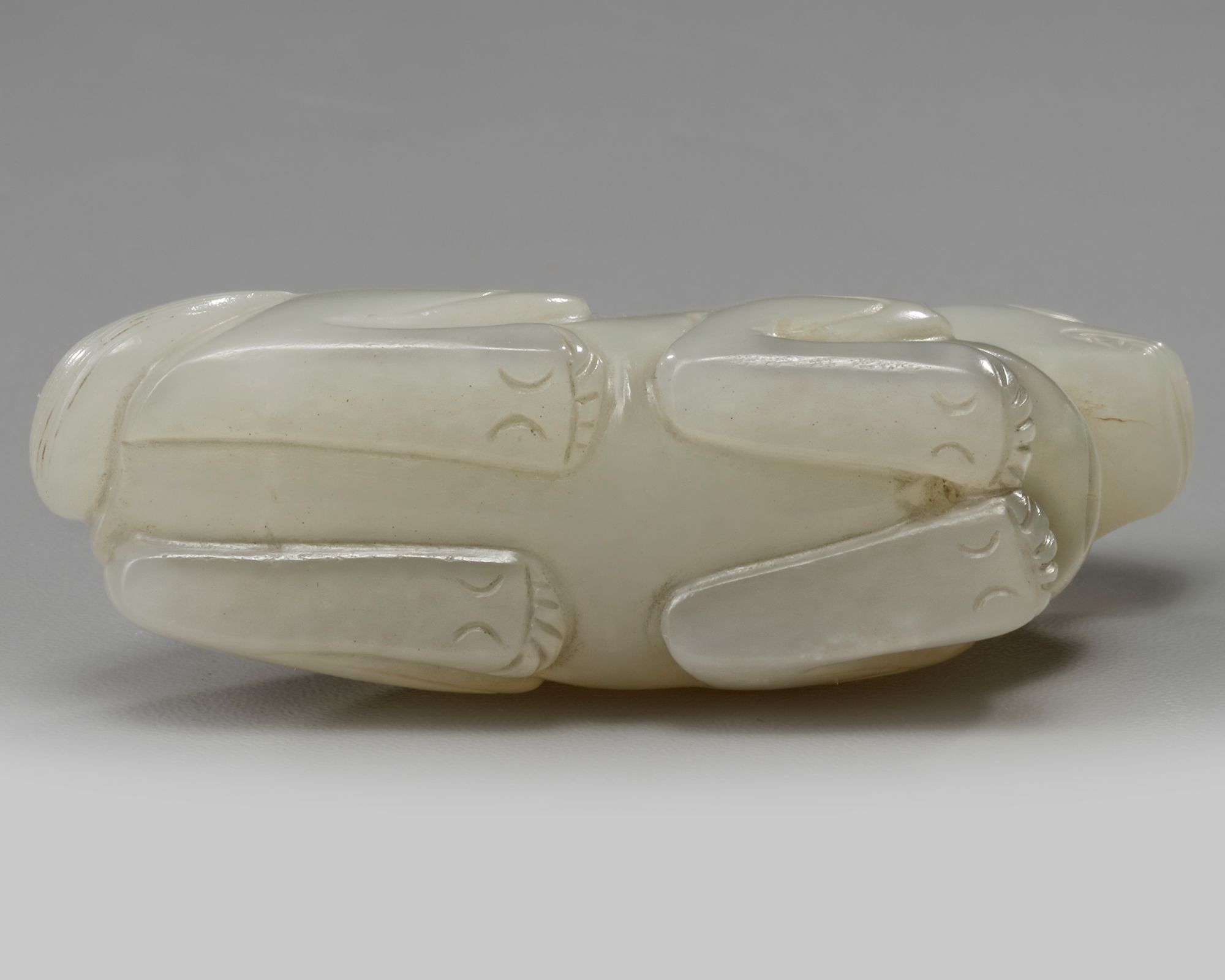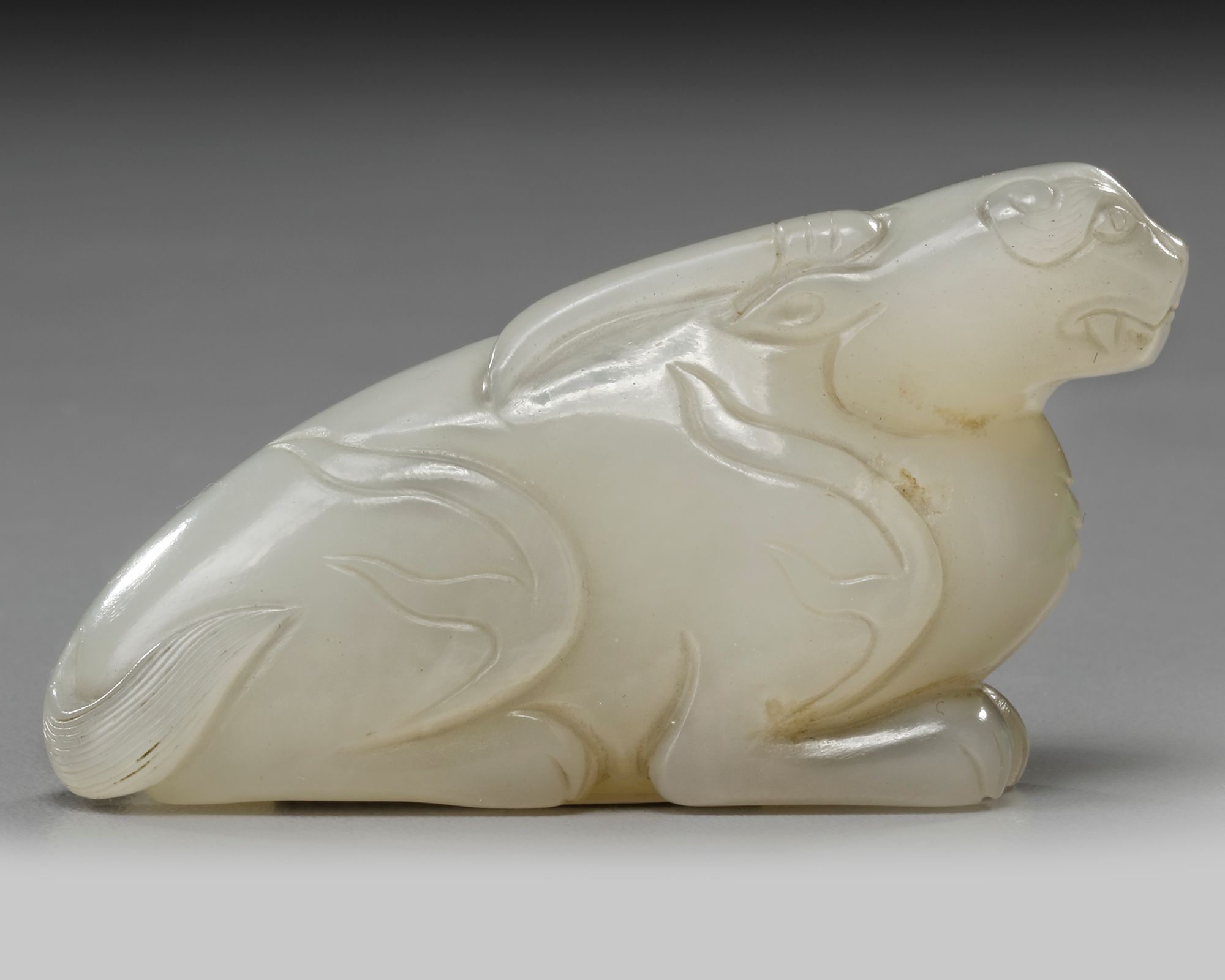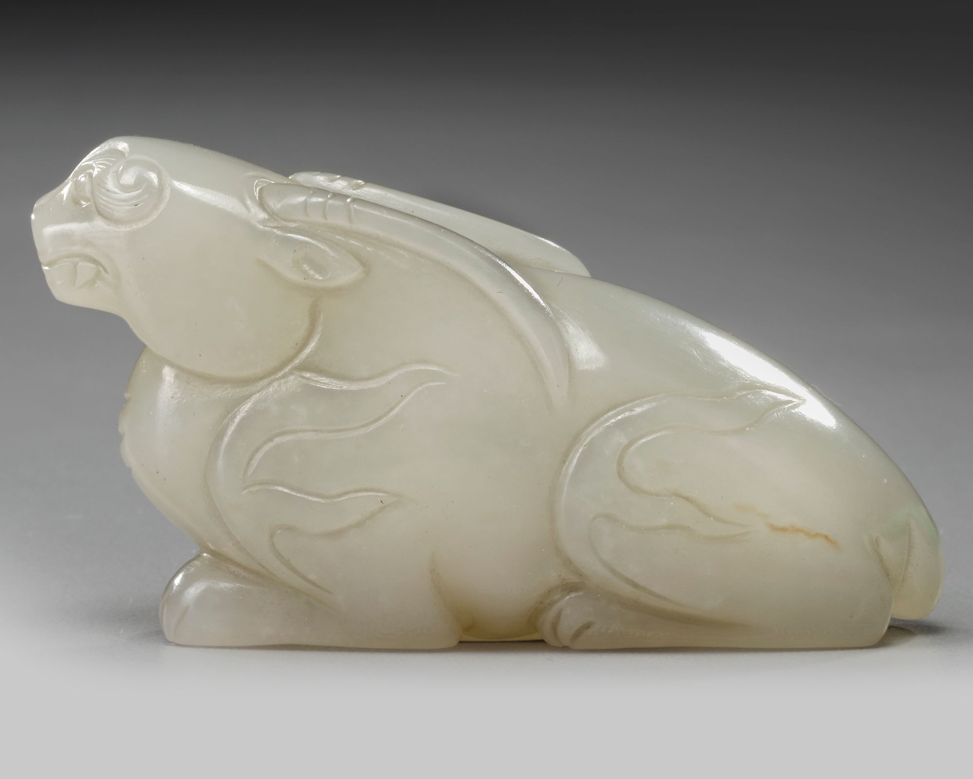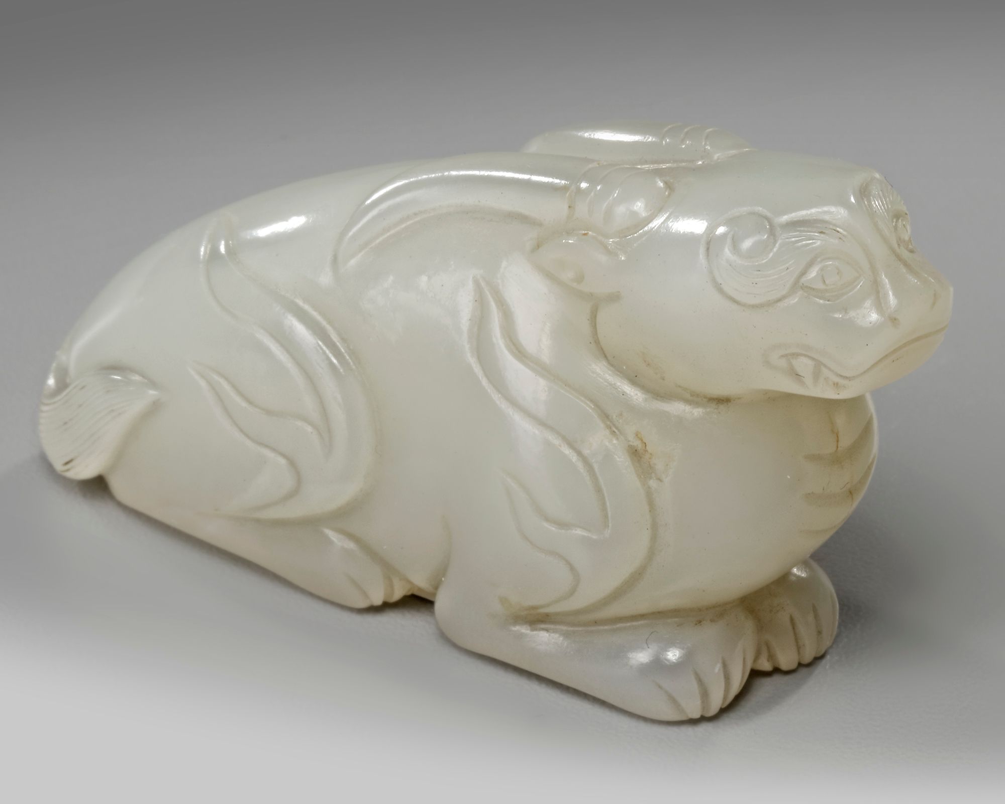 A Chinese carving of mythical animal with antlers and a small tail, carved in a recumbent position with its legs tucked under its body.