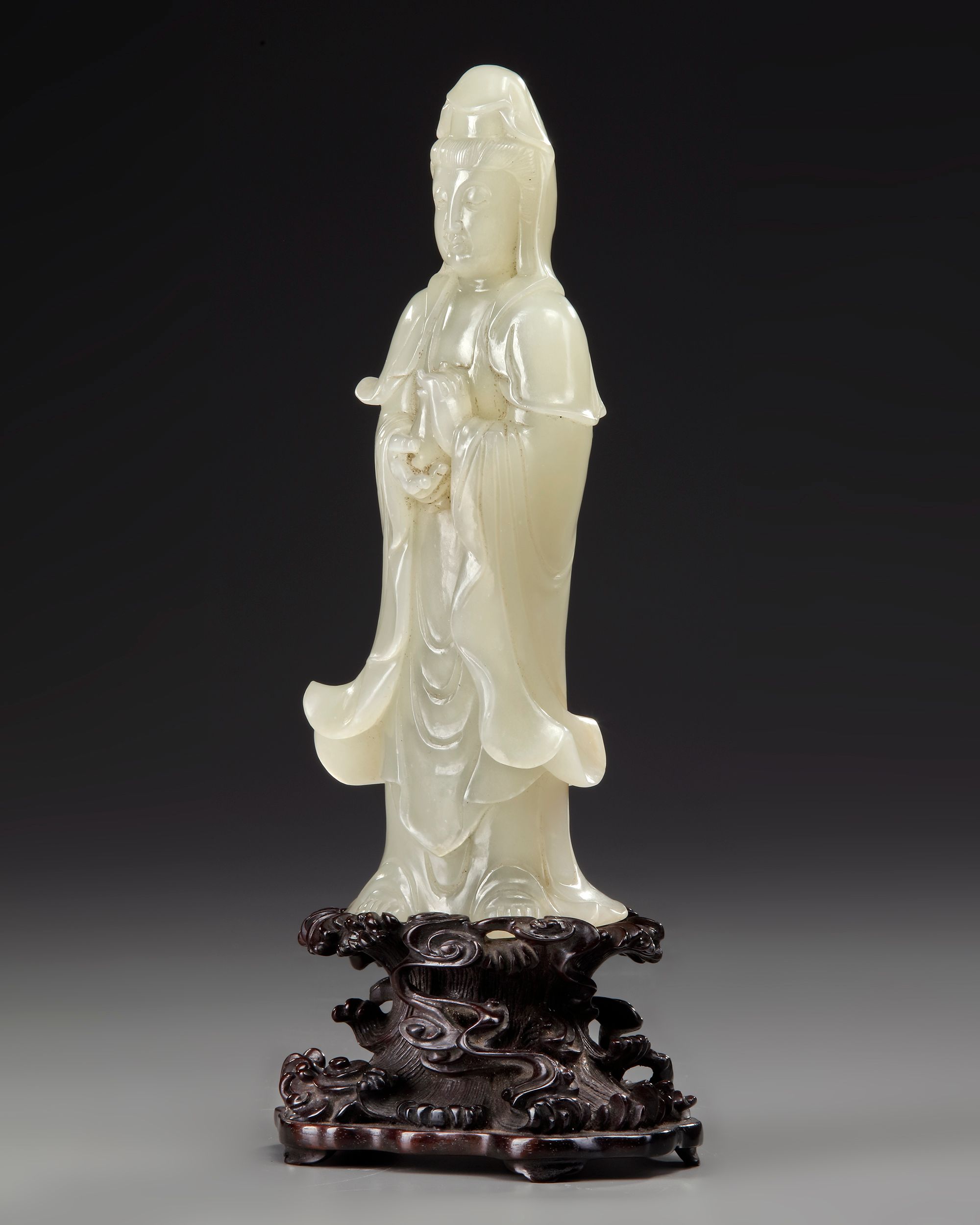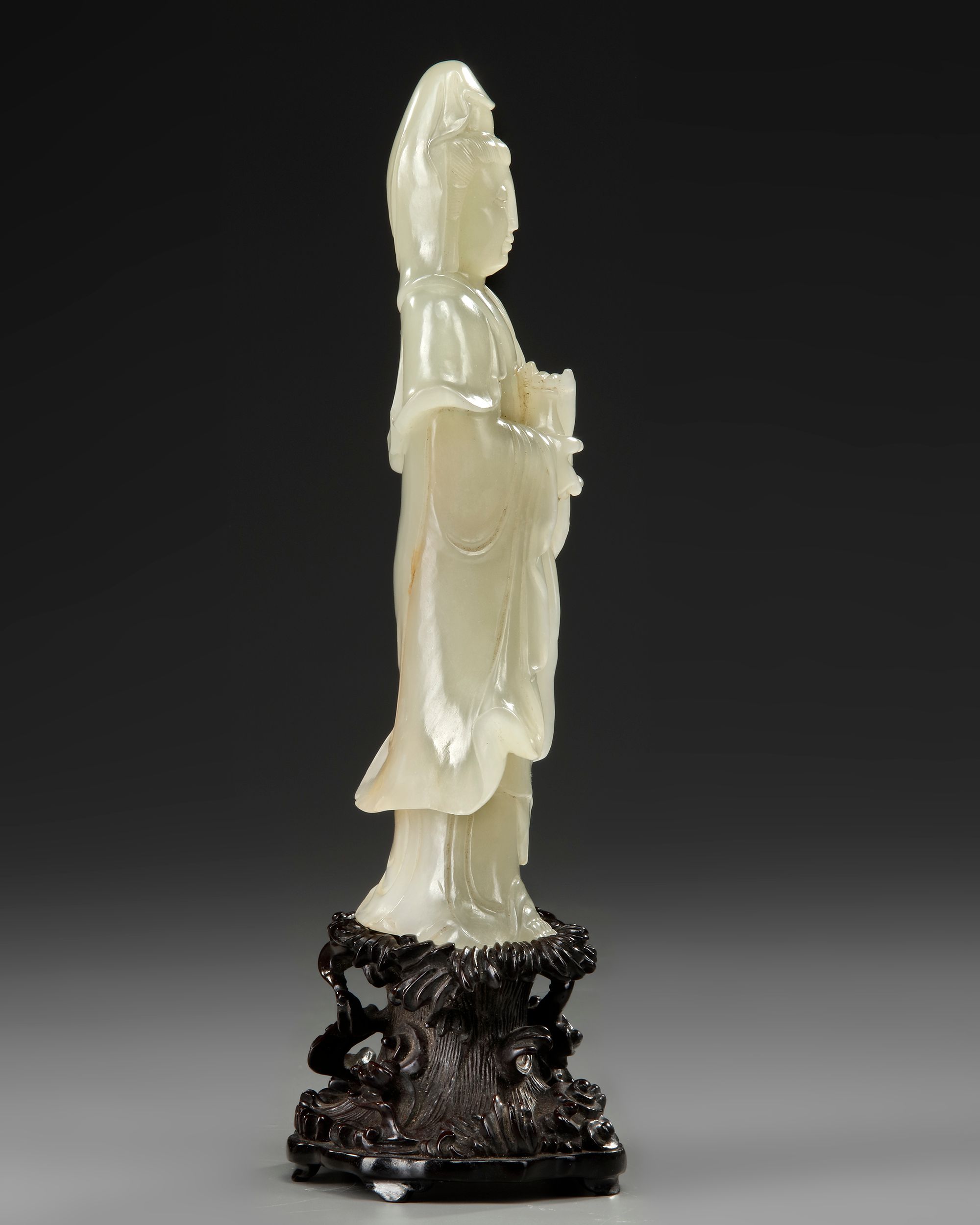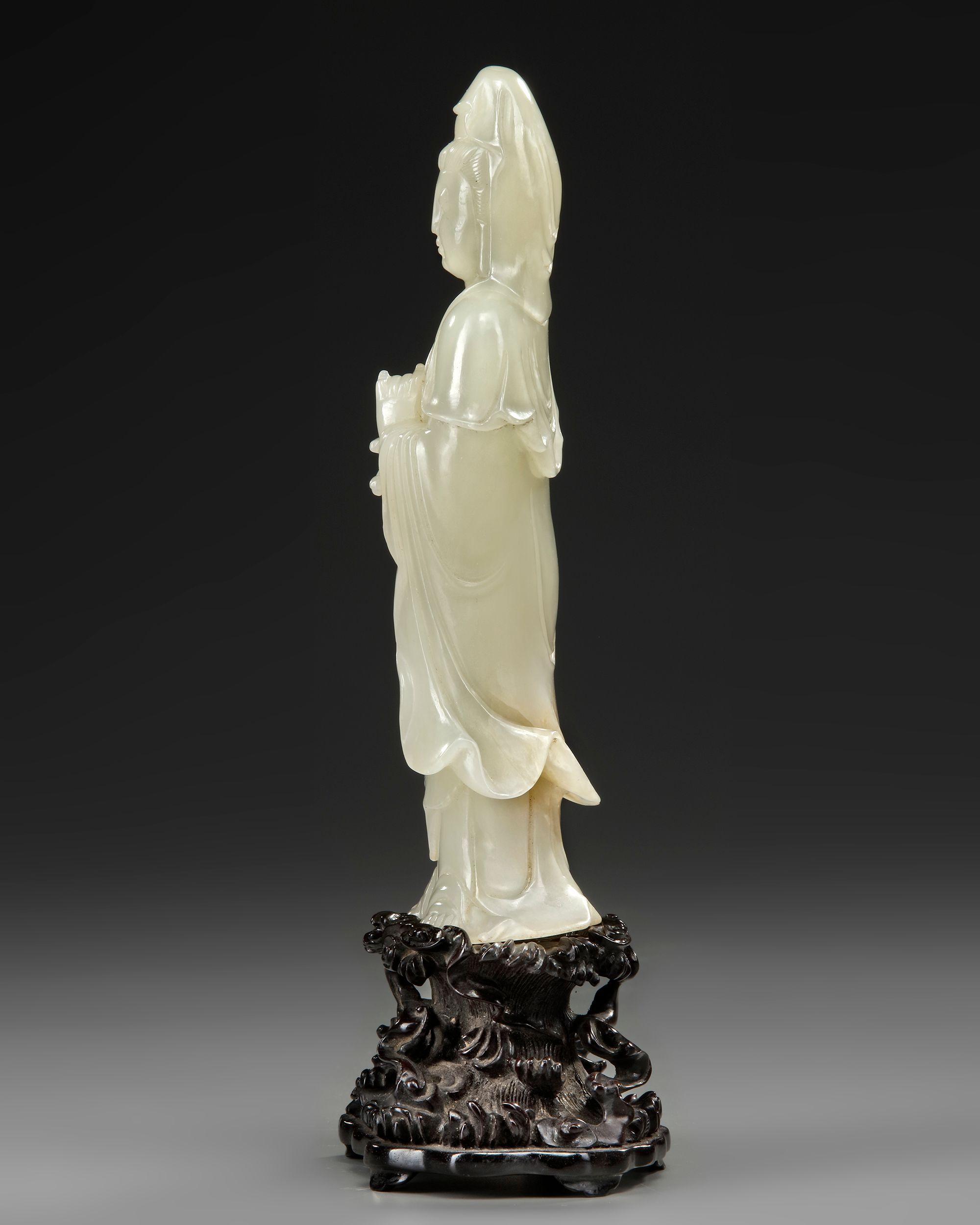 The bodhisattva is carved standing dressed in long layered robes, her right hand holding a vase. Her face has a serene expression and her hair is arranged in long tresses which trail onto her shoulders.