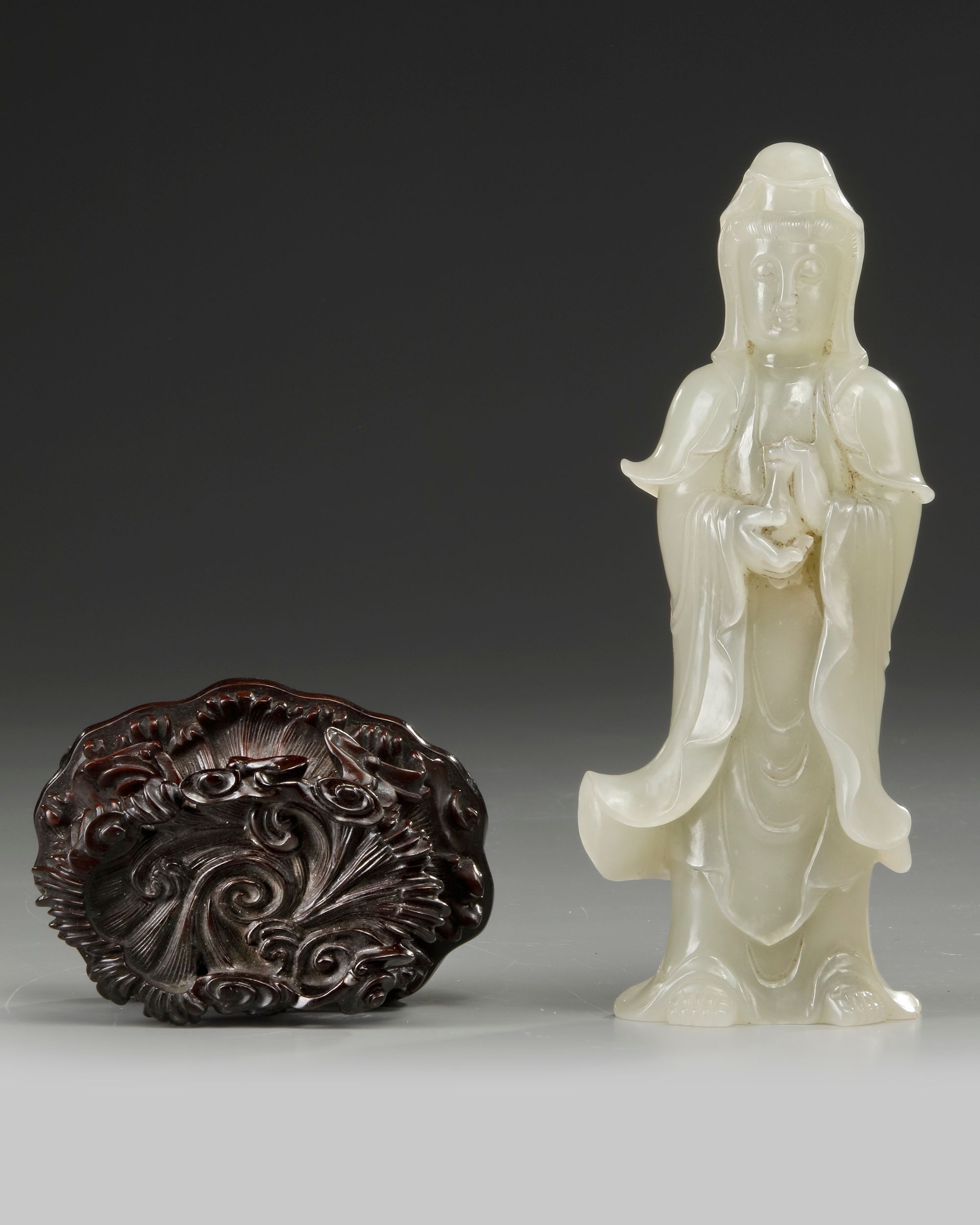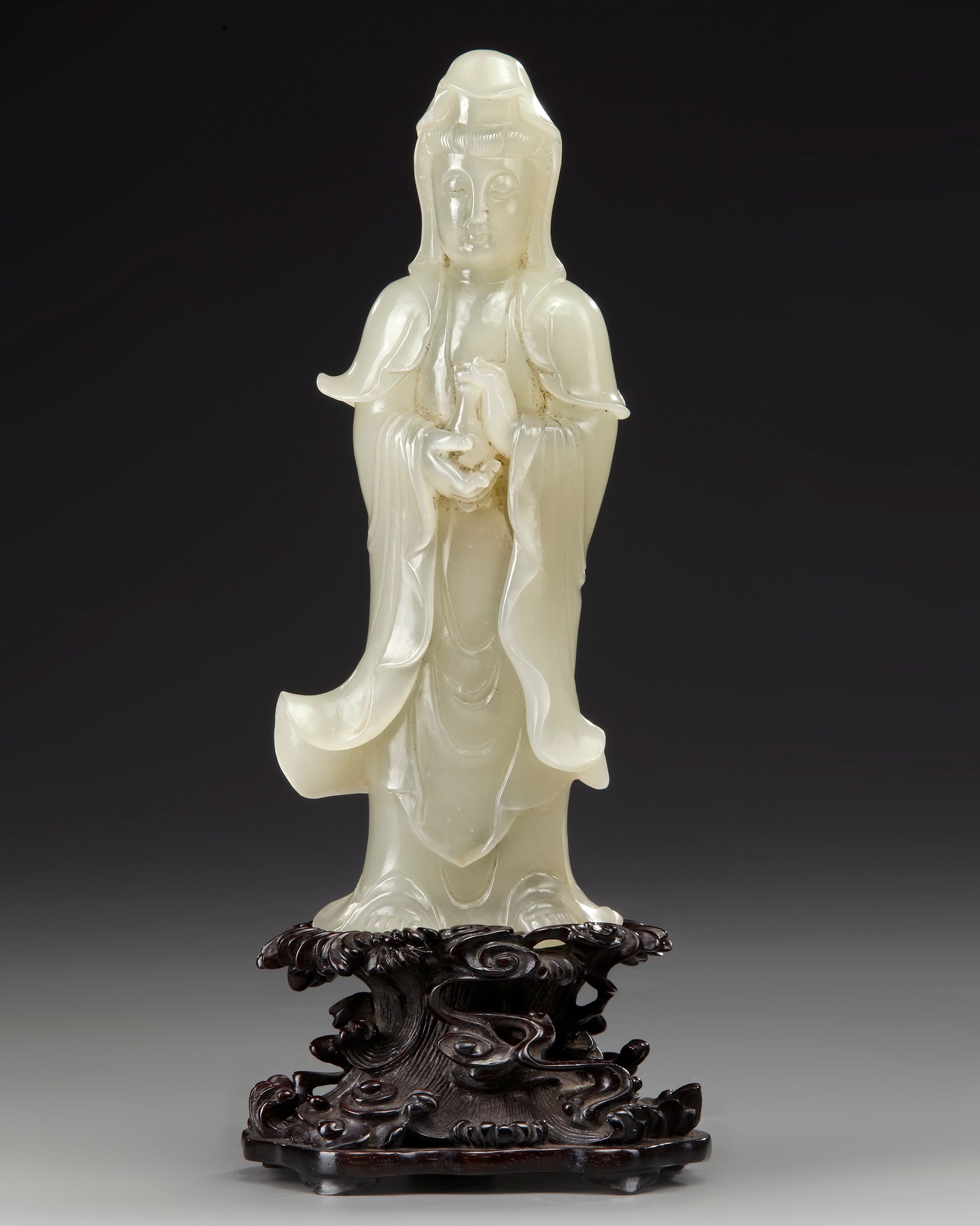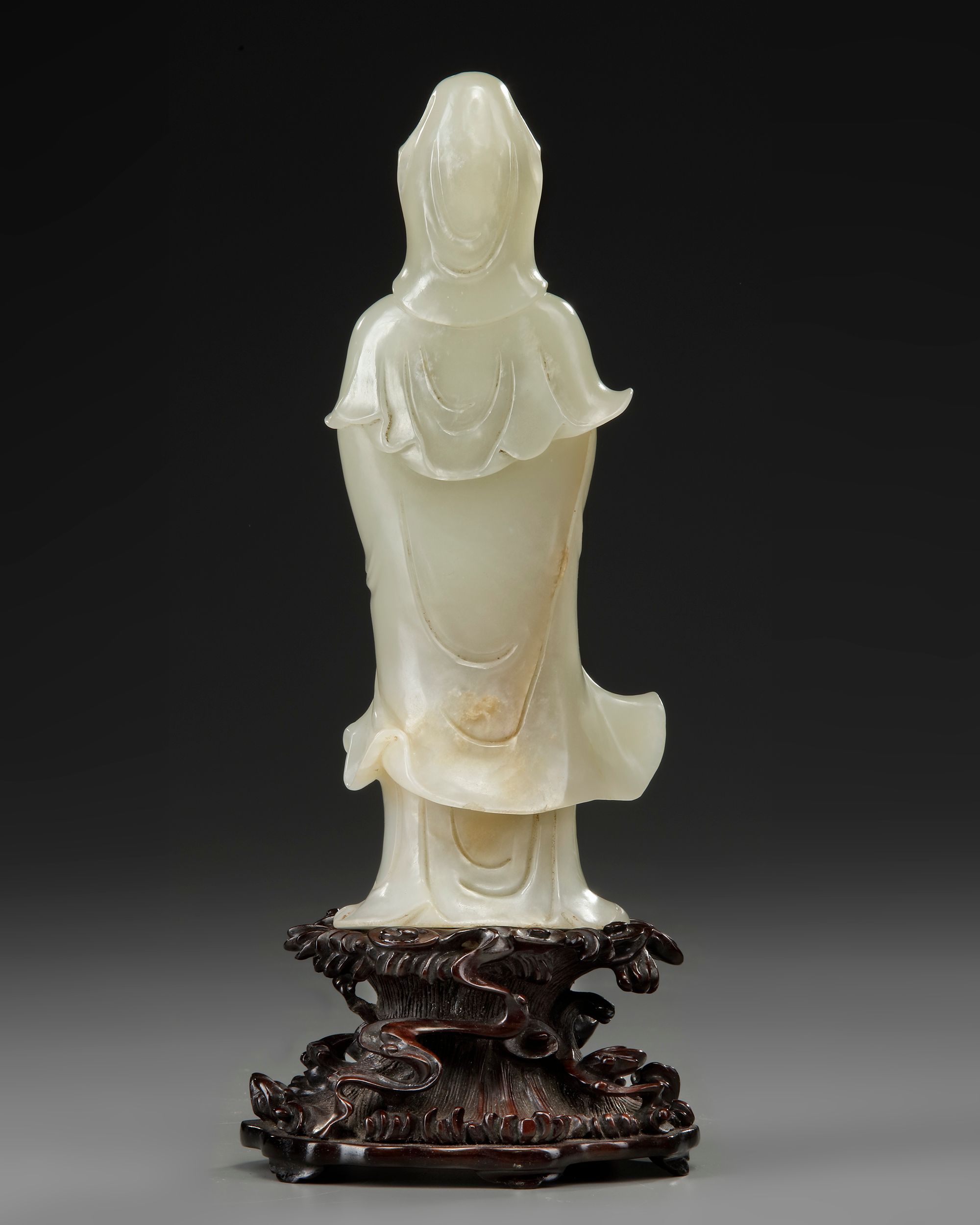 The bodhisattva is carved standing dressed in long layered robes, her right hand holding a vase. Her face has a serene expression and her hair is arranged in long tresses which trail onto her shoulders.