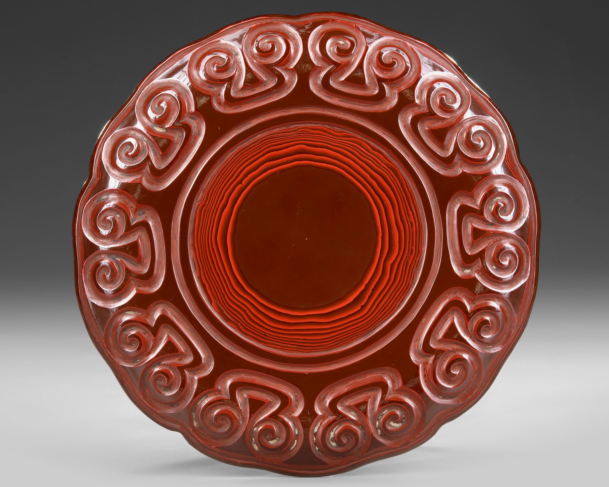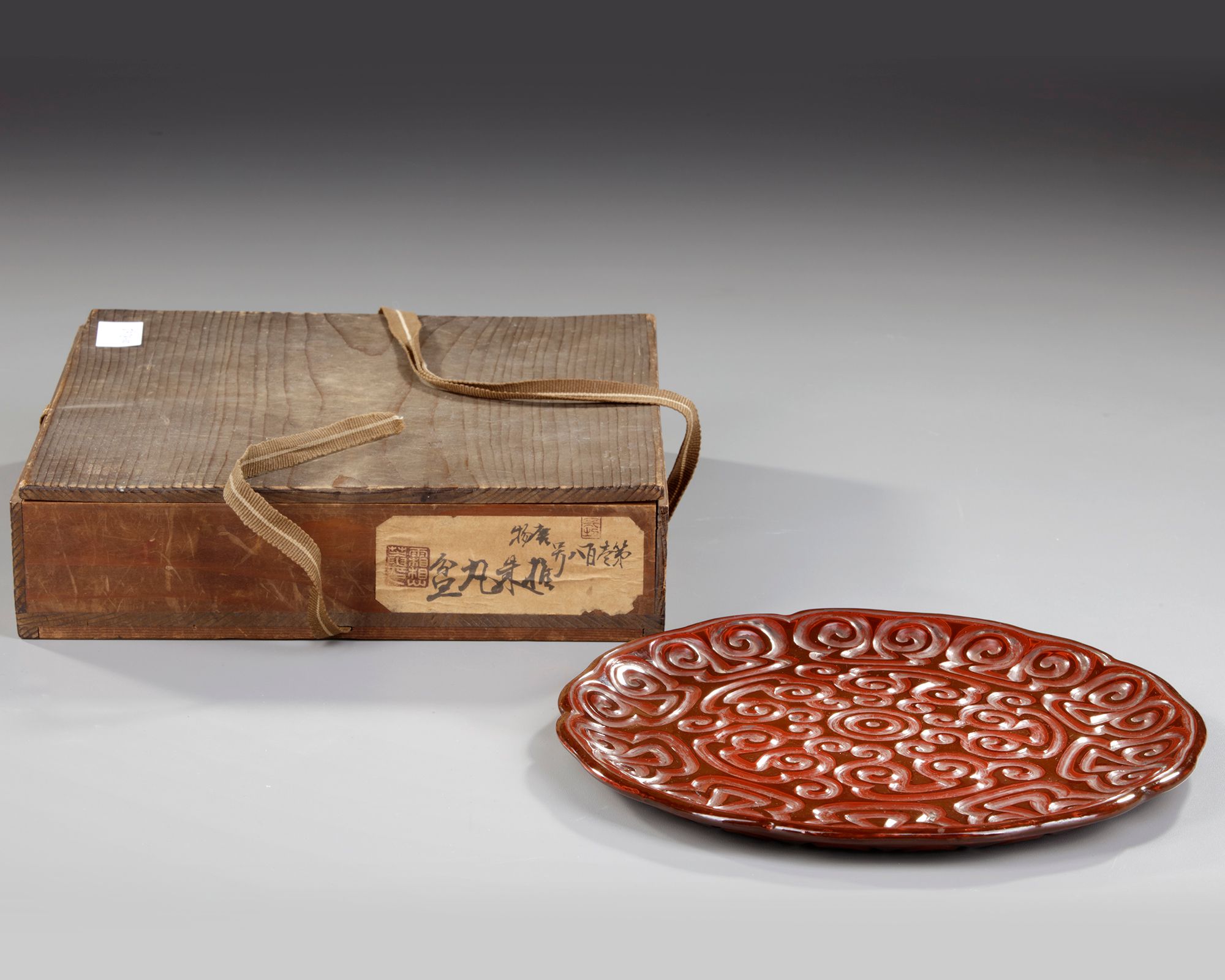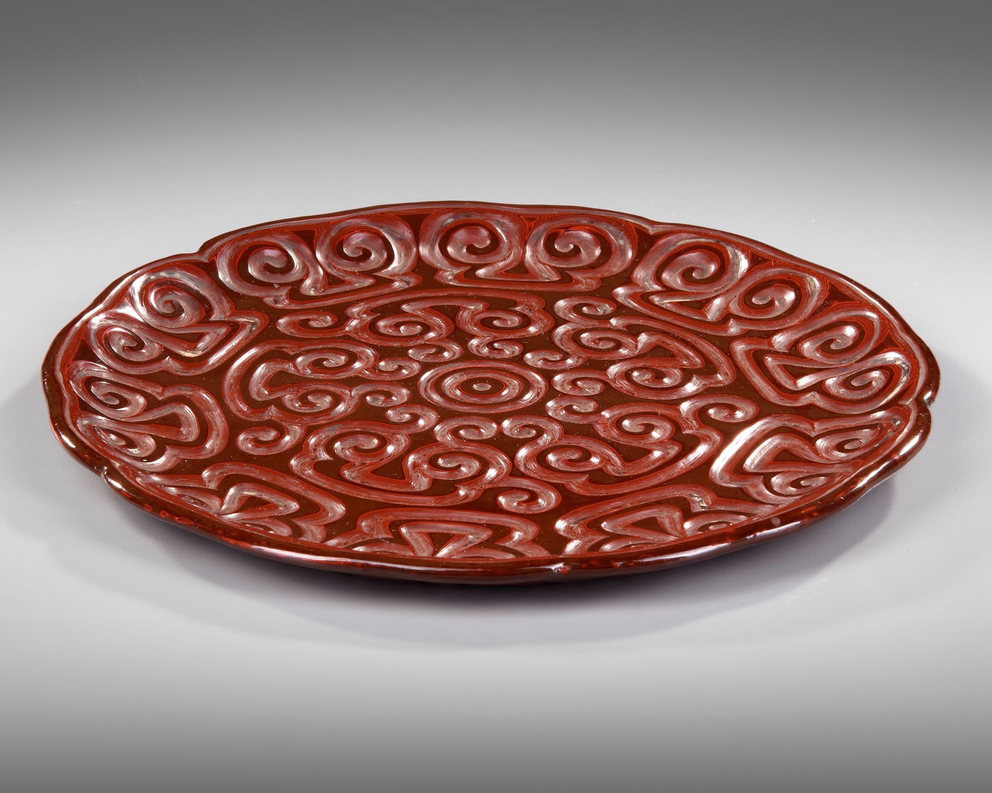 A Chinese cinnabar dish, finely carved central with two small circles surrounded by two bands of ruyi heads. Diameter 23 cm.