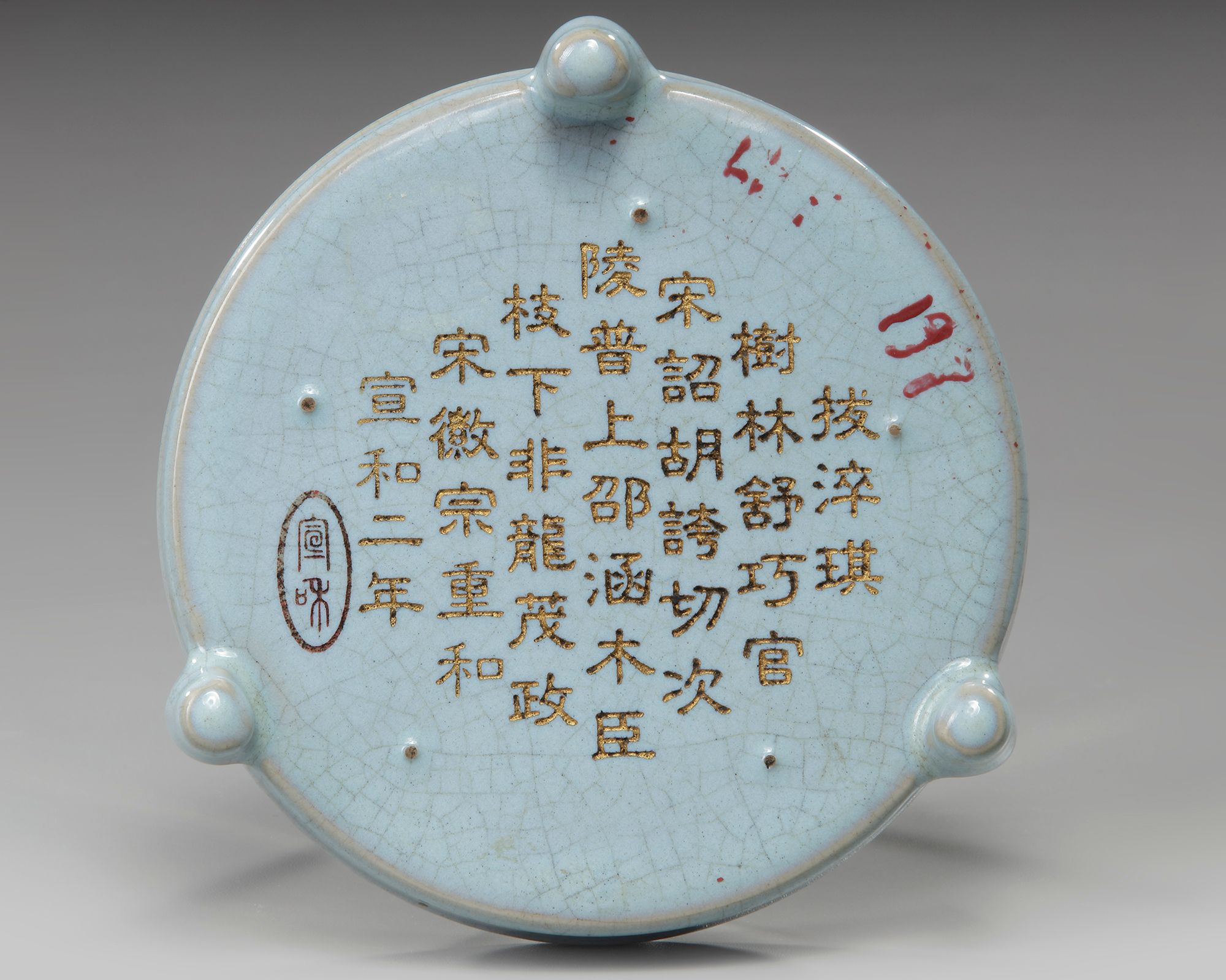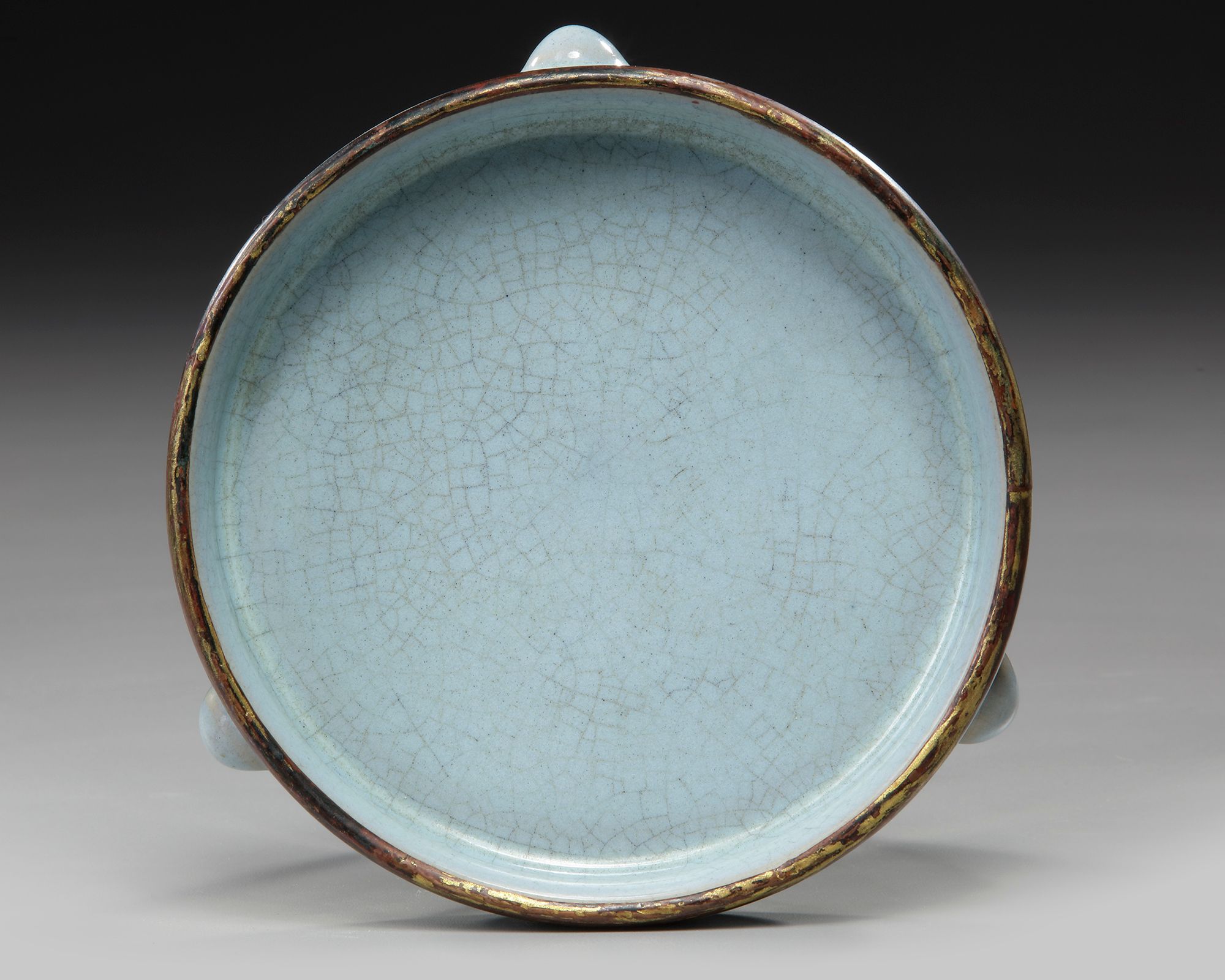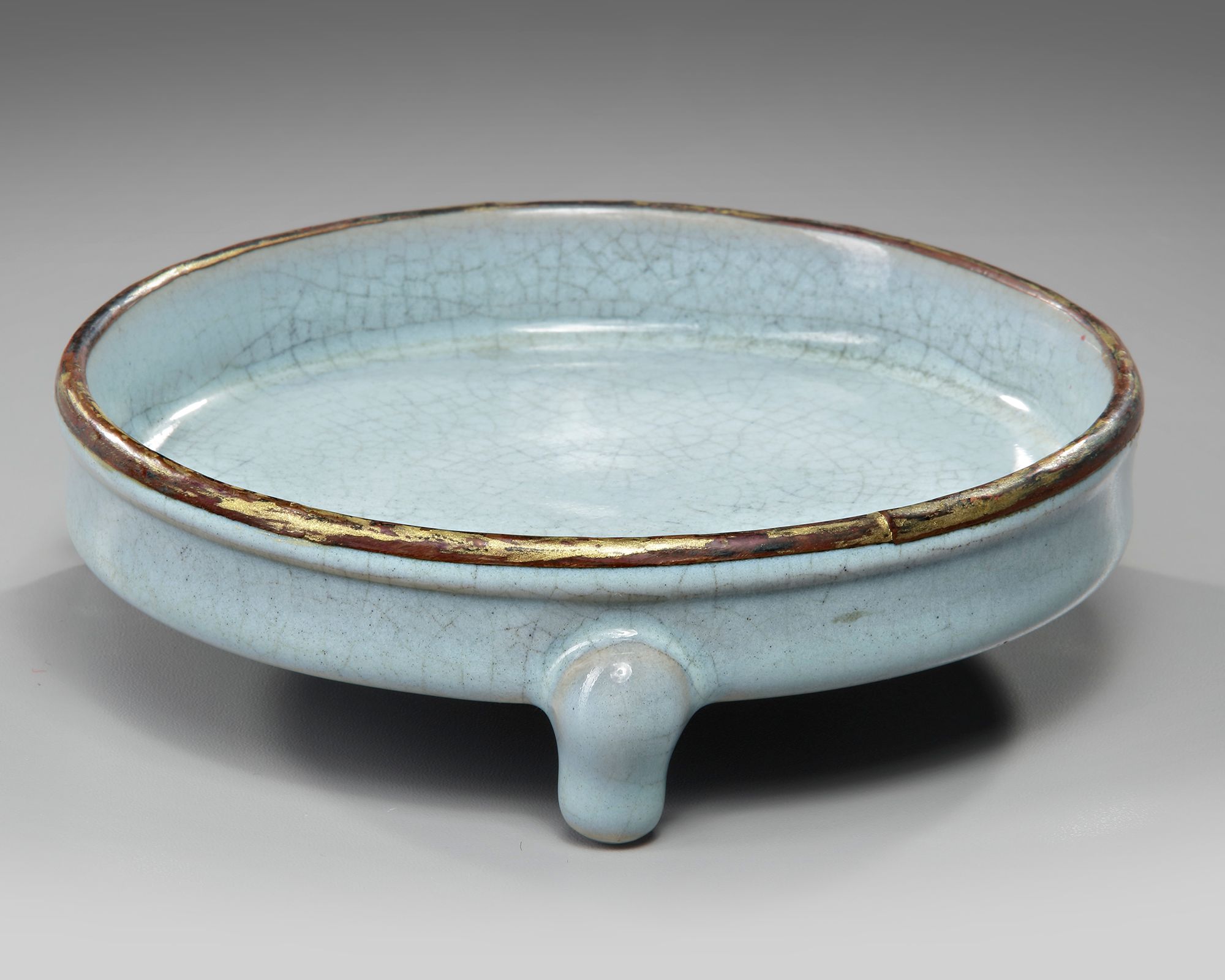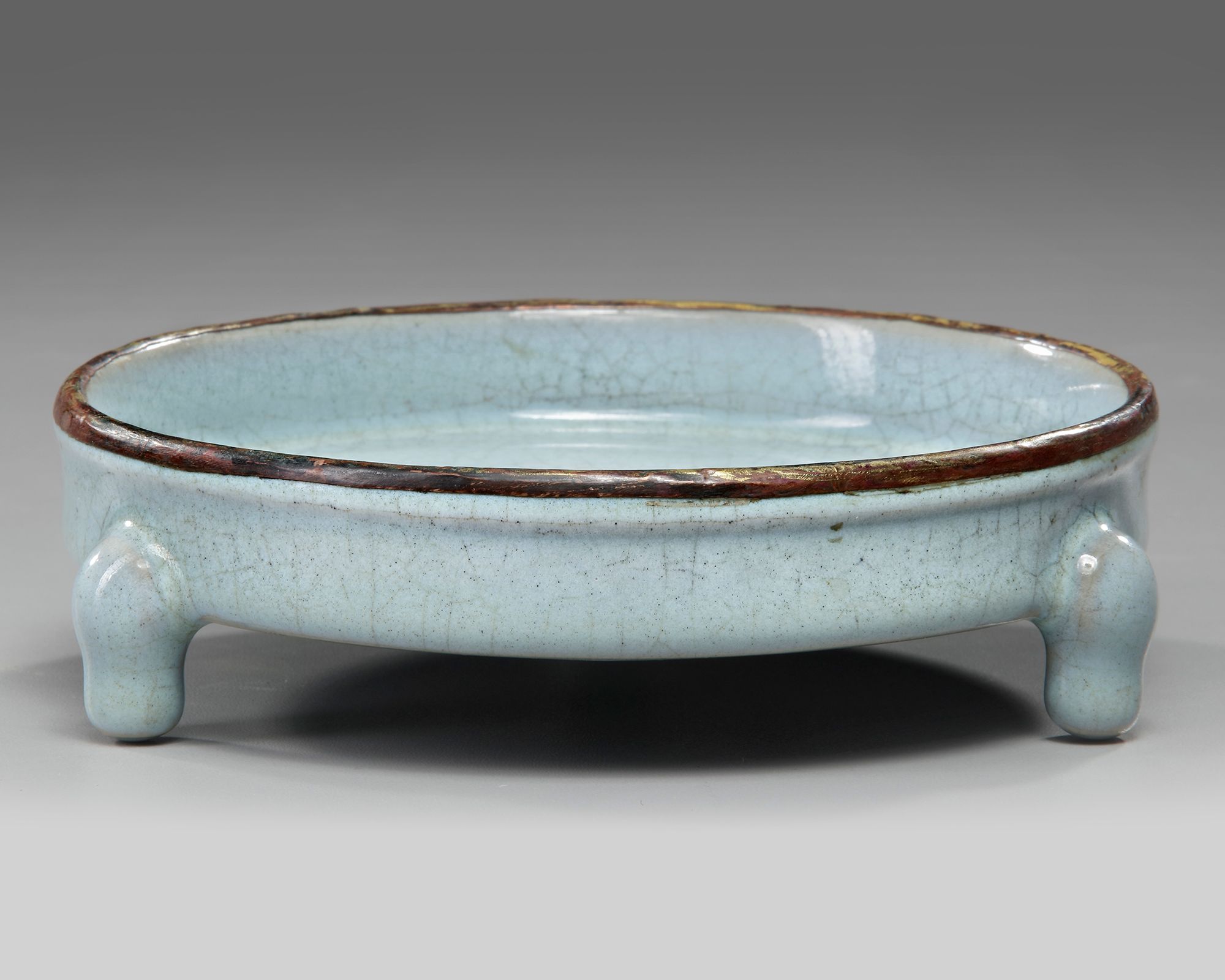 A CHINESE THREE LEGGED PLATE RU WARE WASHER, SONG DYNASTY (960-1279 AD)