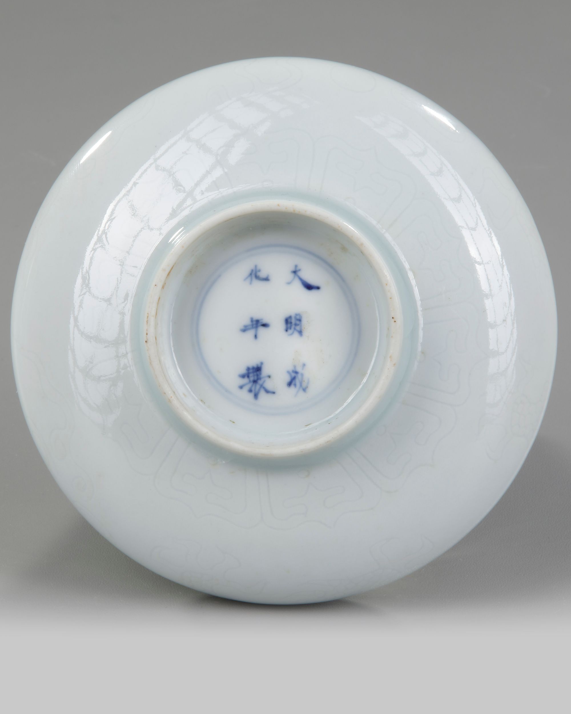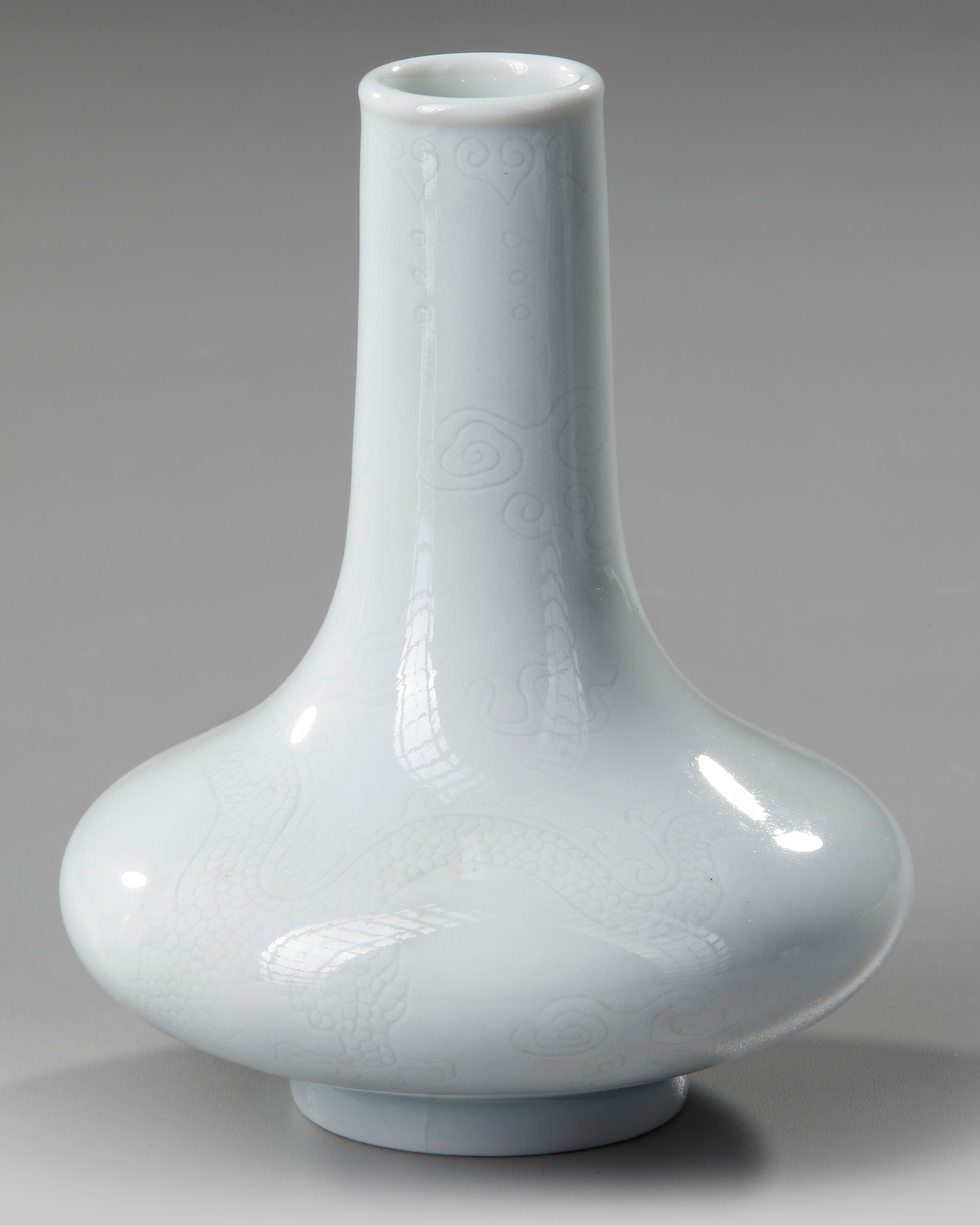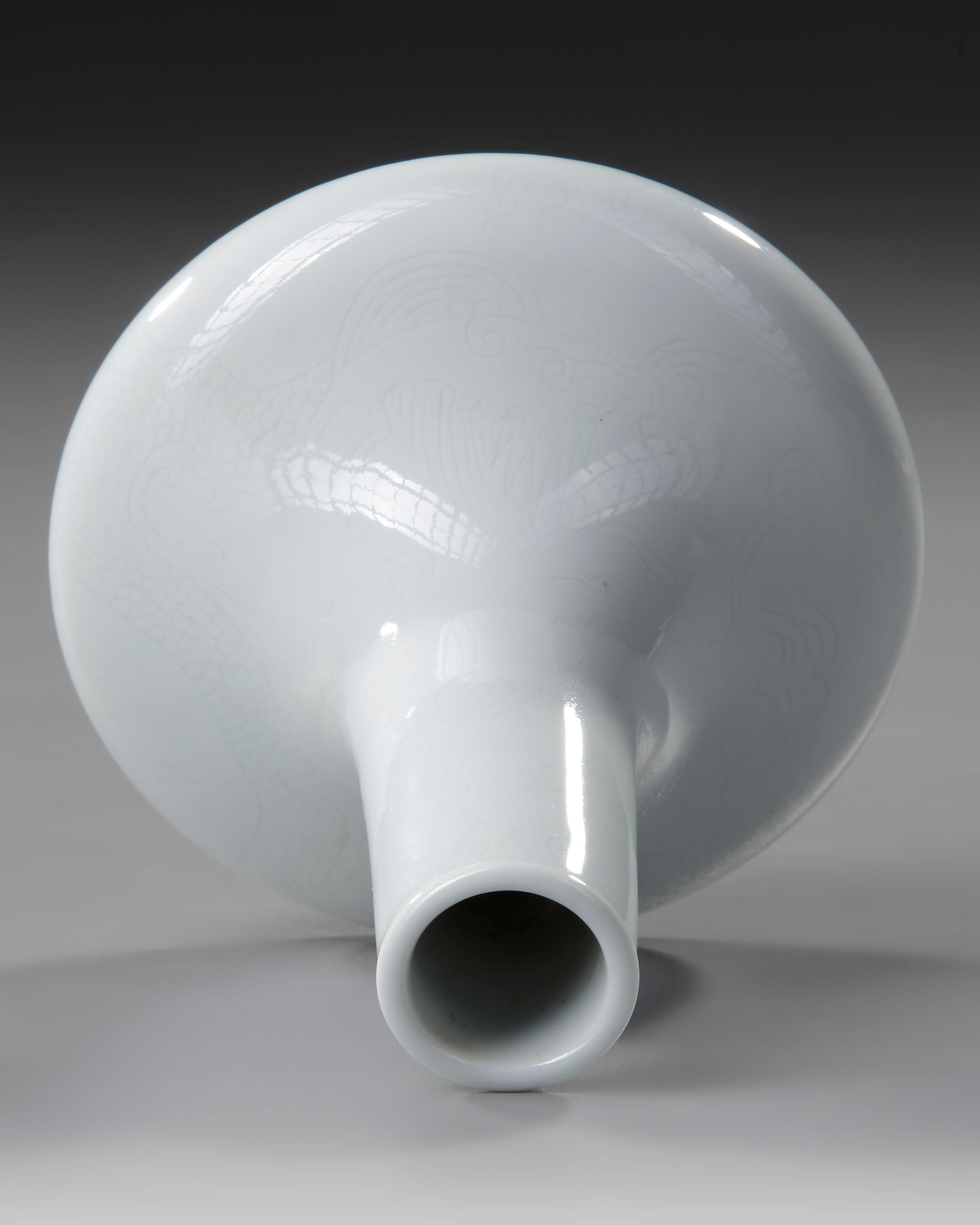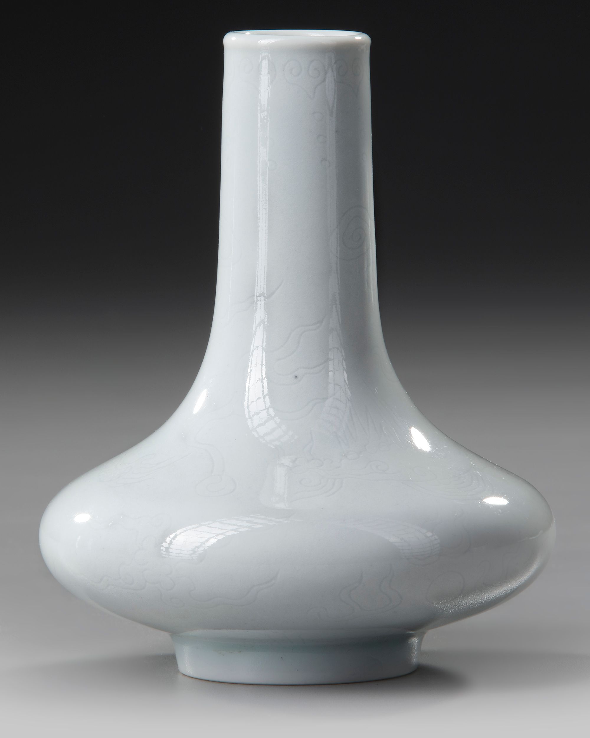 A Chinese bottle vase covered with a white glaze and engraved with a dragon chasing a flaming pearl amongst clouds.