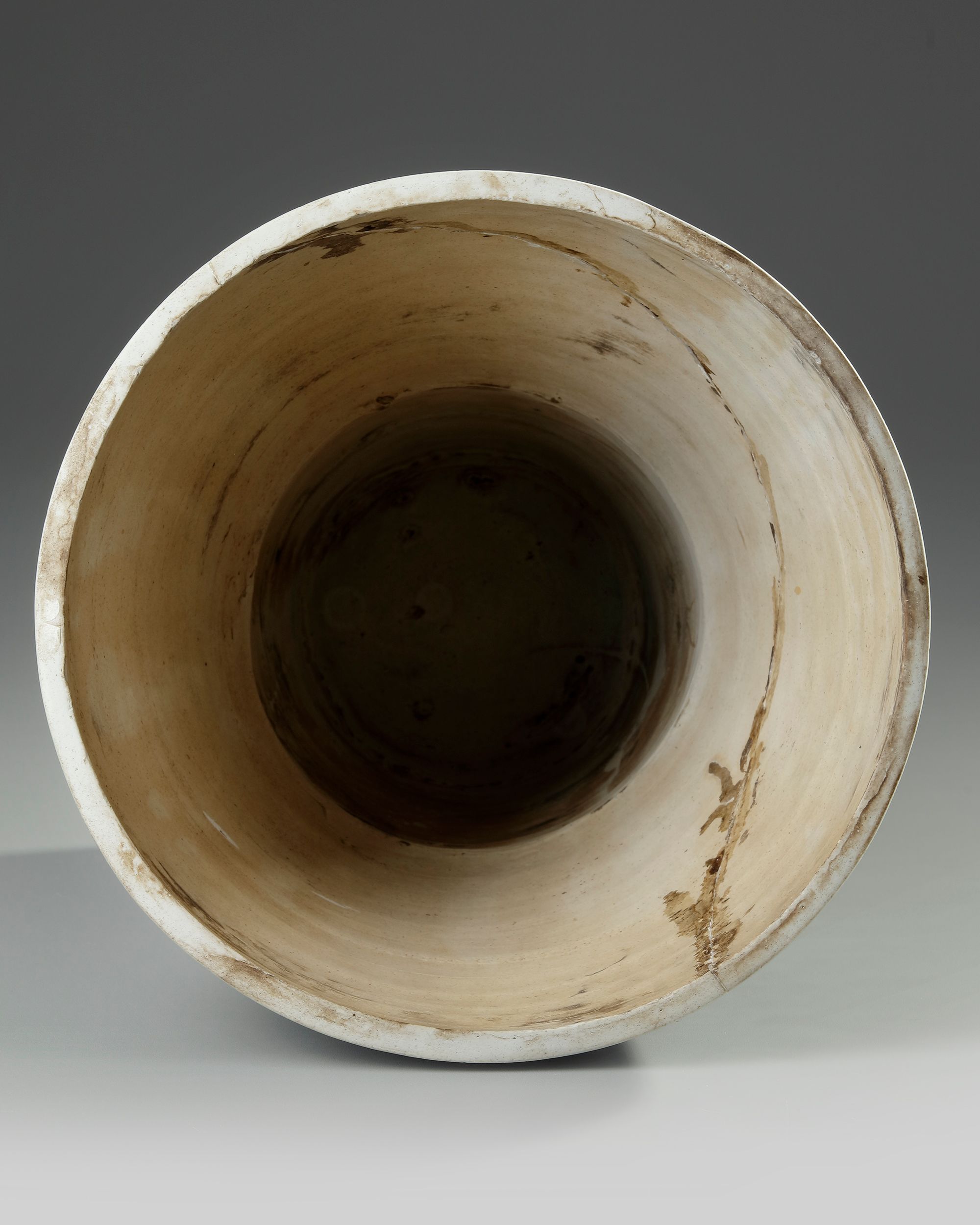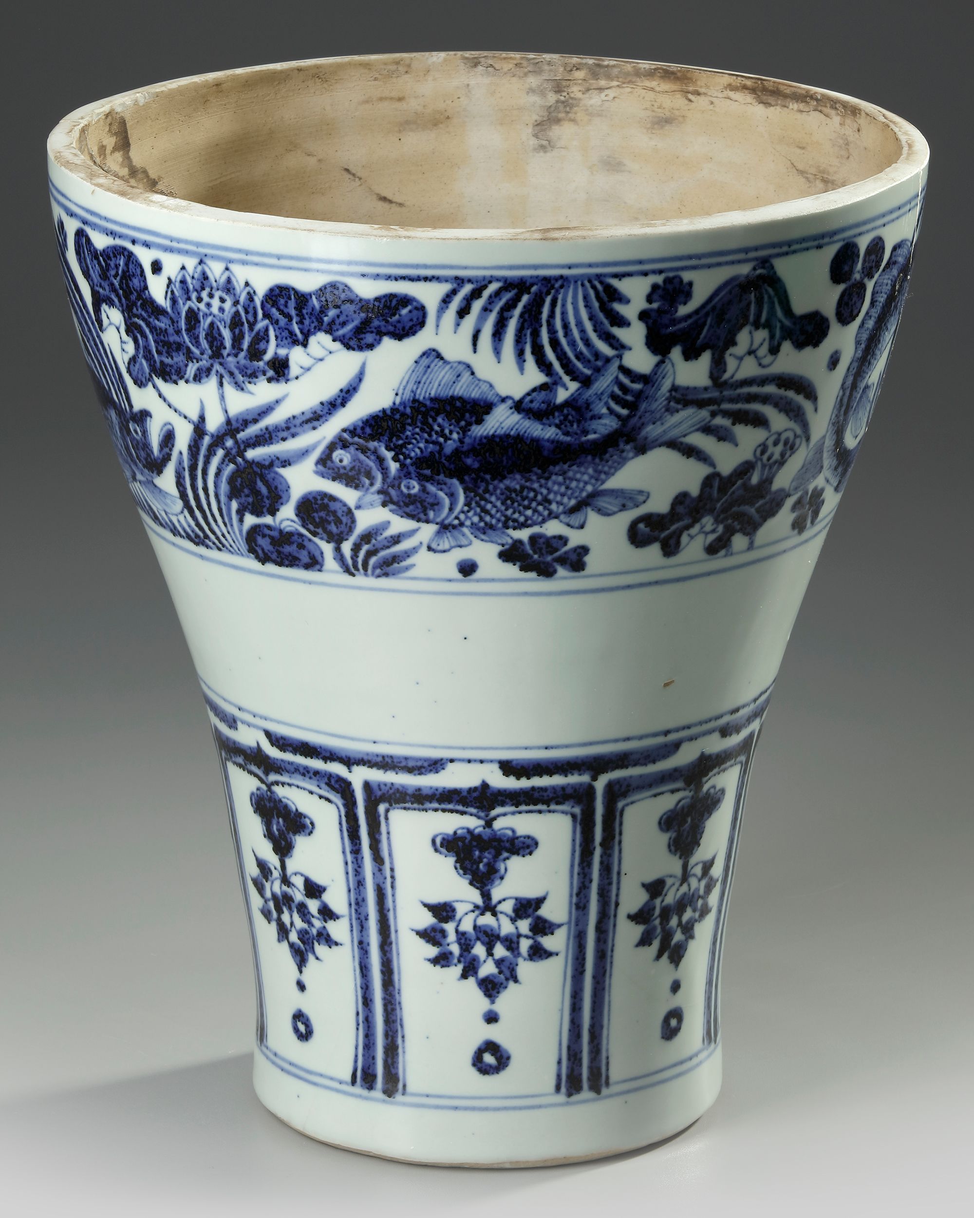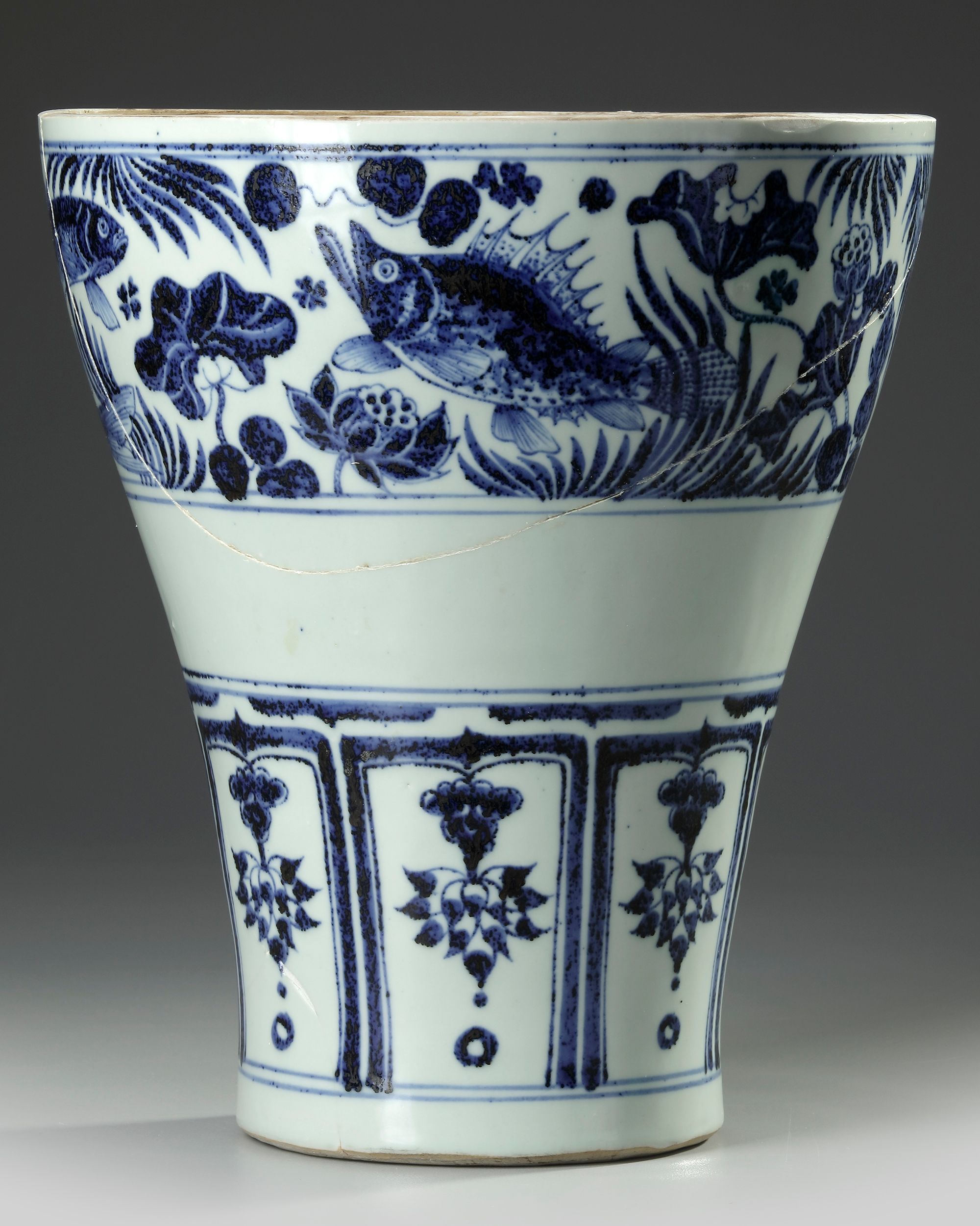 A Chinese porcelain vase decorated with band around the body enclosing fish amongst foliage, the base with a petal lappet border. Height: 30 cm.