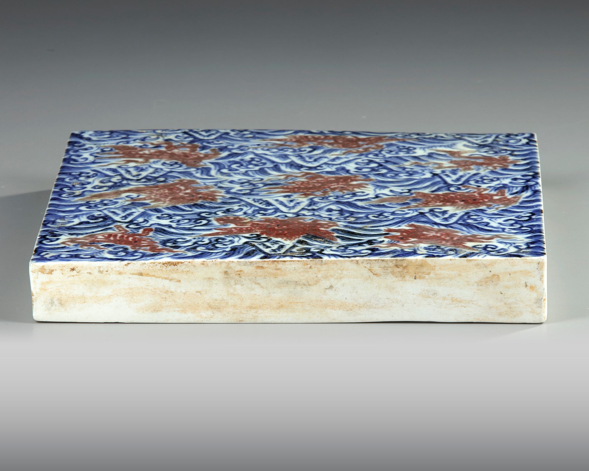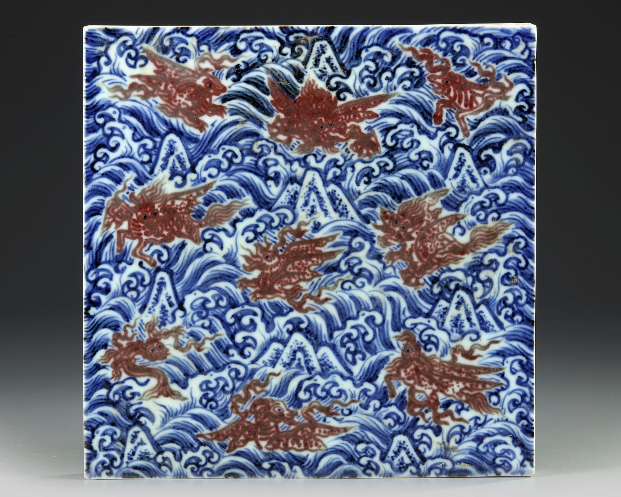 A Chinese porcelain tile, decorated with various mythical sea creatures in underglaze copper red on a ground of tumultuous cobalt-blue waves.