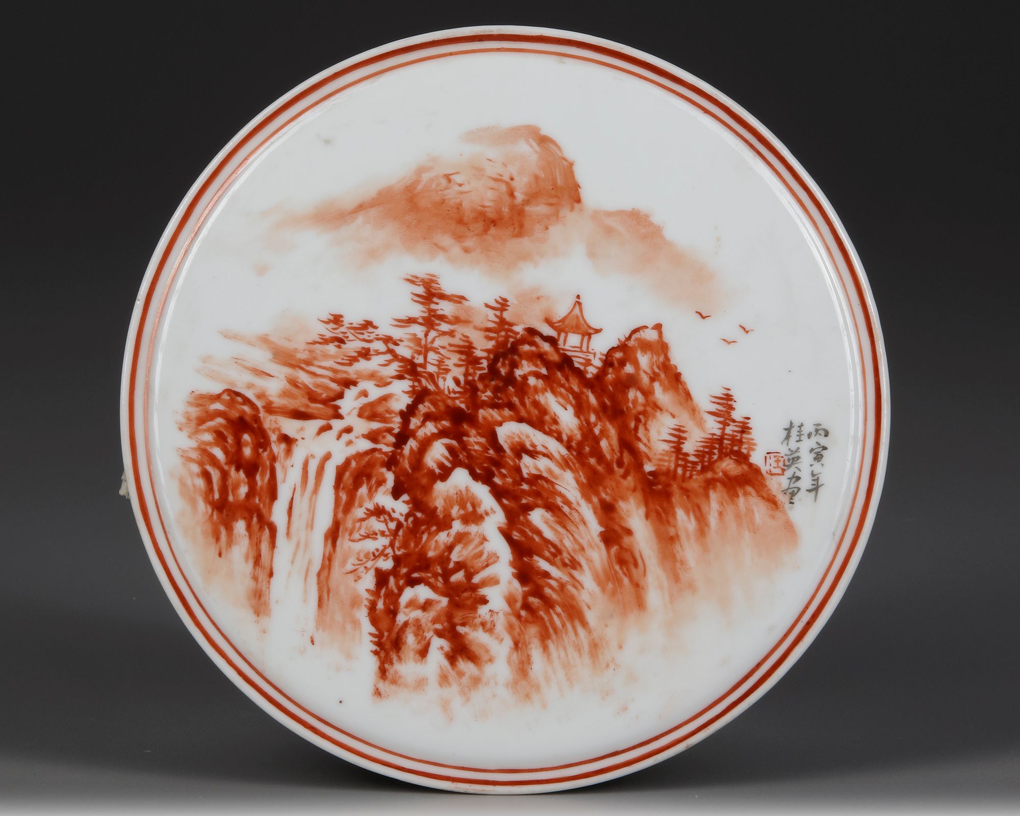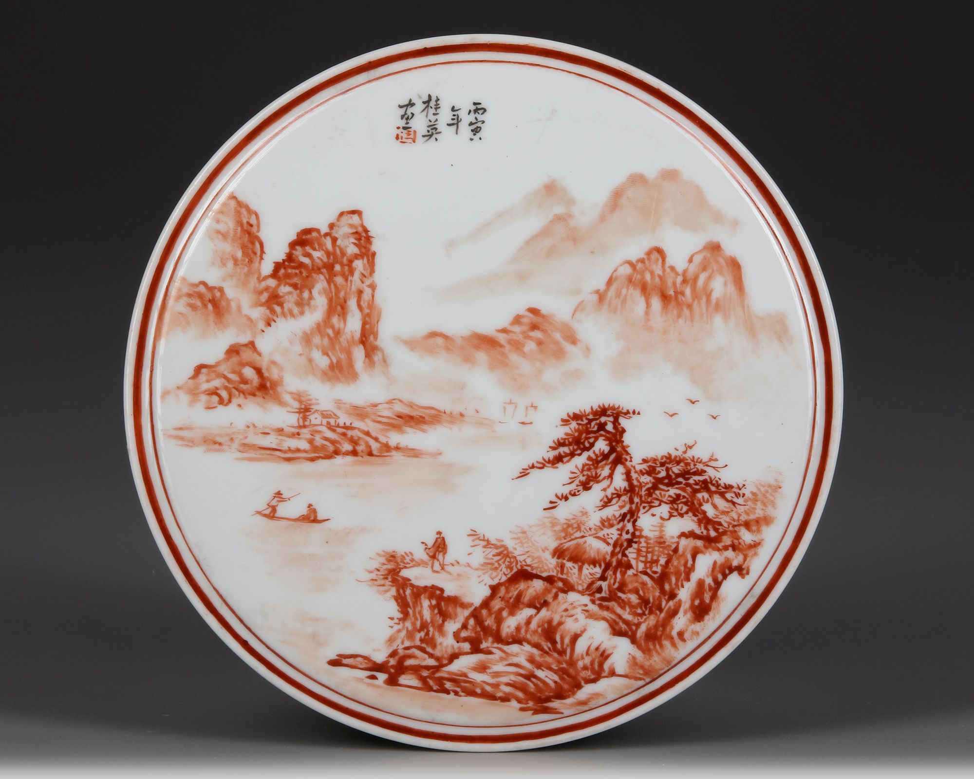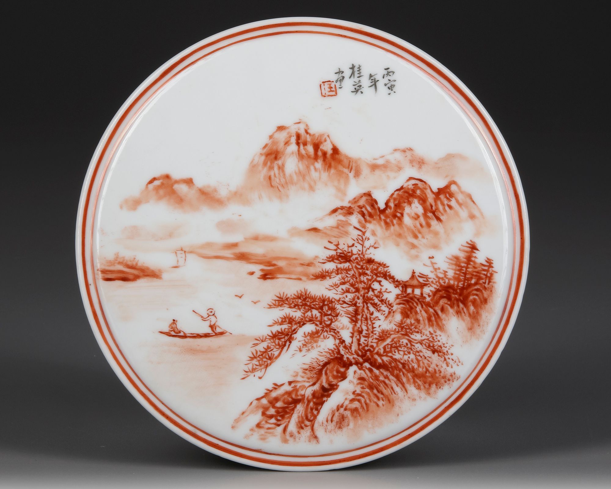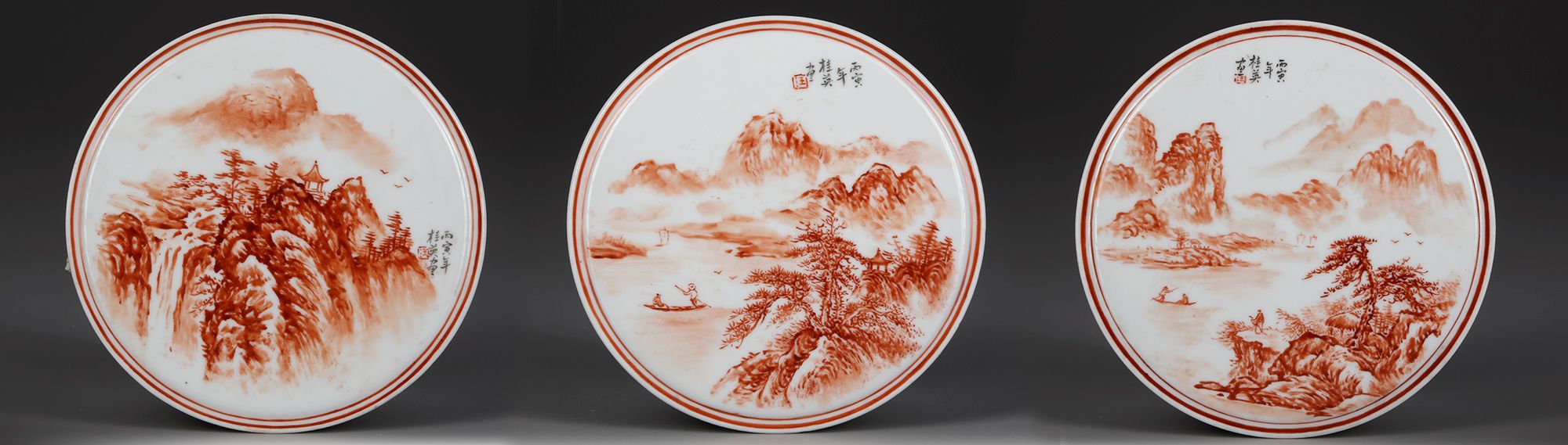 Three Chinese porcelain plaques with hanging loops to the backside, decorated in copper red with fishermen on sampan in a mountainous river landscape, with Chinese calligraphy.