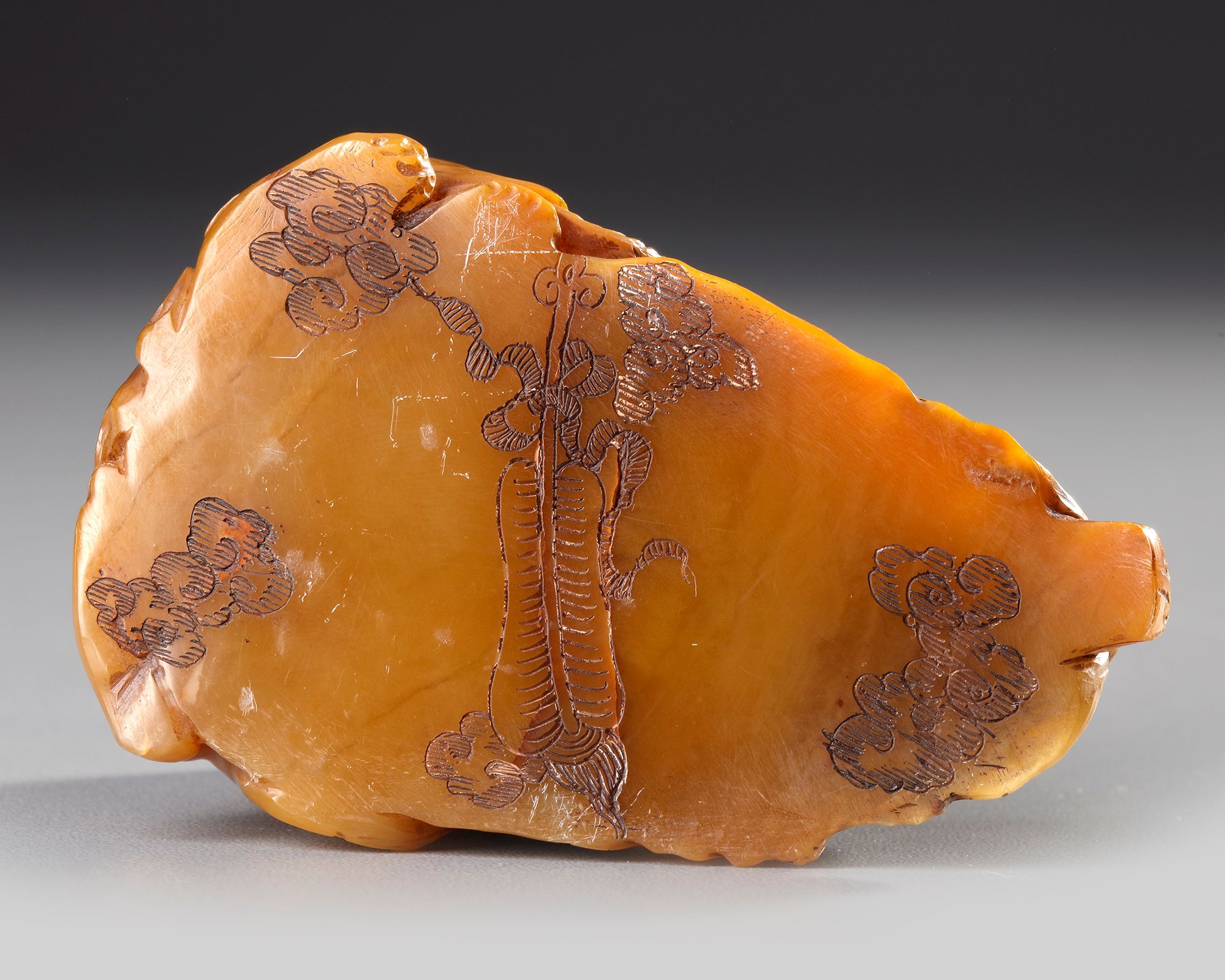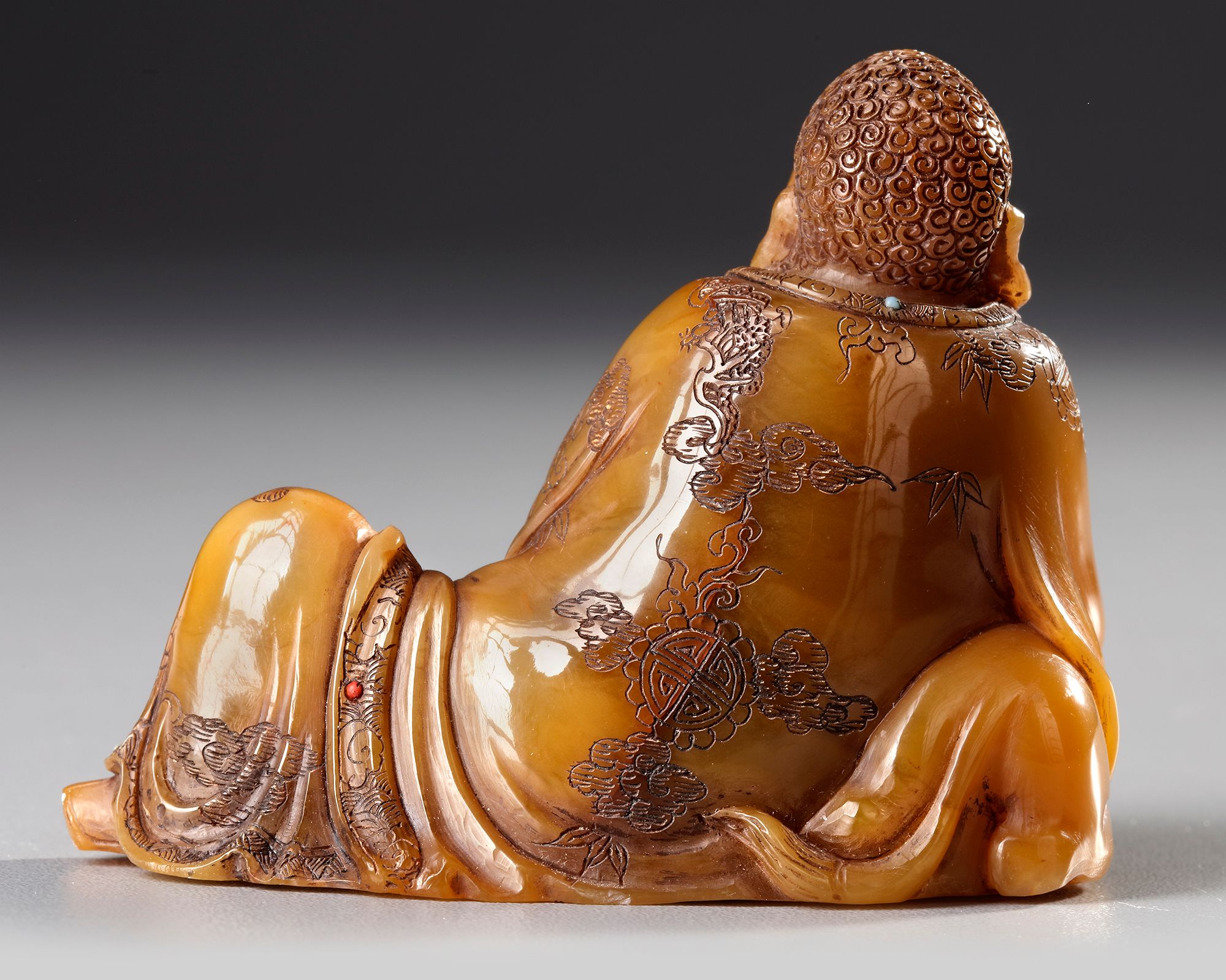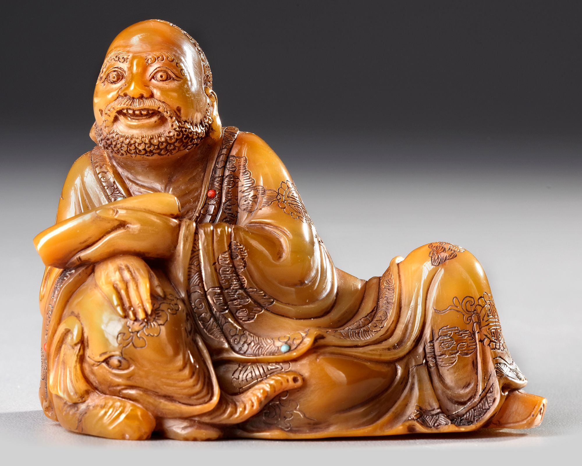 The figure is carved reclining holding a scroll in the crook of his right arm, accompanied by a small elephant. The robe is decorated with incised flowers and various hardstone inlays.