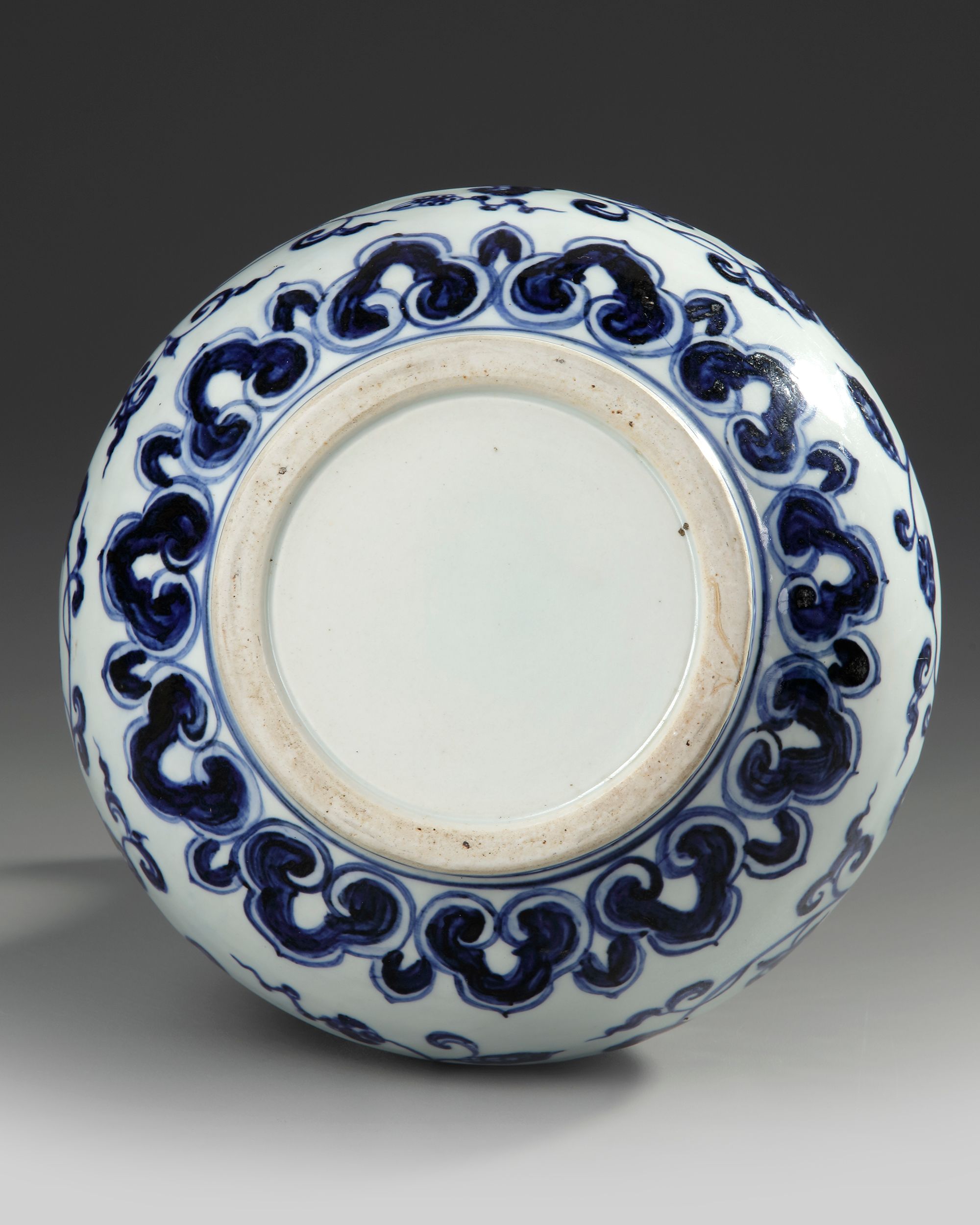 A Chinese pear shaped ming style vase, decorated in cobalt blue with a peony scroll encircling the body,, set between a band of ruyi heads to the base and a band enclosing flower heads to the neck.
