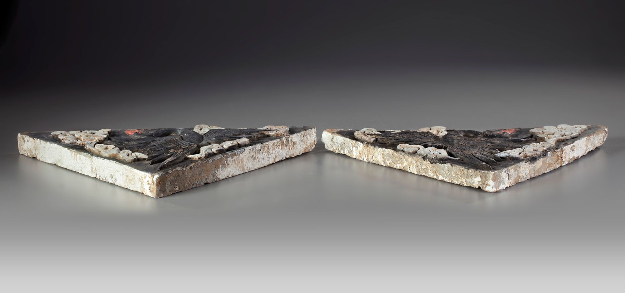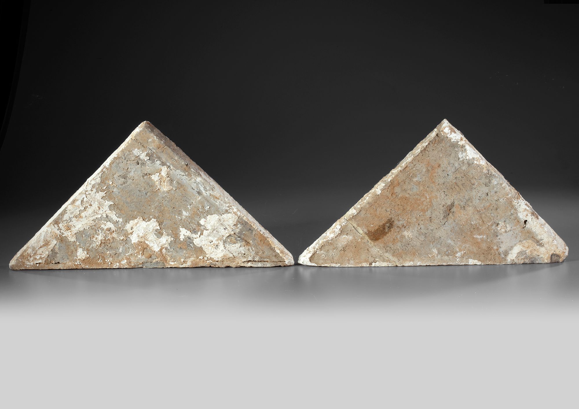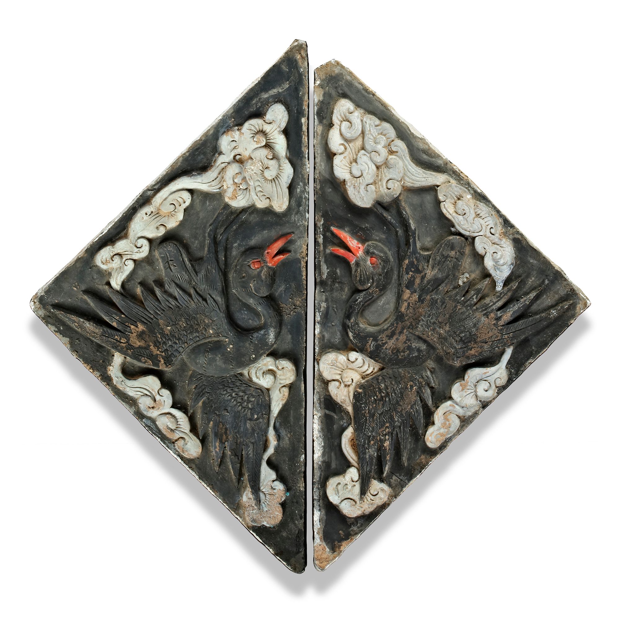 A pair of tiles with bird and flower decoration. 36 by 36 cm. 36 by 34 cm.