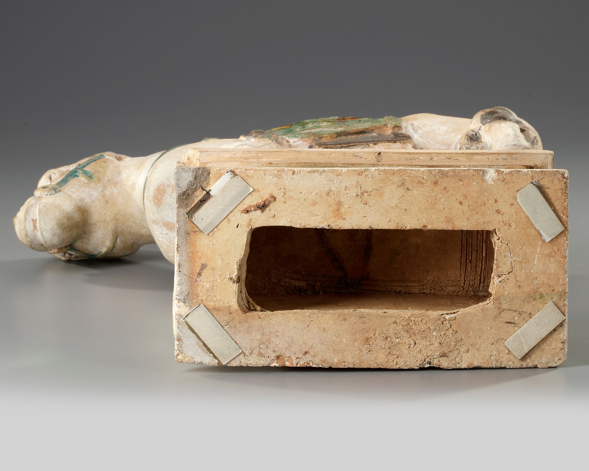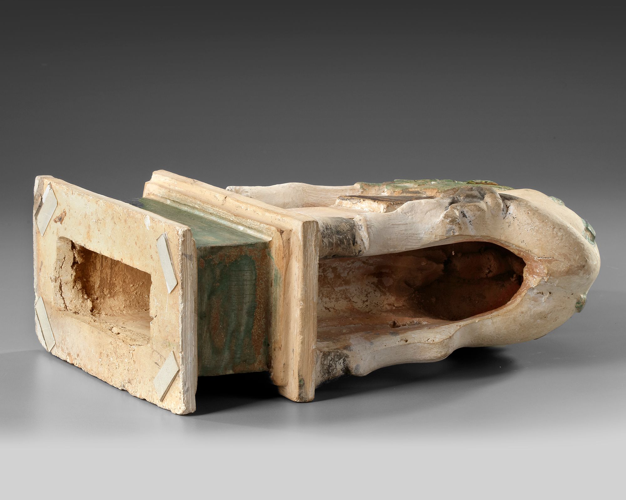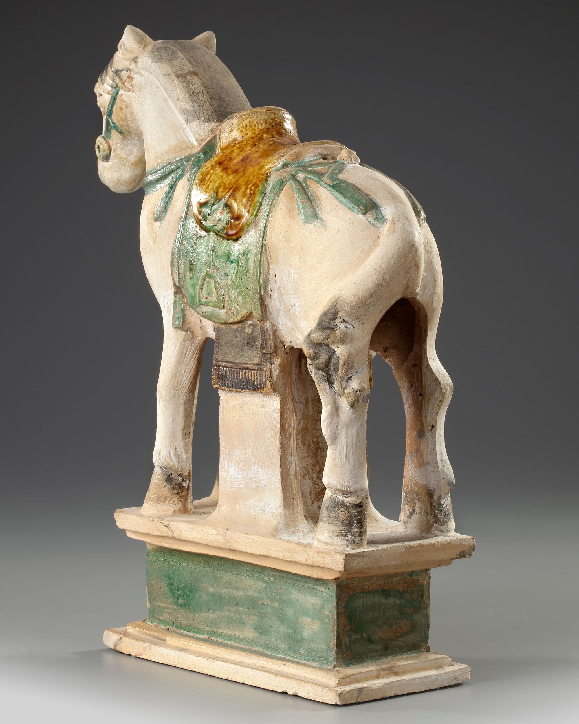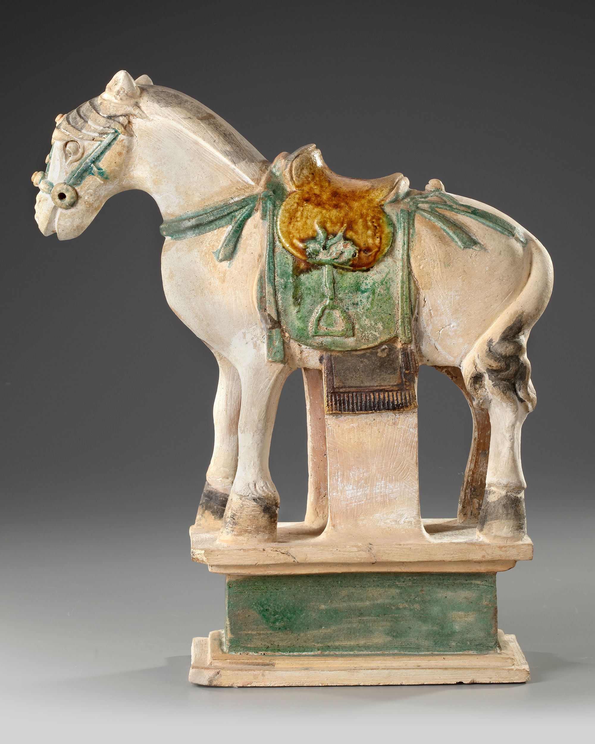 A terracotta statue of a standing horse, decorated with a saddle, saddle cloth and stirrups. Height: 36 cm.