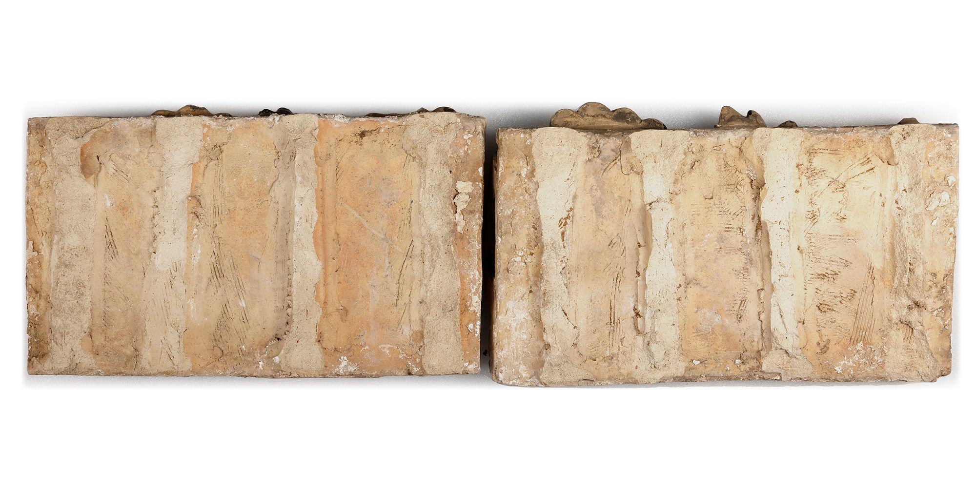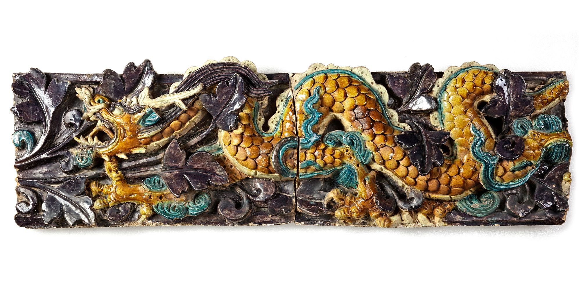 The tiles are well modeled in high relief with the writhing body of a large scaly dragon amidst leafs. 105 by 30 cm.