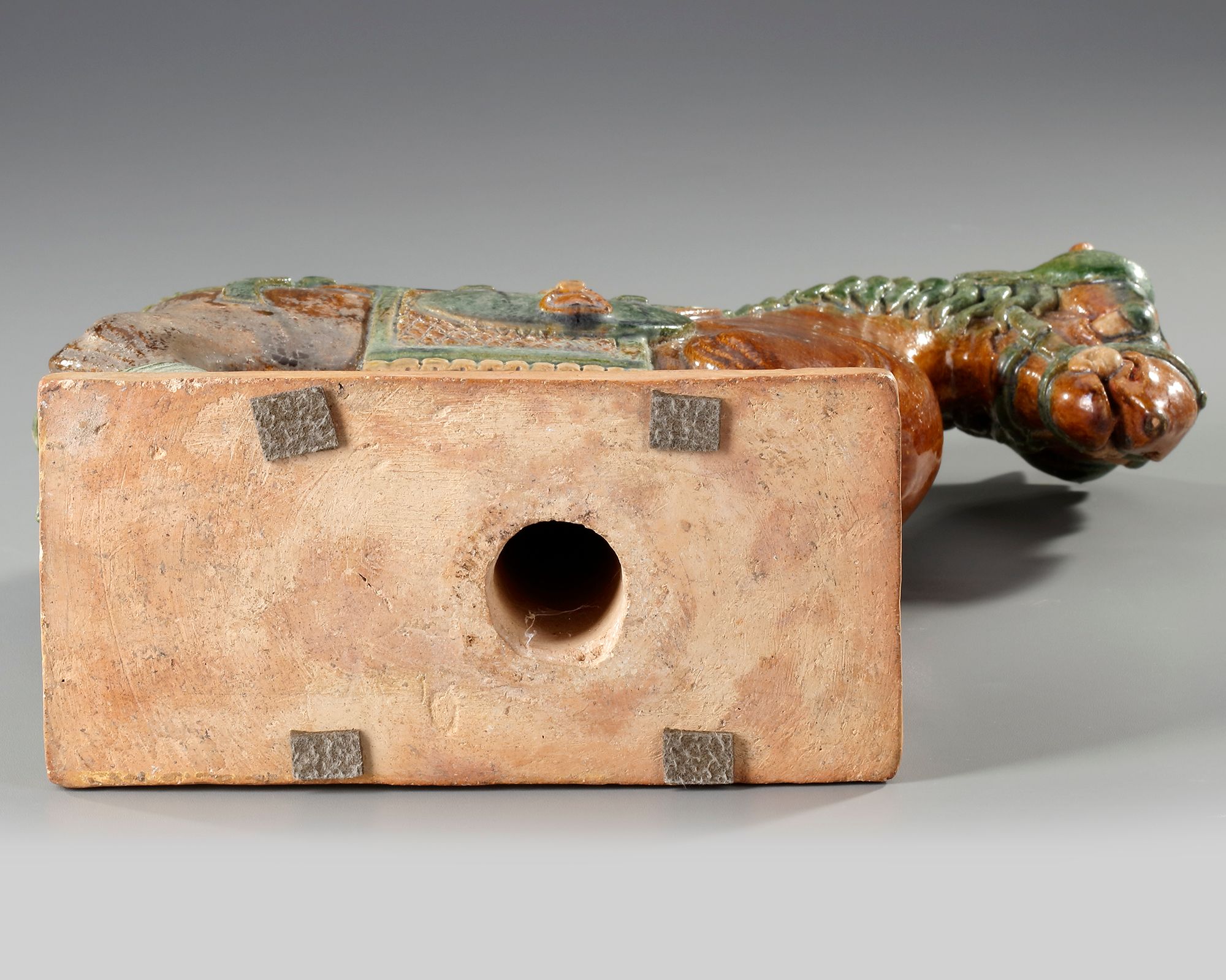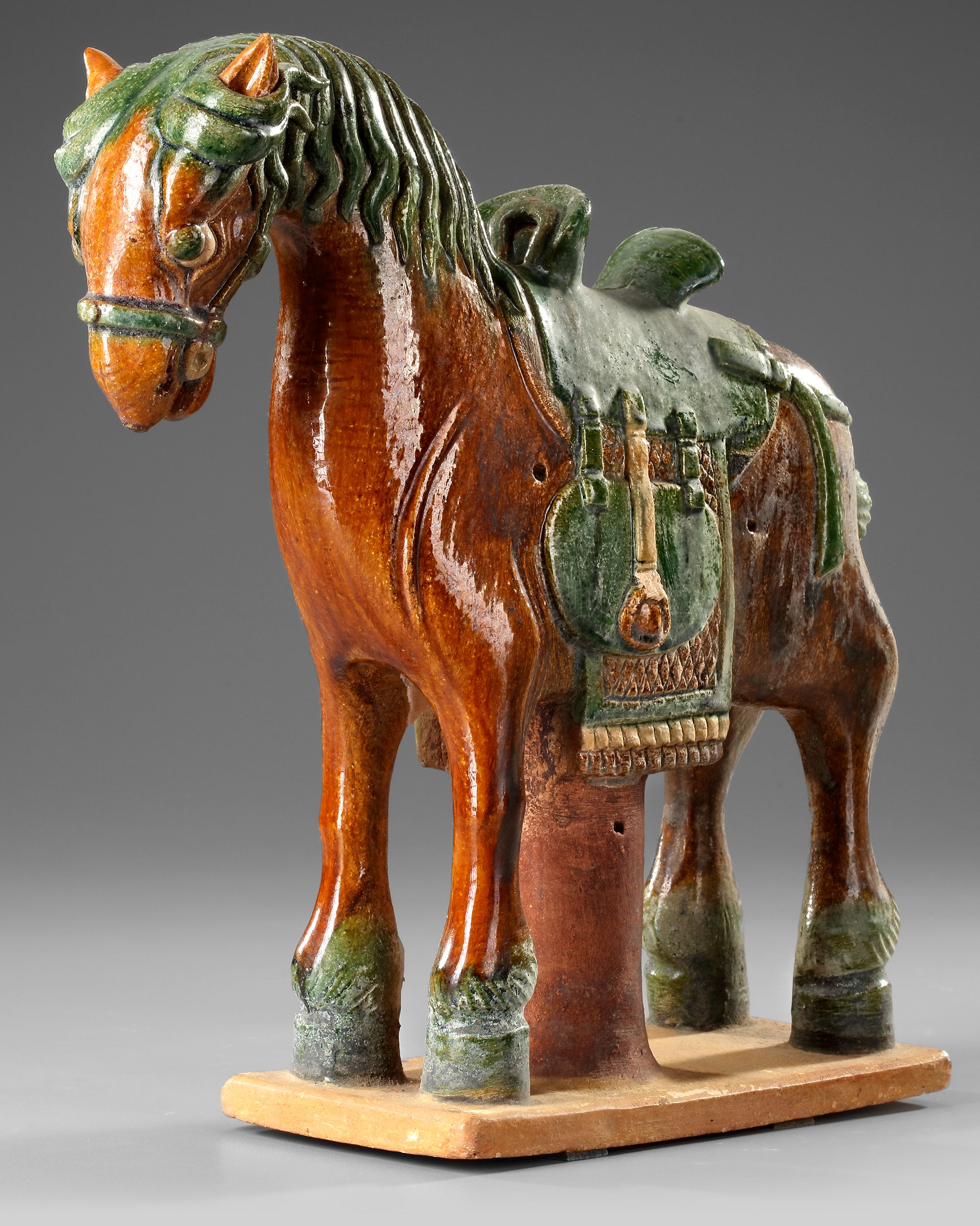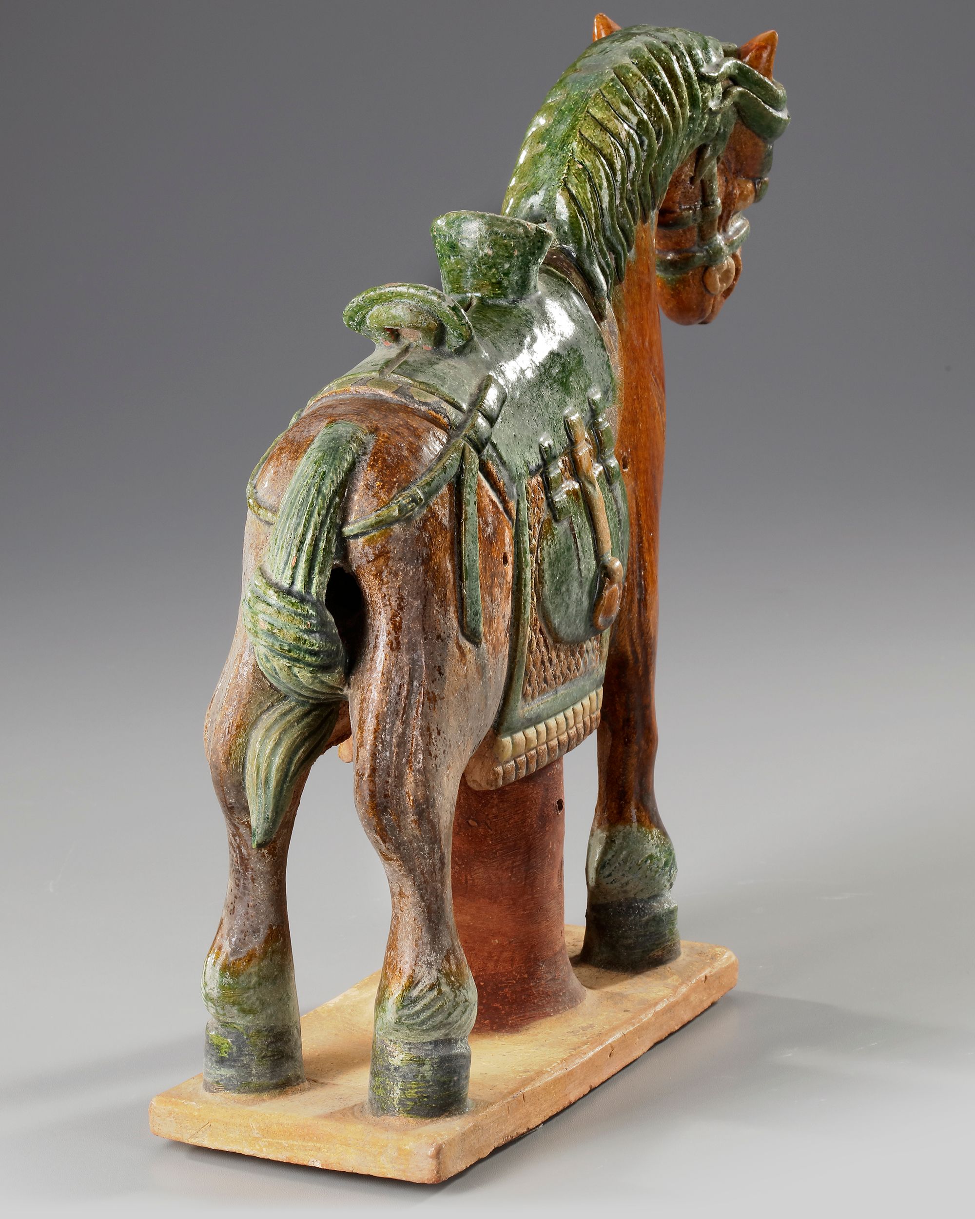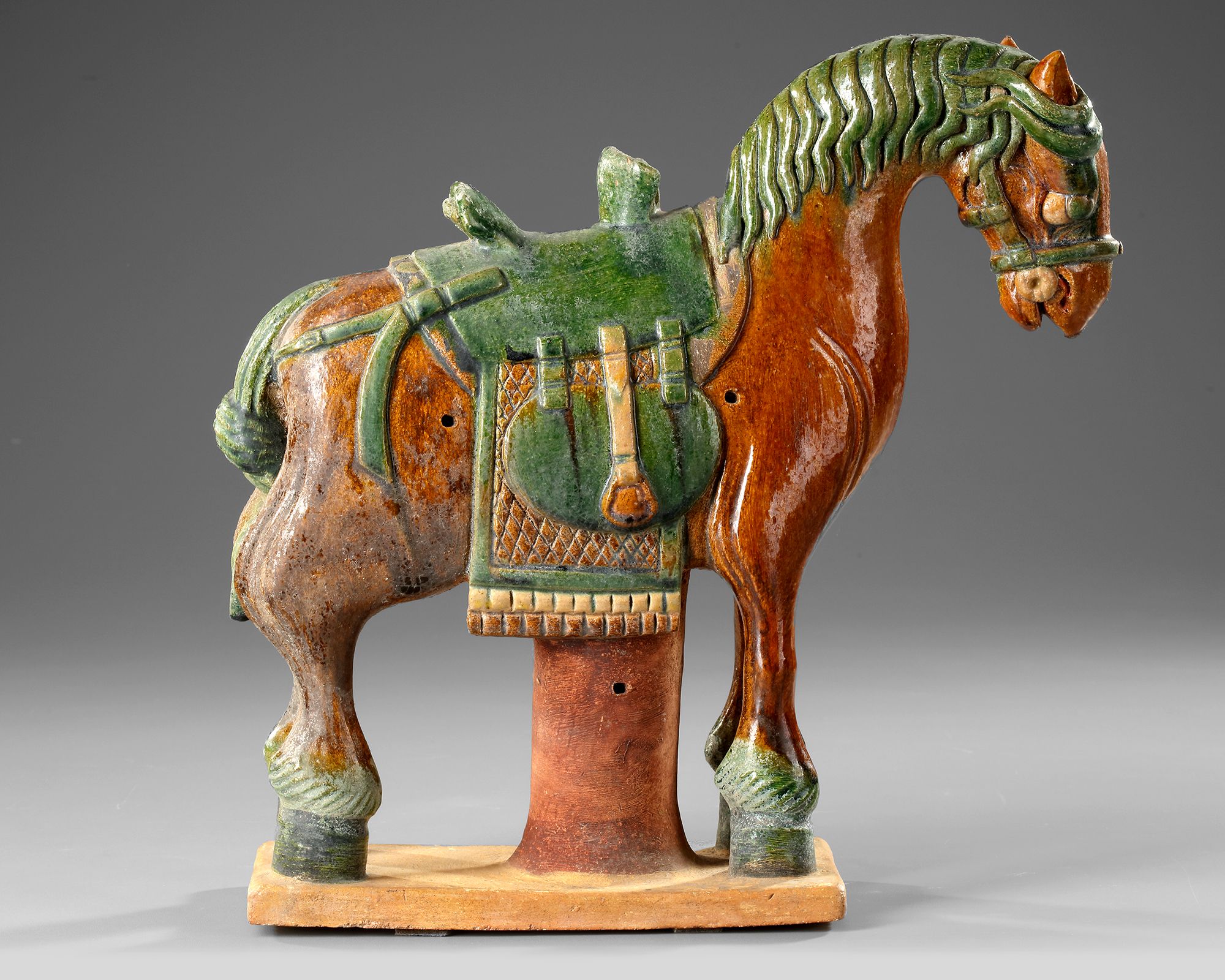 A terracotta statue of standing horse, decorated with a saddle, saddle cloth and stirrups. Height: 30 cm.