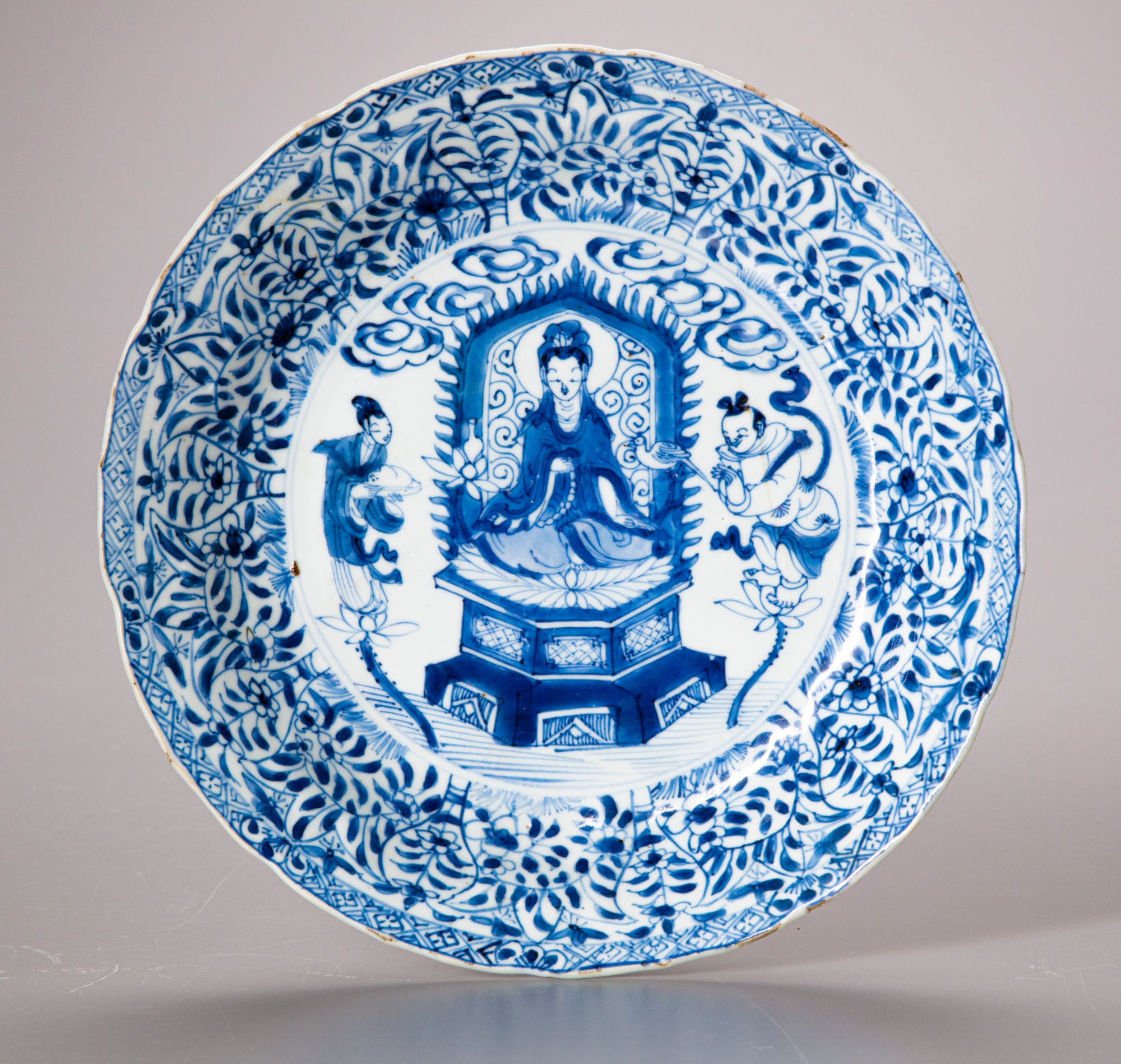 A Chinese porcelain dish decorated with a seated Guanyin on a lotus stand, the rim with floral motifs amongst foliage. 21.8 cm. diam.