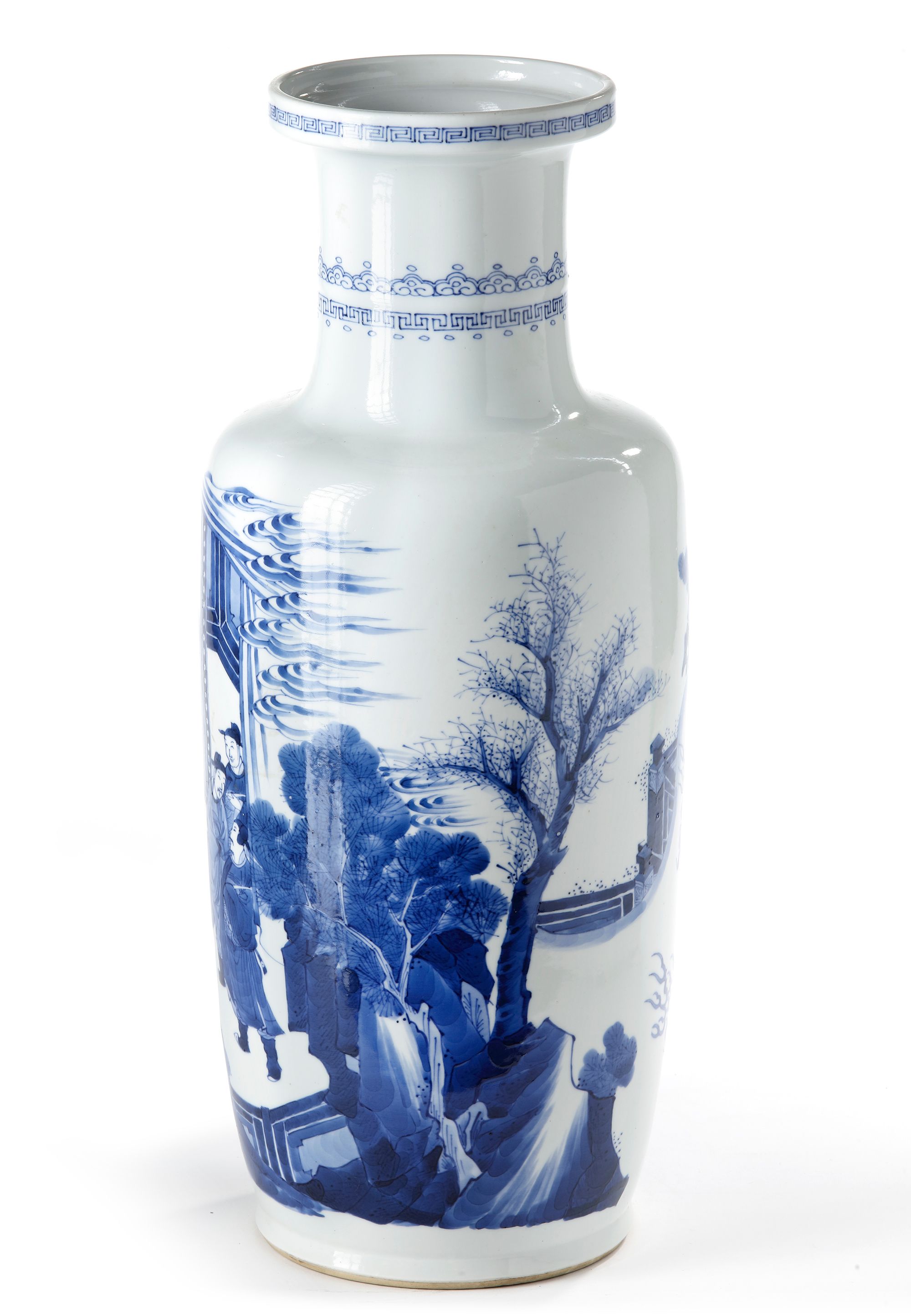 Decorated in a vibrant blue with dignitaries, a dragon and a dragon slayer, in a continuous rocky landscape and a terrace scene. 47 cm.