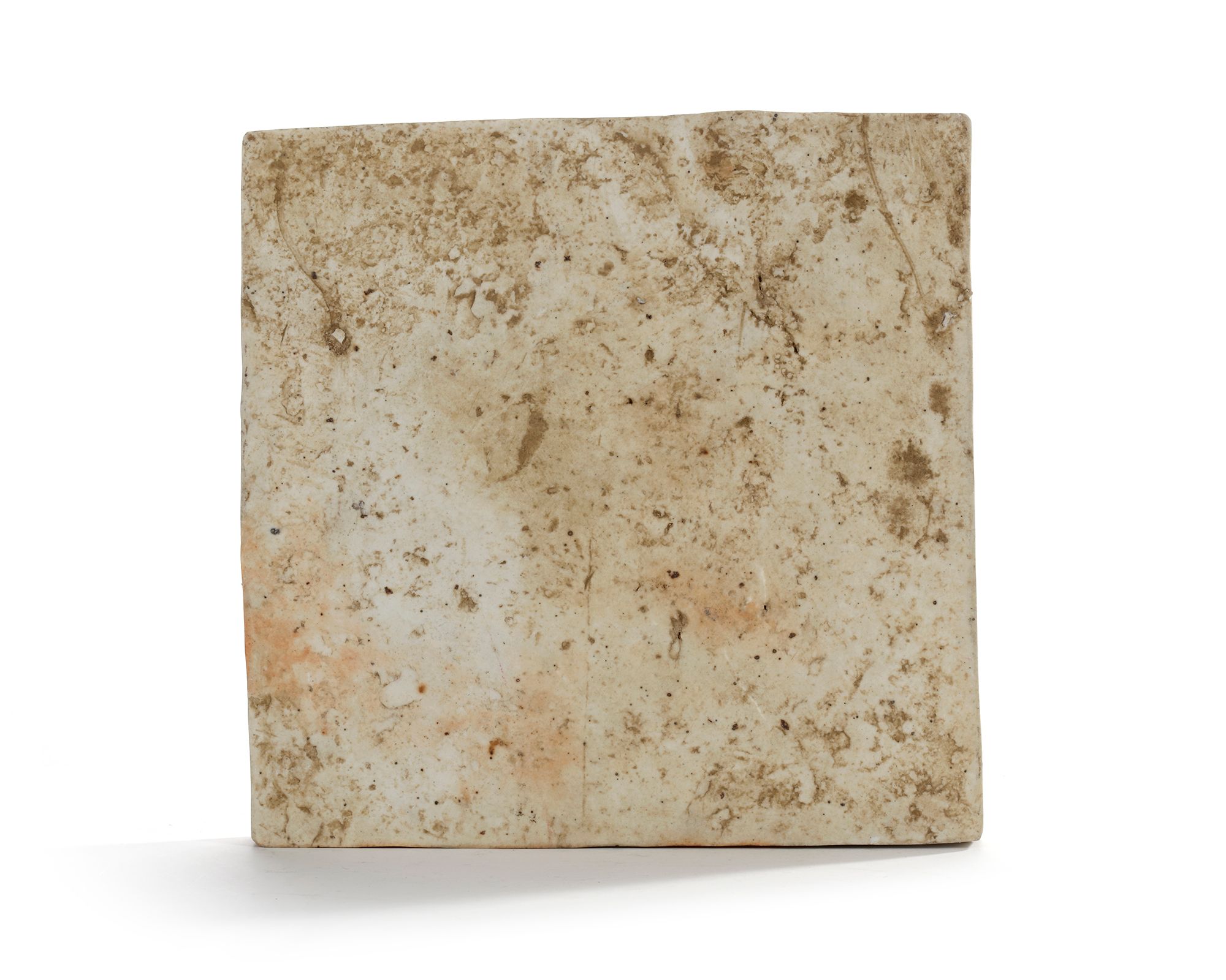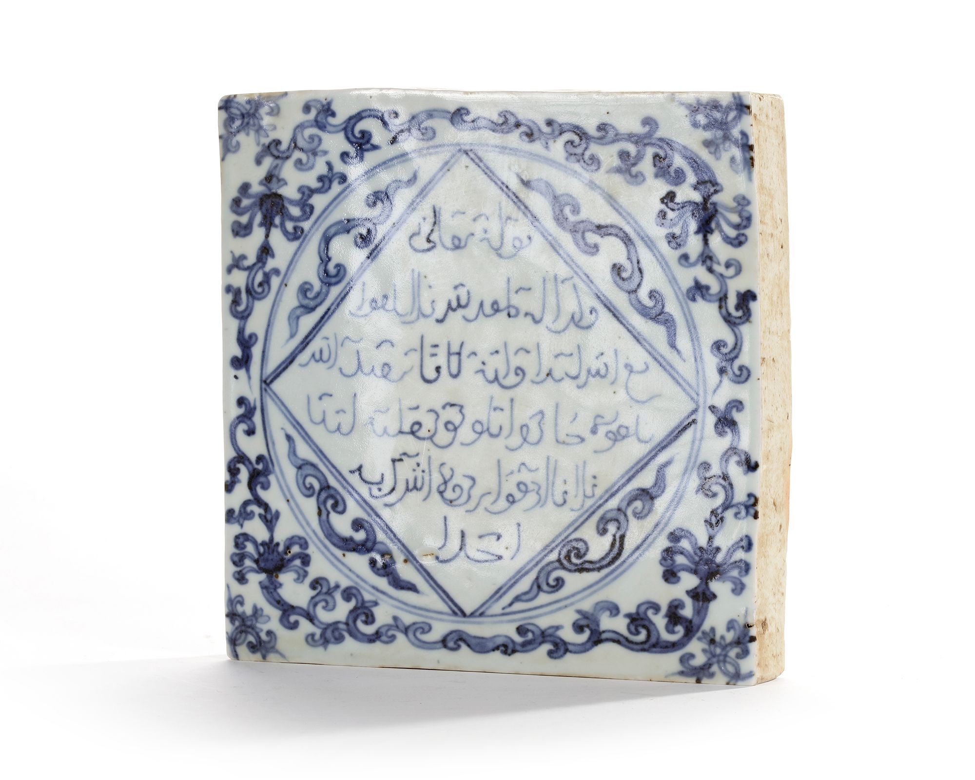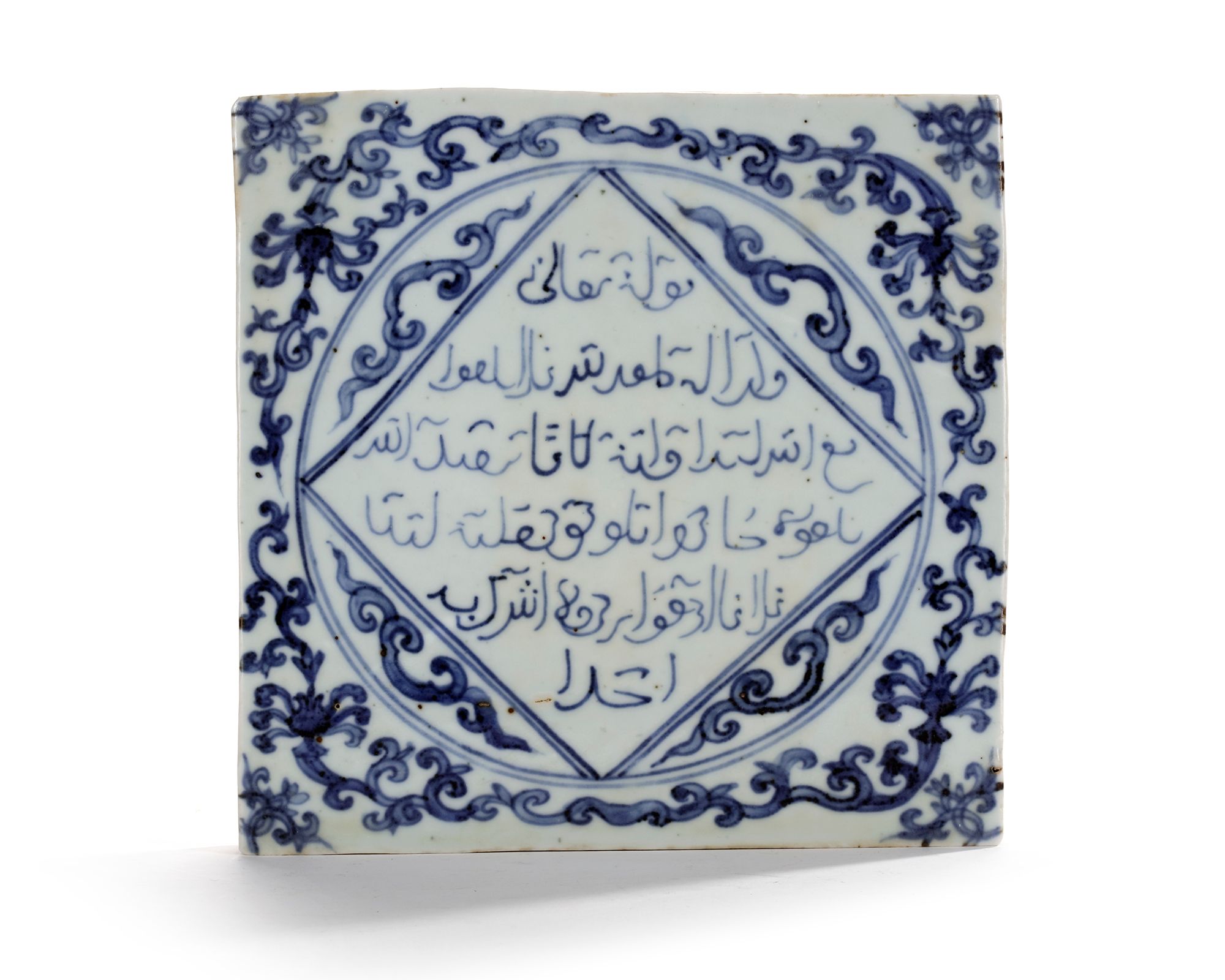 A Chinese tile decorated in cobalt blue with a central panel enclosing a verse from the Quran, surrounded by floral leafy sprays. 19.8 by 19.8 cm.