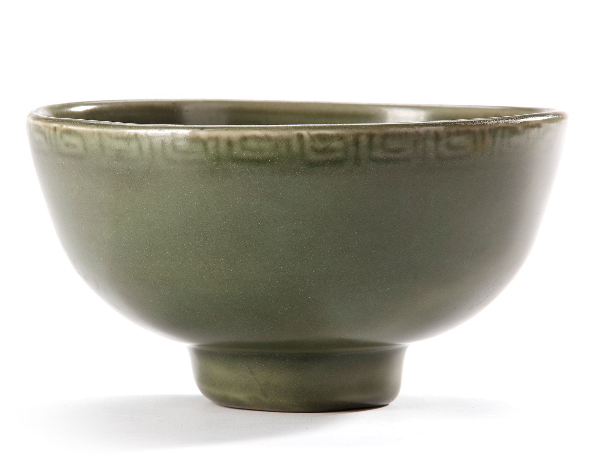 A Chinese celadon bowl standing on a short foot with slightly conical siders, the interior impressed with figures below a key fret chain, covered in a very rich deep green glaze.