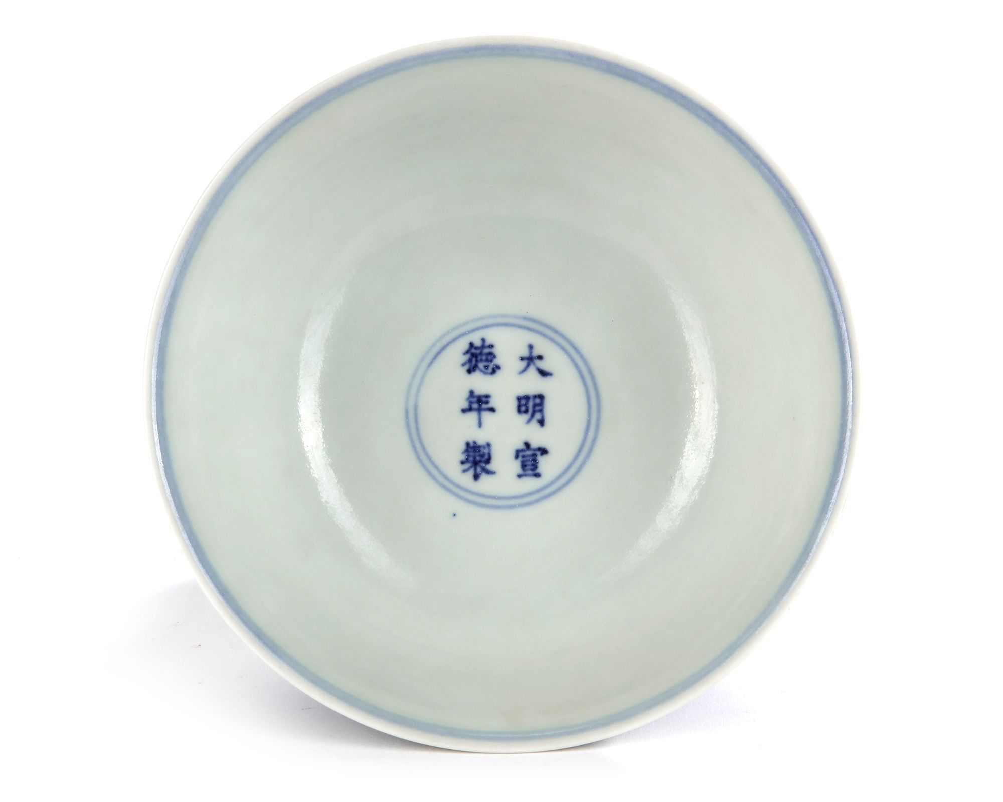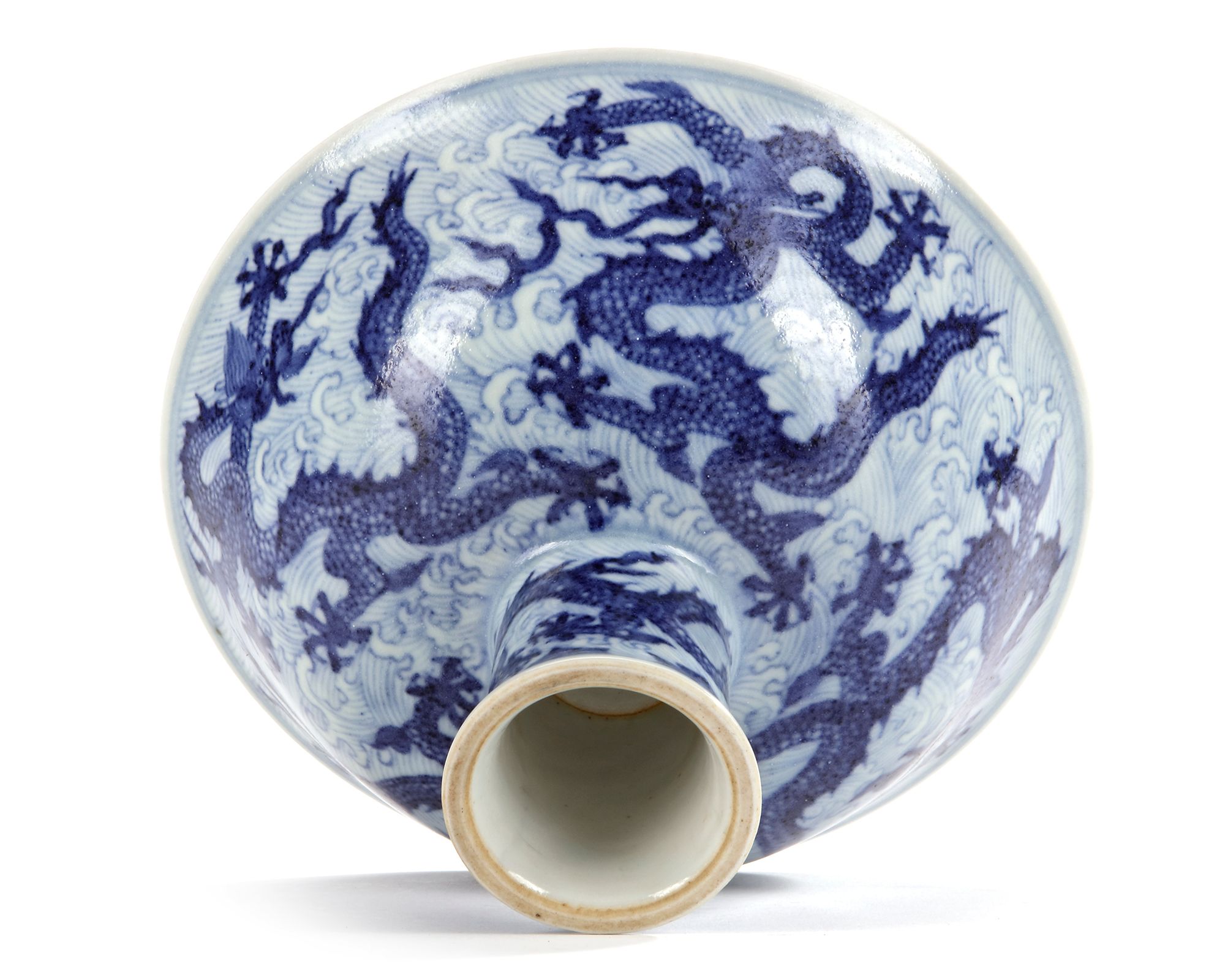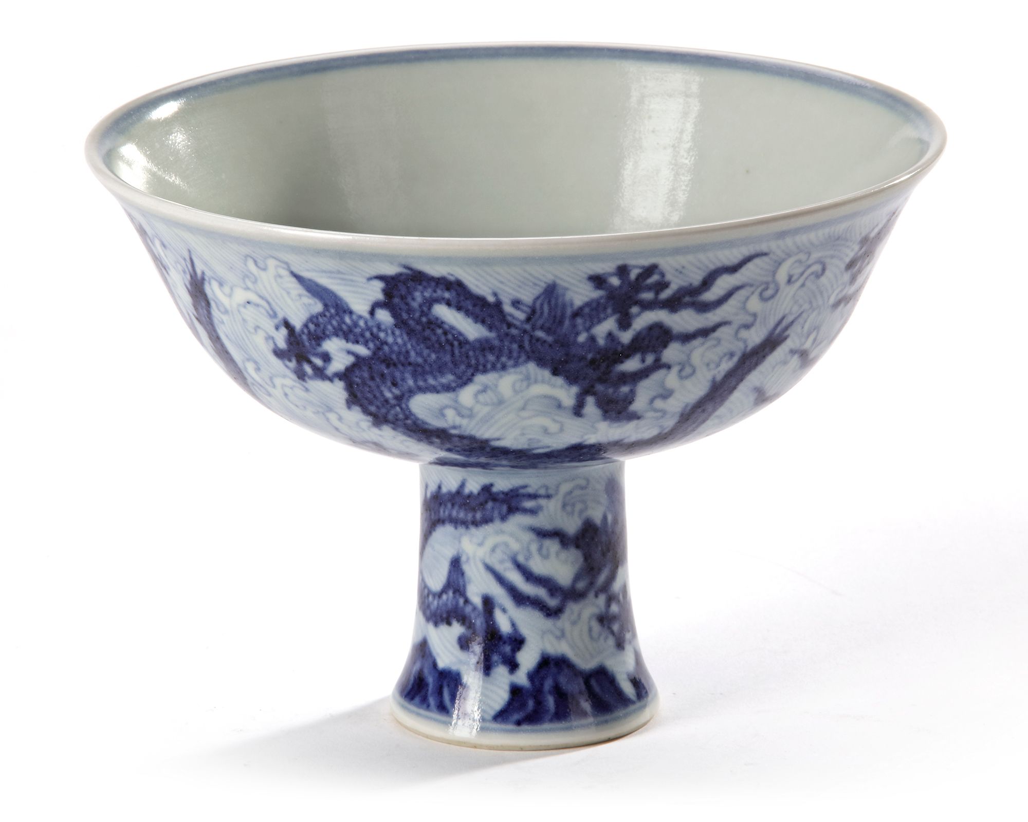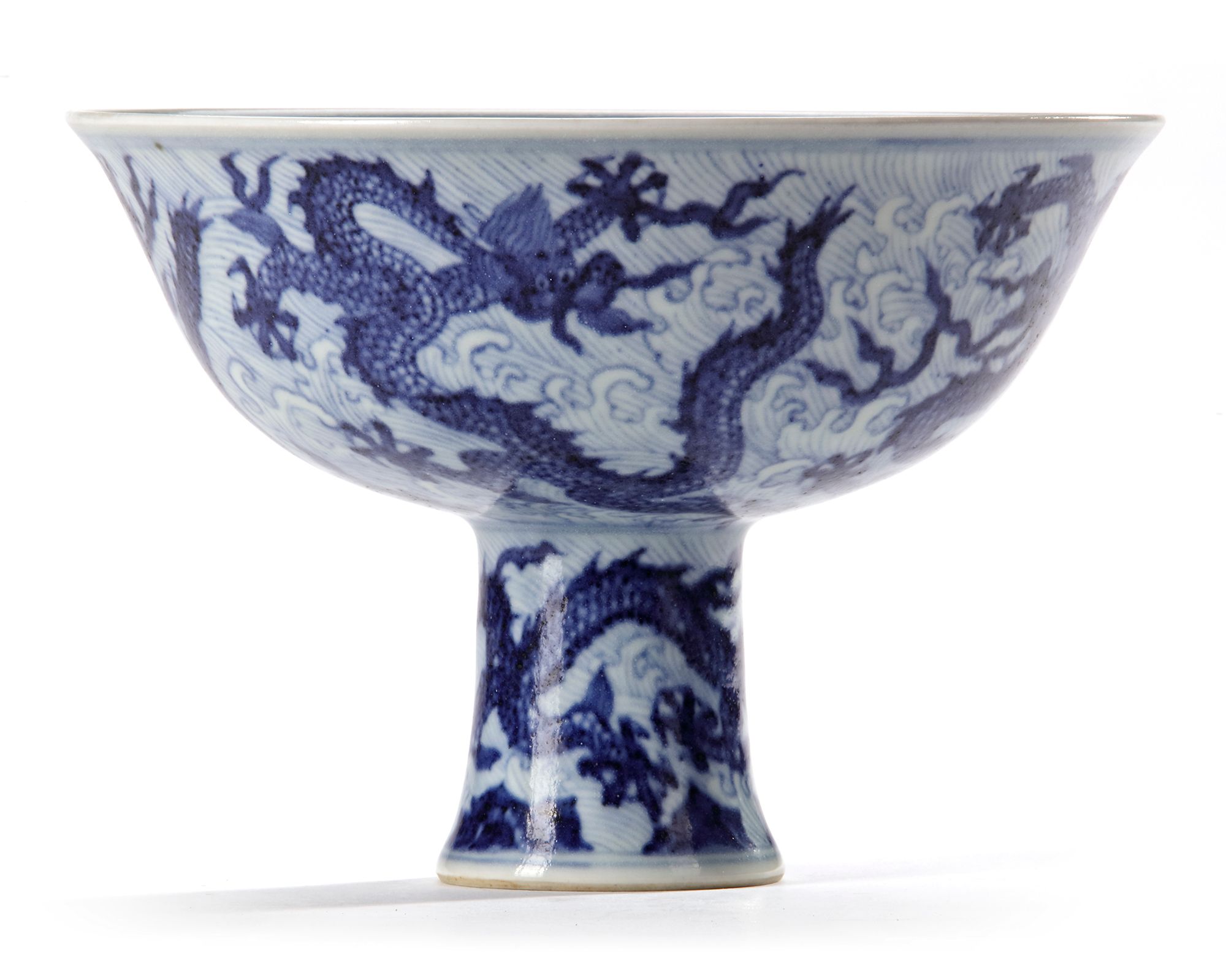 The exterior of the bowl is decorated with four dragons in various positions amongst tumultuous waves. The high foot is decorated a five clawed dragon amongst waves crushing on rocks to the base, the interior with an apocryphal Xuande mark.