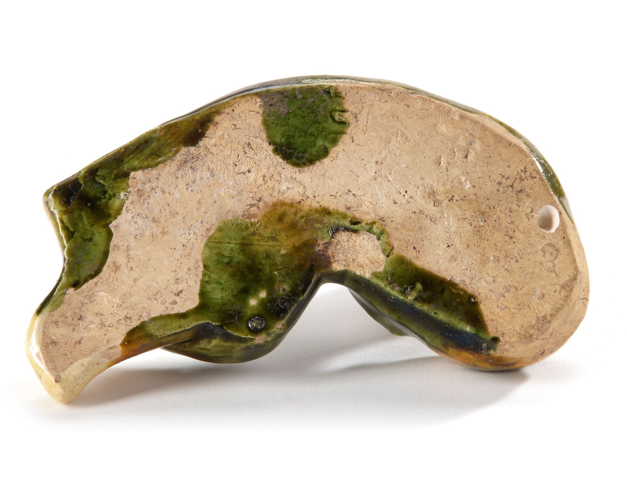 A sancai brushrest in the form of a recumbent boy, resting both his hands on a drum-shaped box. The boy is dressed in loosely fitting robes and has his legs crossed. He lifts his head, which has a smiling expression and has finely detailed features. The figure is covered in green, amber and cream glazes. The base is largely uncovered, showing the finely grained ware, burnt a subtle grey colour.