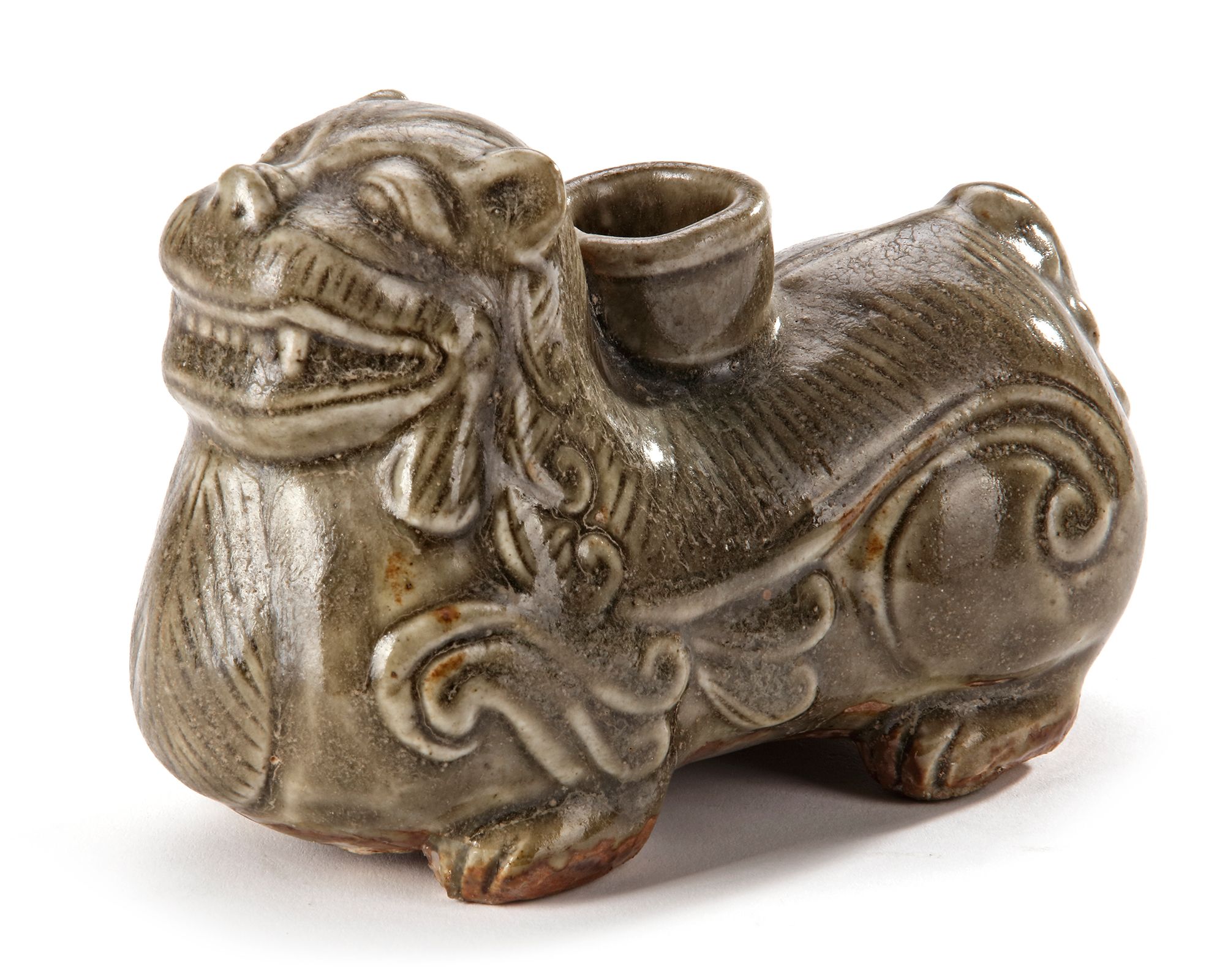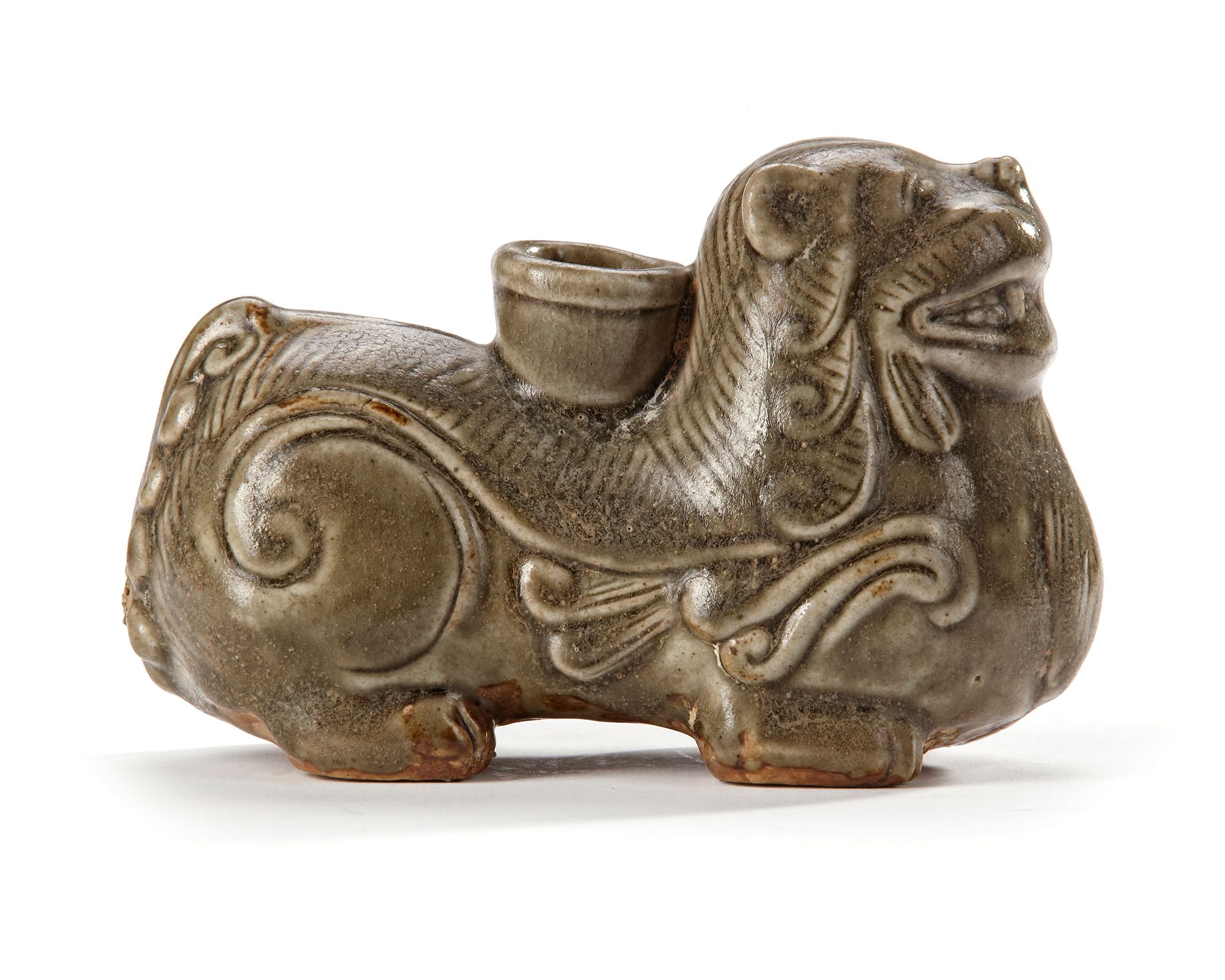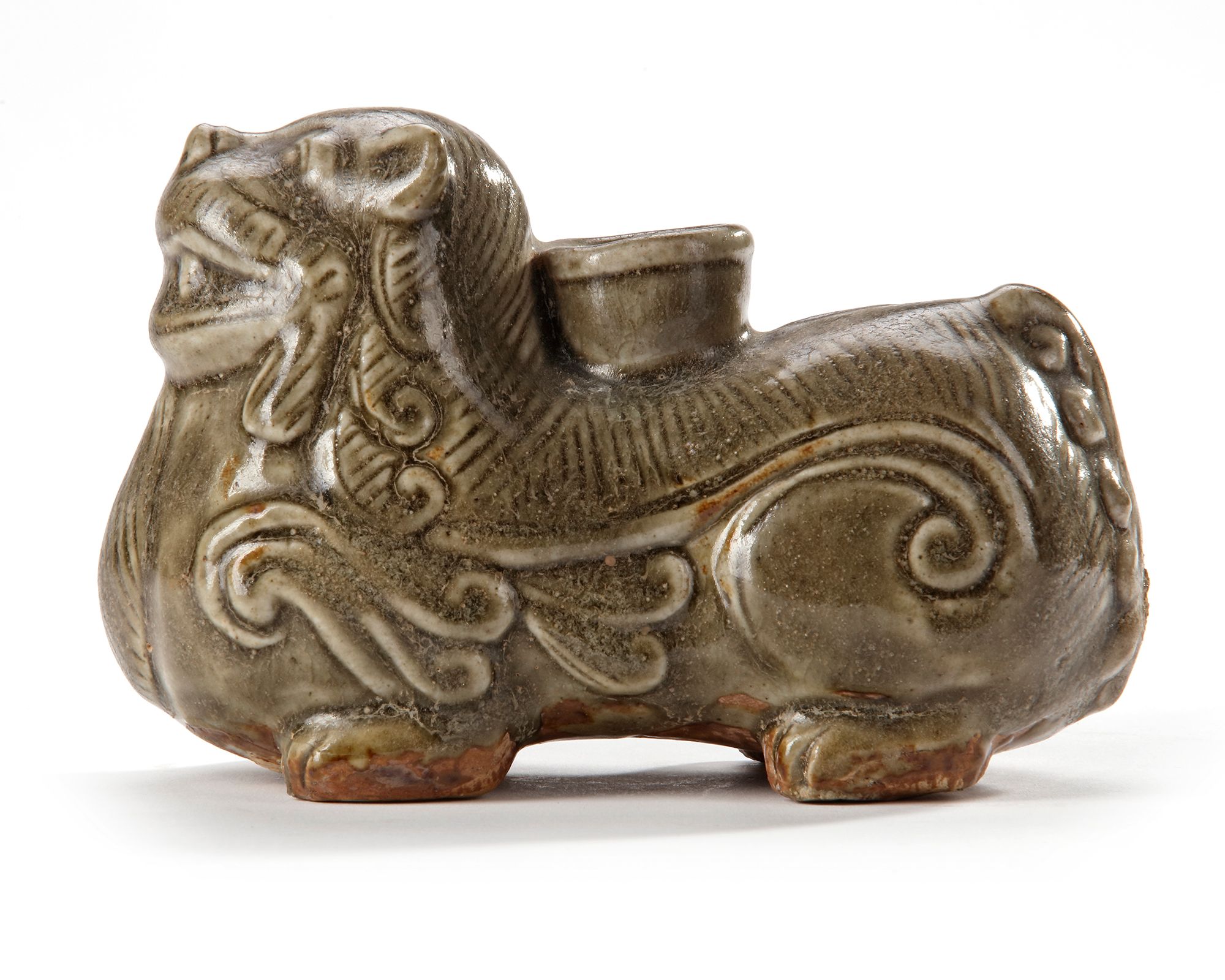 A Chinese yueyao vessel modelled in the form of crouching mythical beast, on short legs tucked beneath the body, the broad snouted head with fangs revealed, nostrils flared and large eyes, raised and facing forward, the details in linear relief with similarly marked beard and tufts of fur along its flanks, the long mane falling to either side, along its back with a narrow flared nozzle projecting in the centre, and its fluffy tail falling behind, the whole thinly applied in a characteristic greenish green glaze.