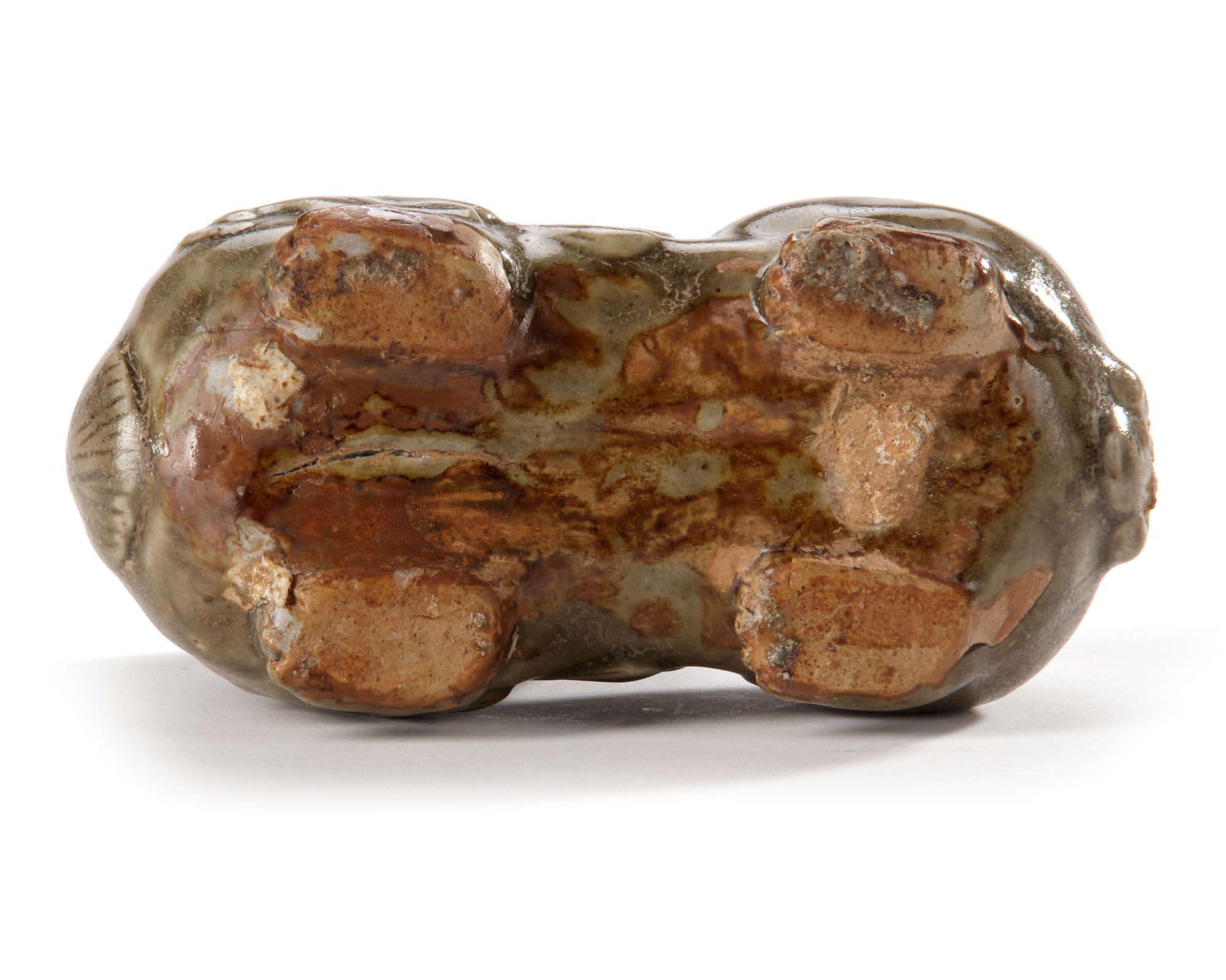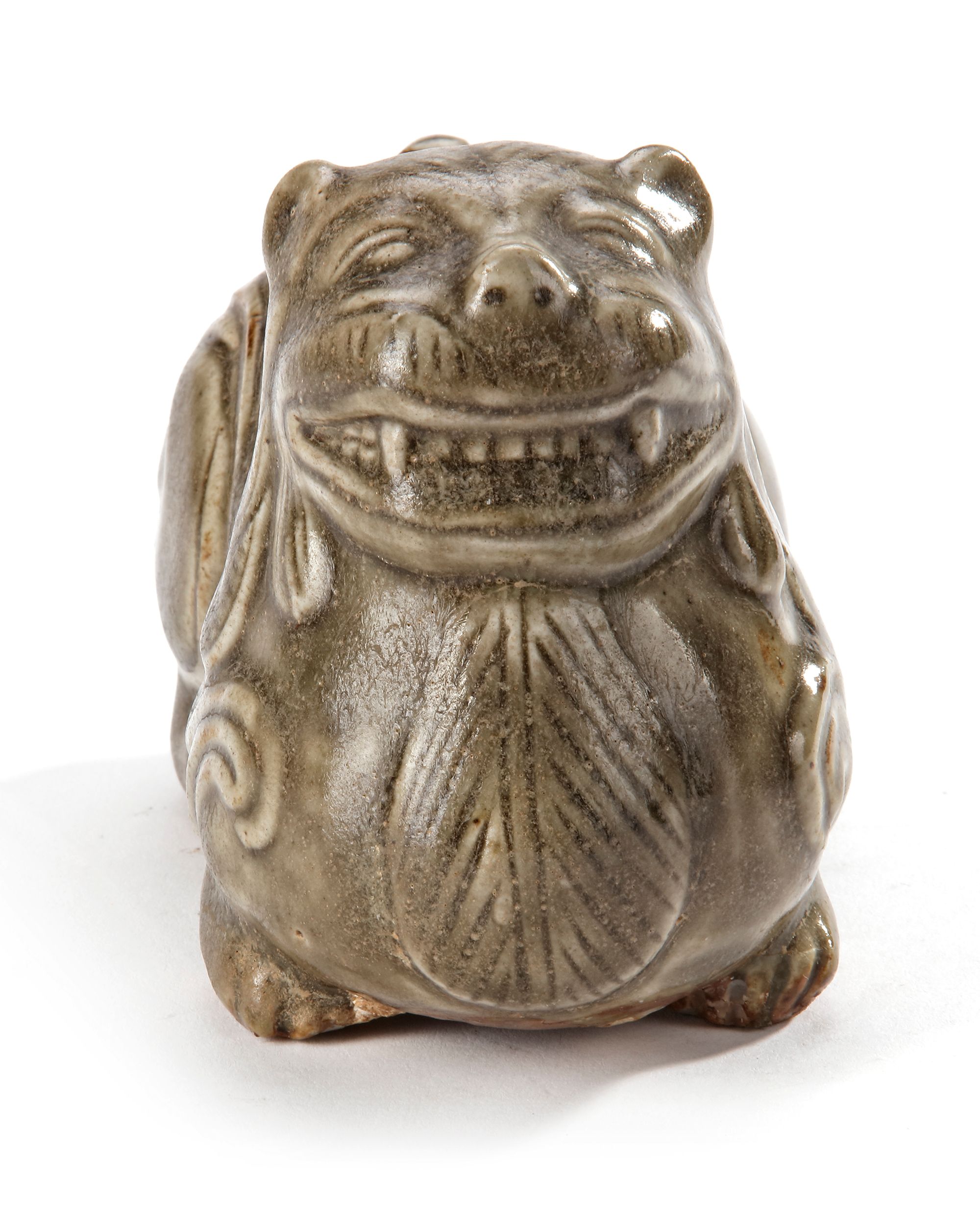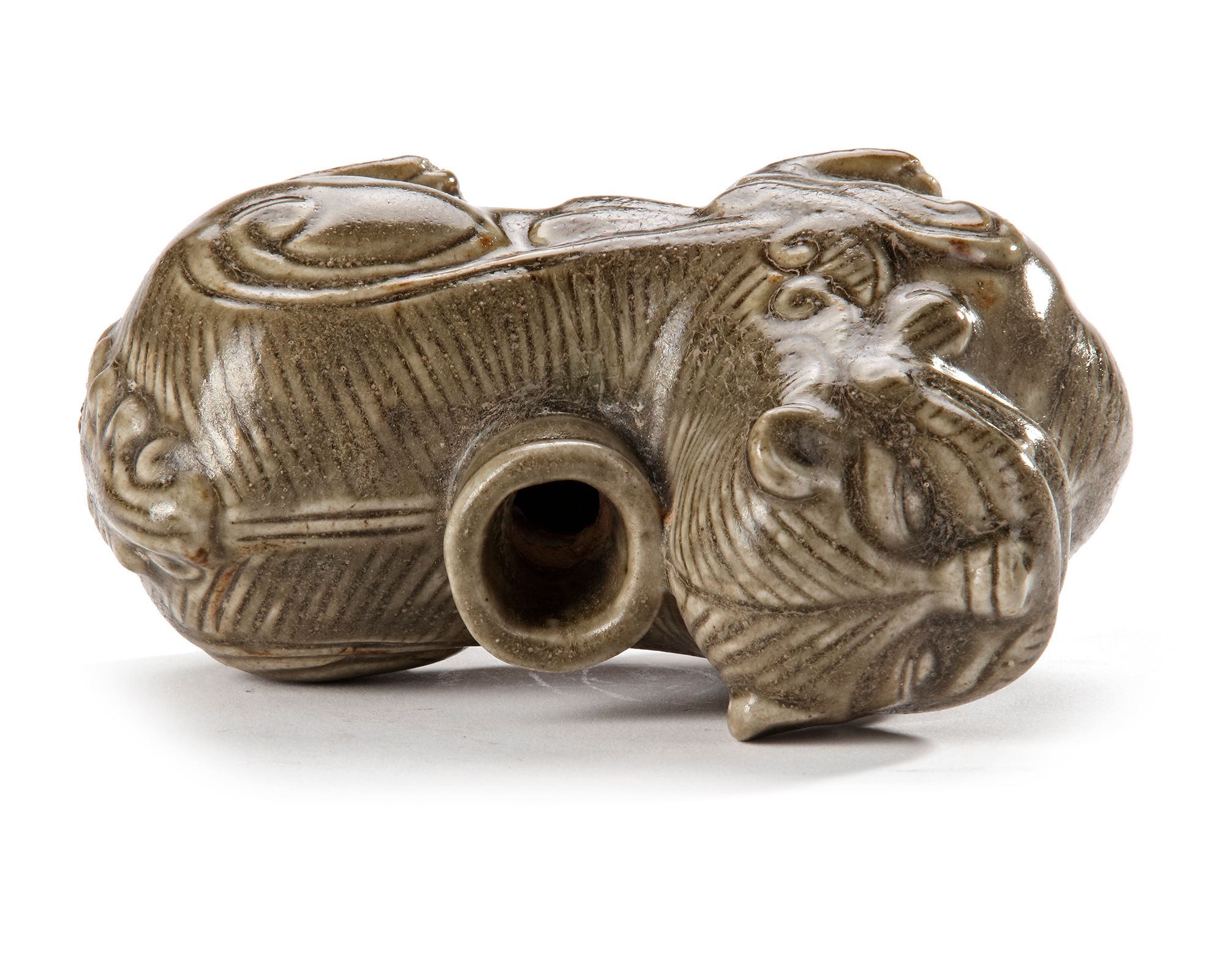 A Chinese yueyao vessel modelled in the form of crouching mythical beast, on short legs tucked beneath the body, the broad snouted head with fangs revealed, nostrils flared and large eyes, raised and facing forward, the details in linear relief with similarly marked beard and tufts of fur along its flanks, the long mane falling to either side, along its back with a narrow flared nozzle projecting in the centre, and its fluffy tail falling behind, the whole thinly applied in a characteristic greenish green glaze.