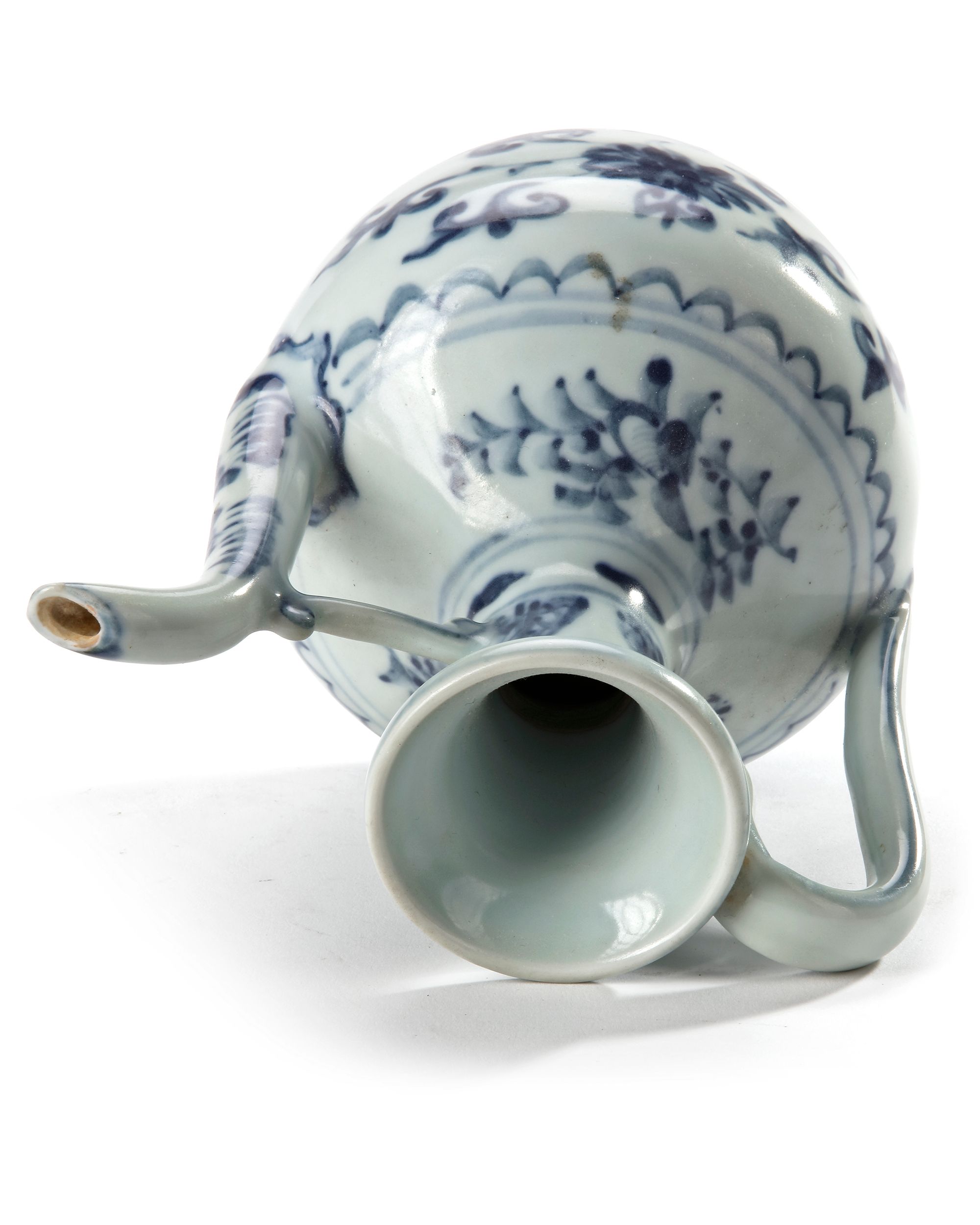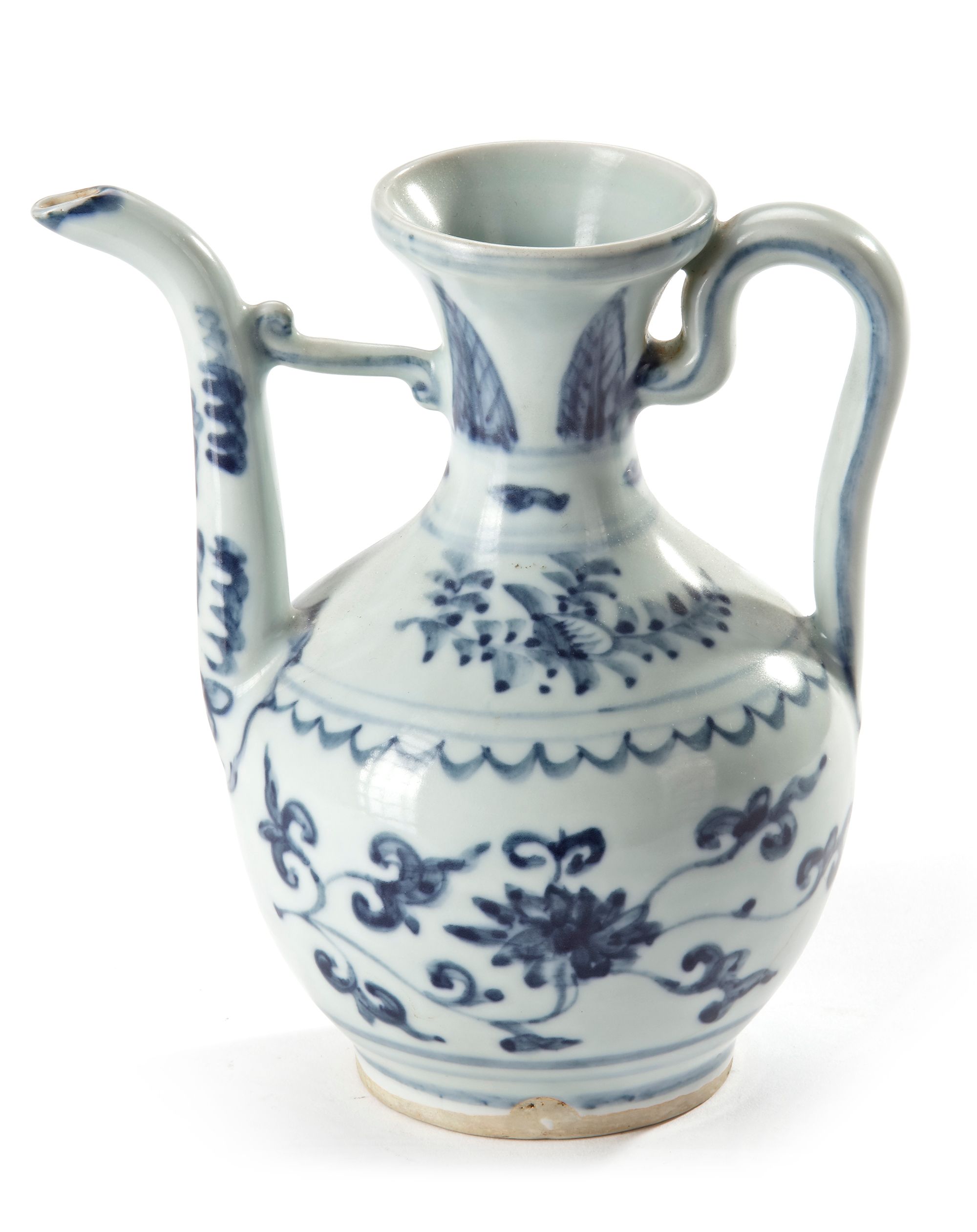 A Chinese porcelain ewer painted with different flowers between line borders and a collar of petals on the neck, the slender spout filled with scrolls and attached to the vessel by a shaped strap, set opposite the arched loop handle.