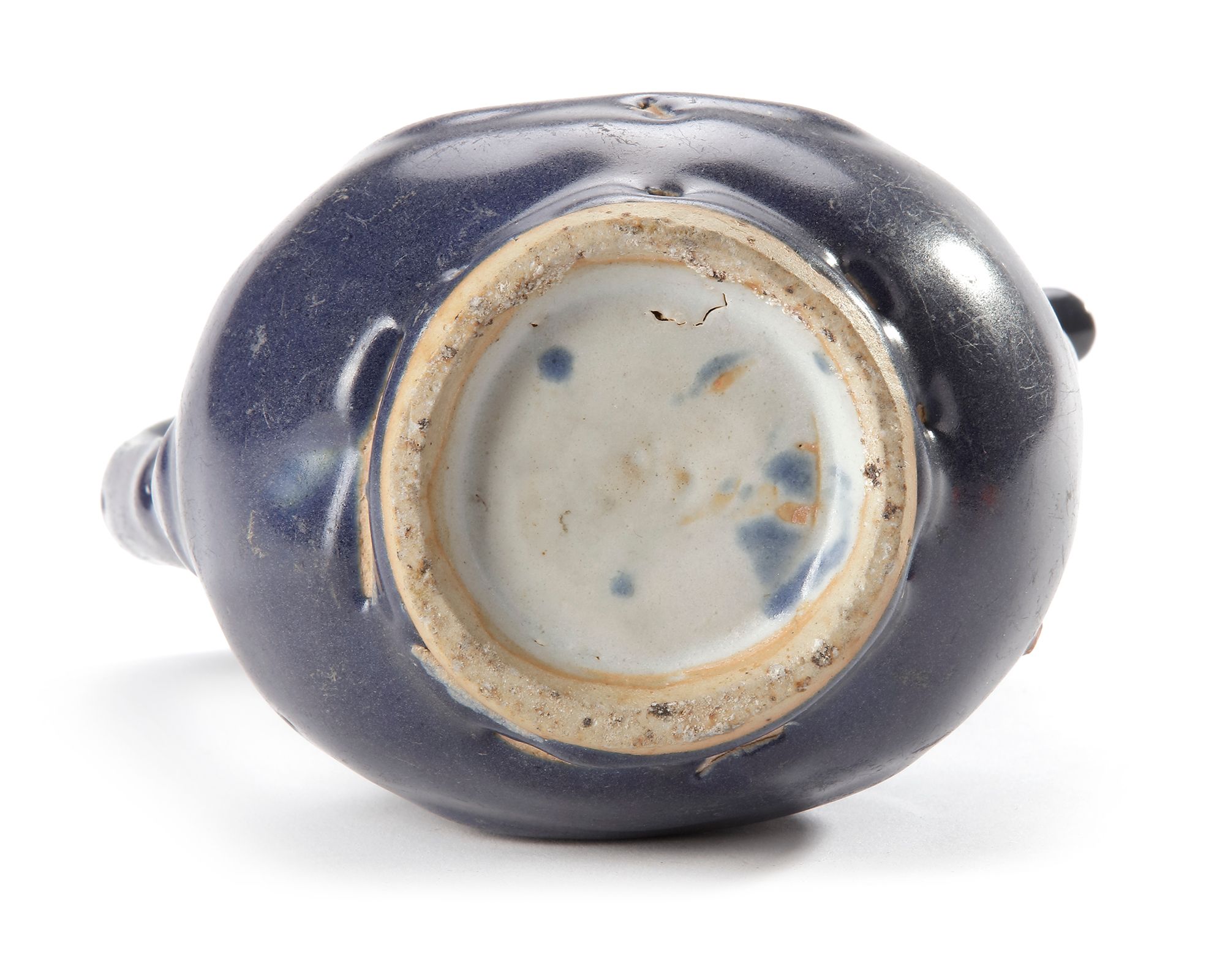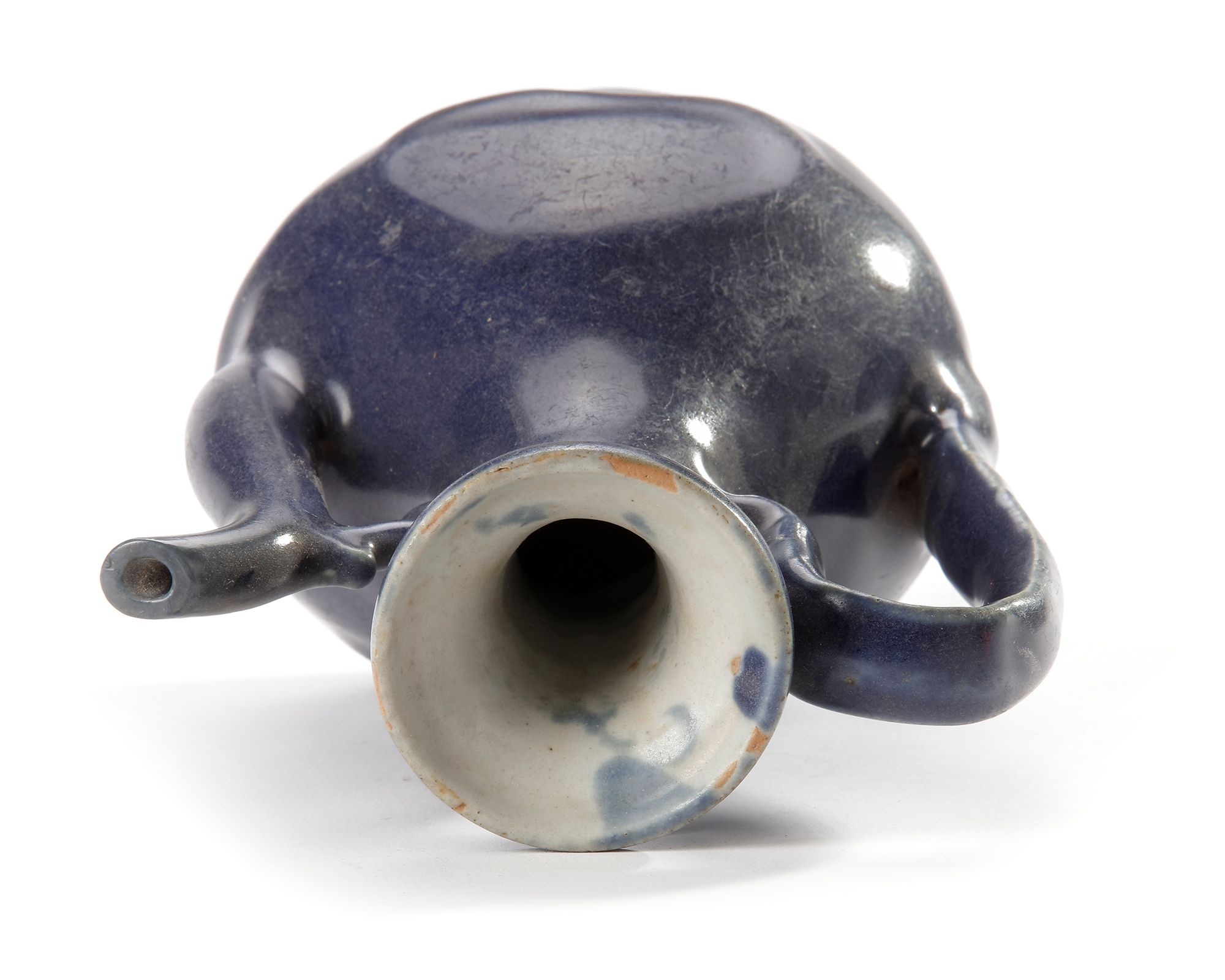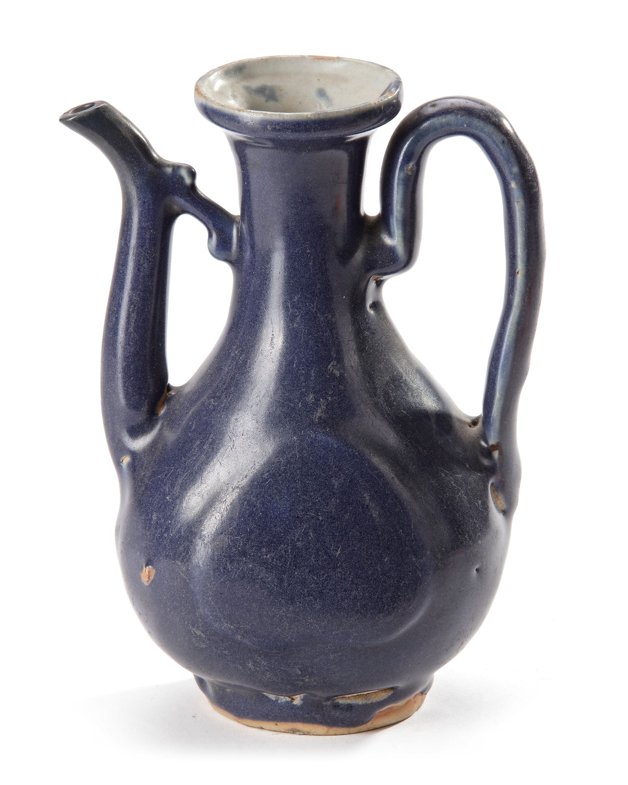 The pear-shaped body tapering up to a narrow neck and an everted rim, set on one side with a curved spout joined to the neck by a cloud-shaped strut, opposite the arched strap handle entirely covered with a cobalt blue glaze with a heart shaped medallion on each flattened side. The interior of the mouth rim and the base are glazed white.