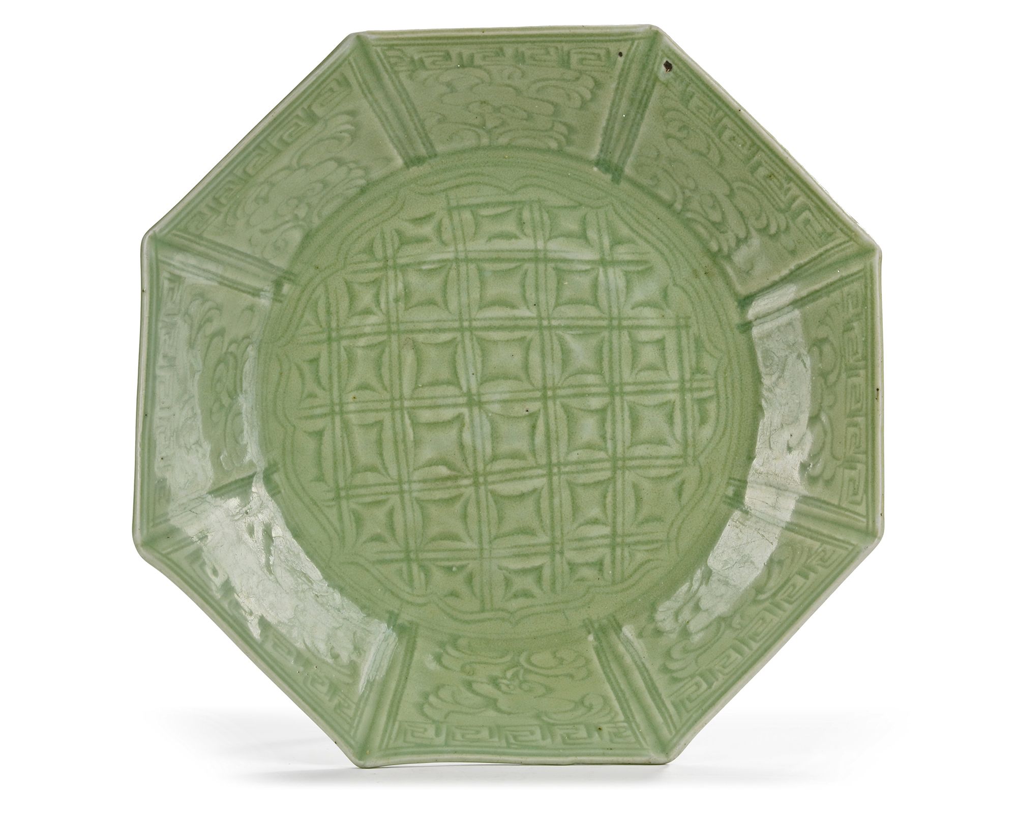A Chinese celadon dish of octagonal shape, decorated to the interior with a diaper pattern within a panel encised on the everted rim by radiating panels each enclosing a Lingzhi spray freely carved beneath a key fret chain, overlapping leaves and petals on the underside, covered overall with a sea green glaze.