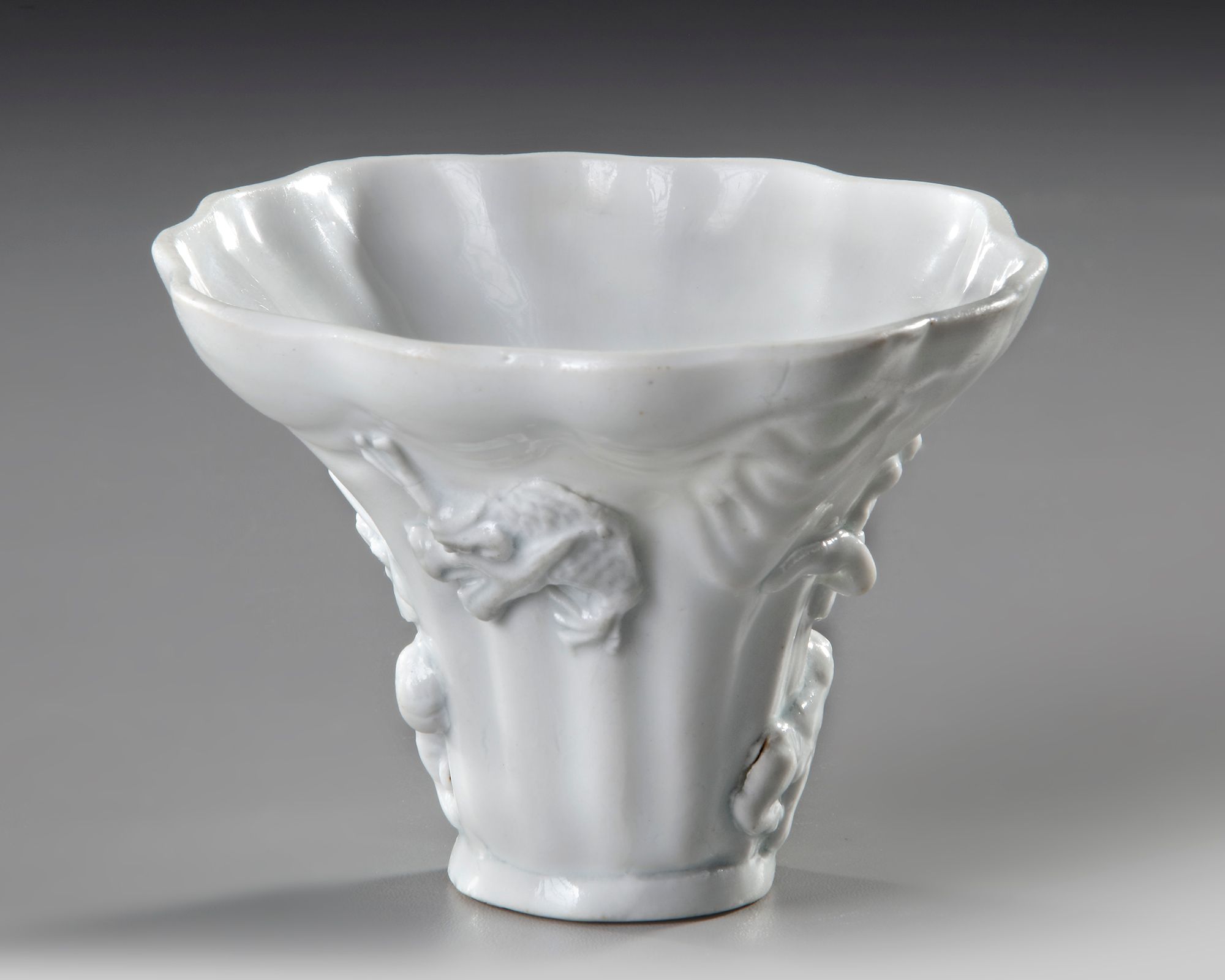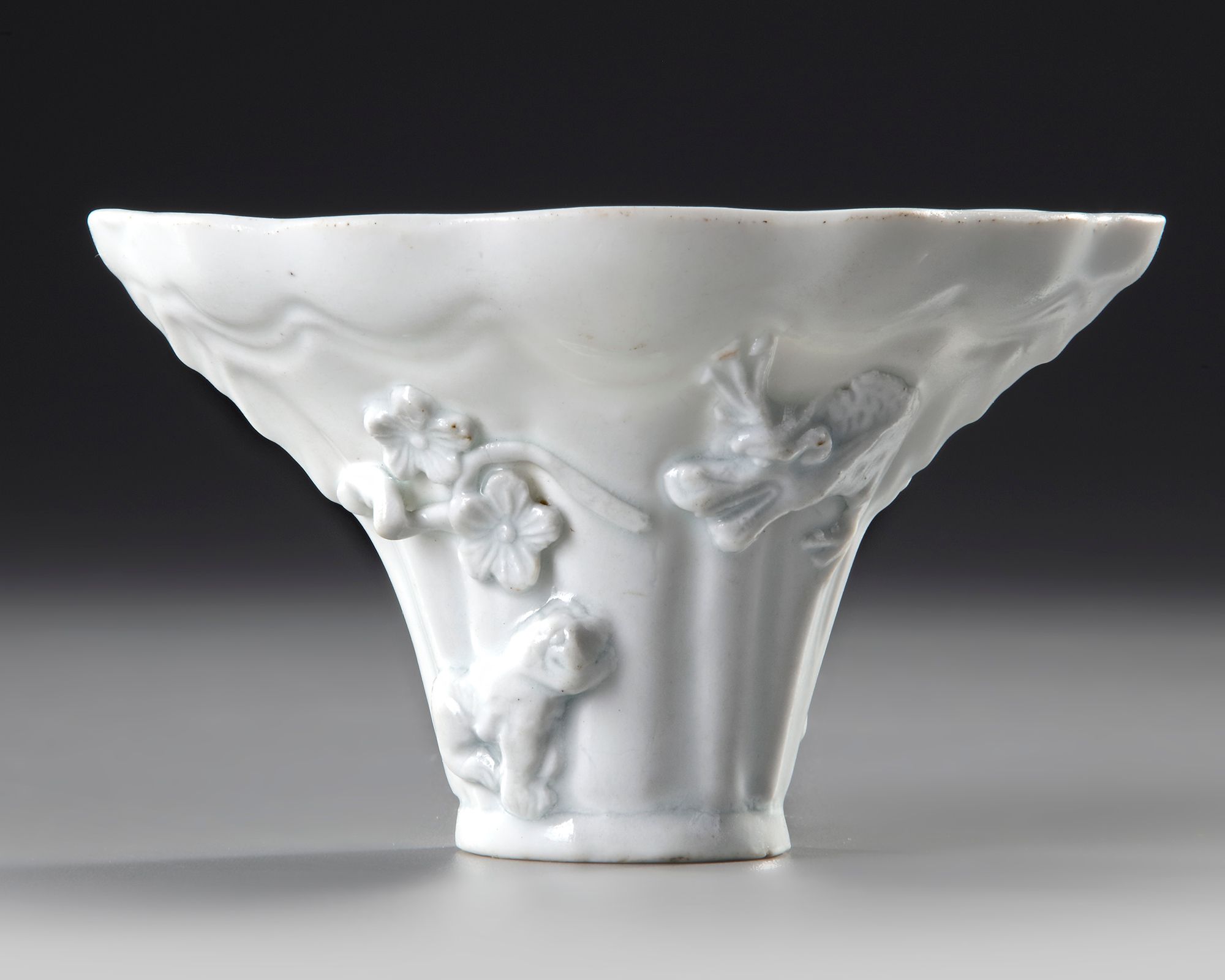 The tapered vessel is moulded in the form of a rhinoceros horn, the sides are decorated with auspicious creatures such as a monkey and a dragon and qilin below prunus and pine.