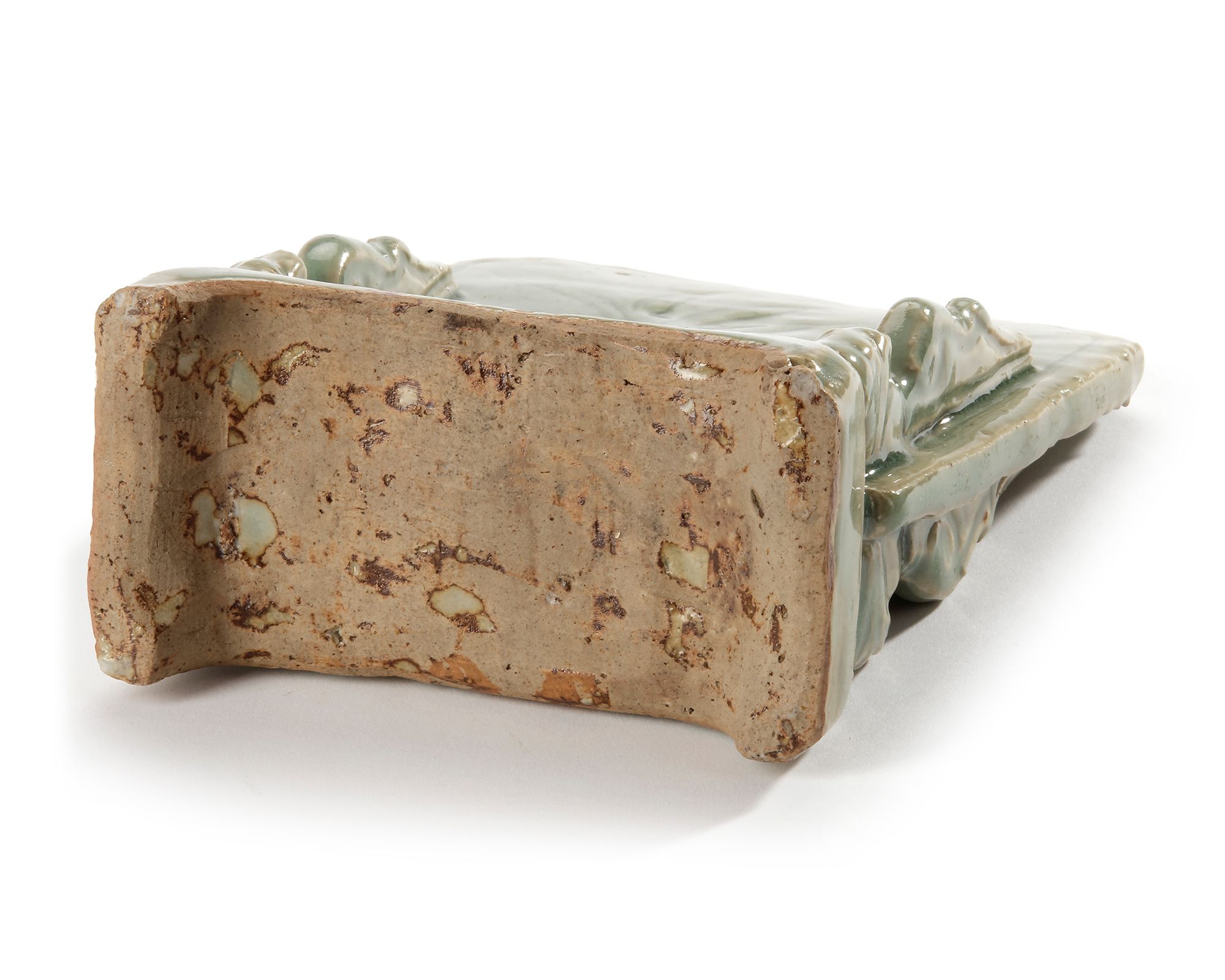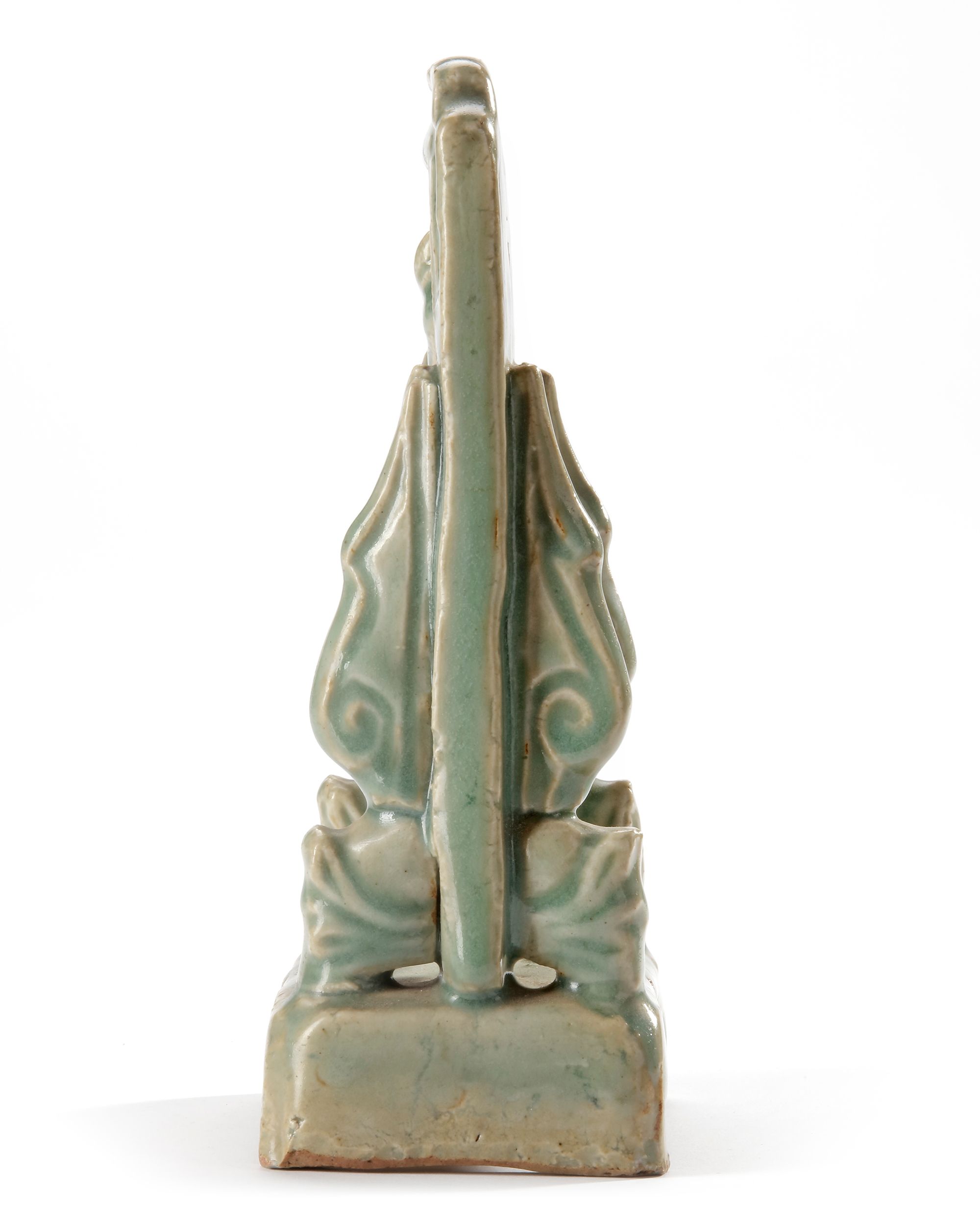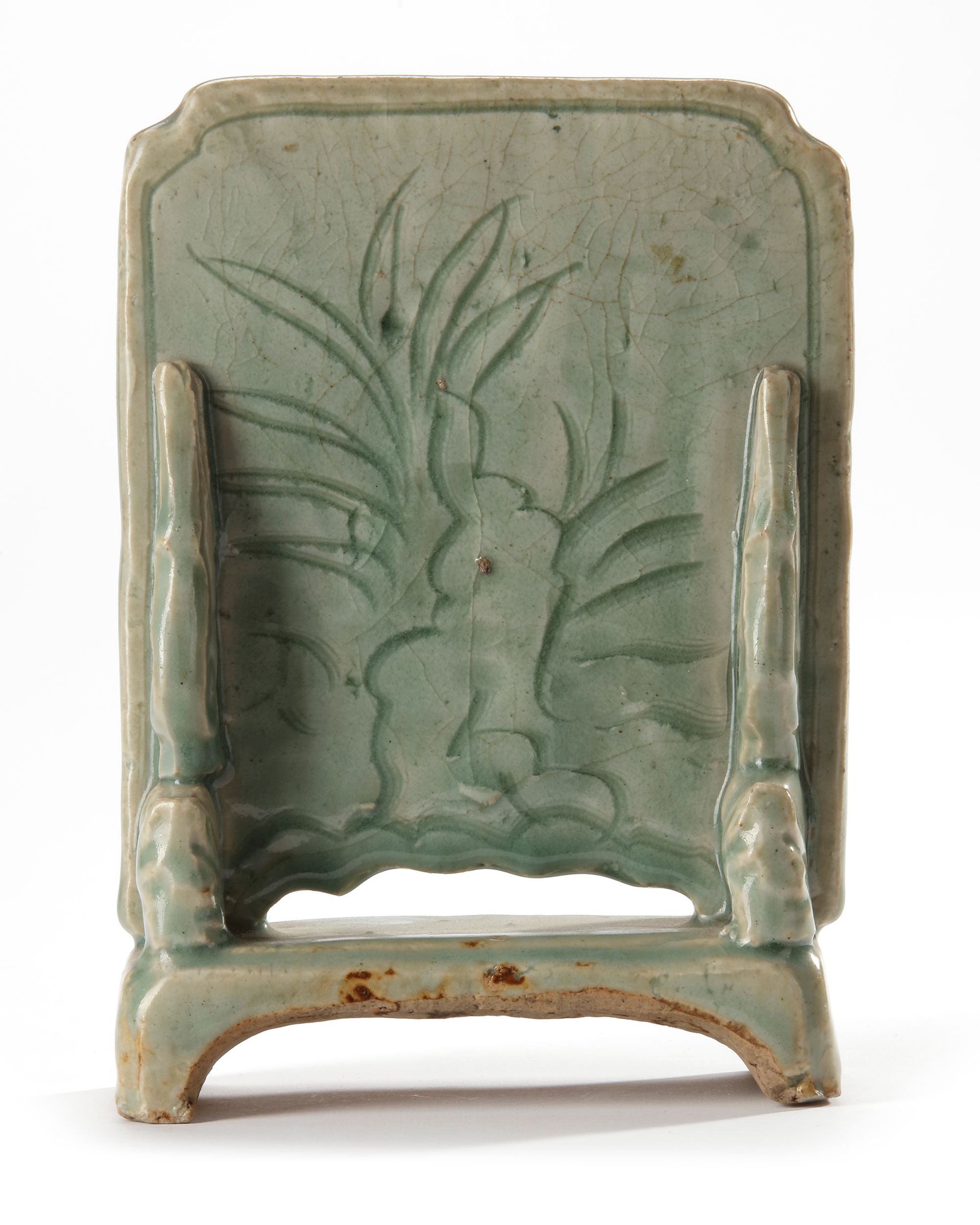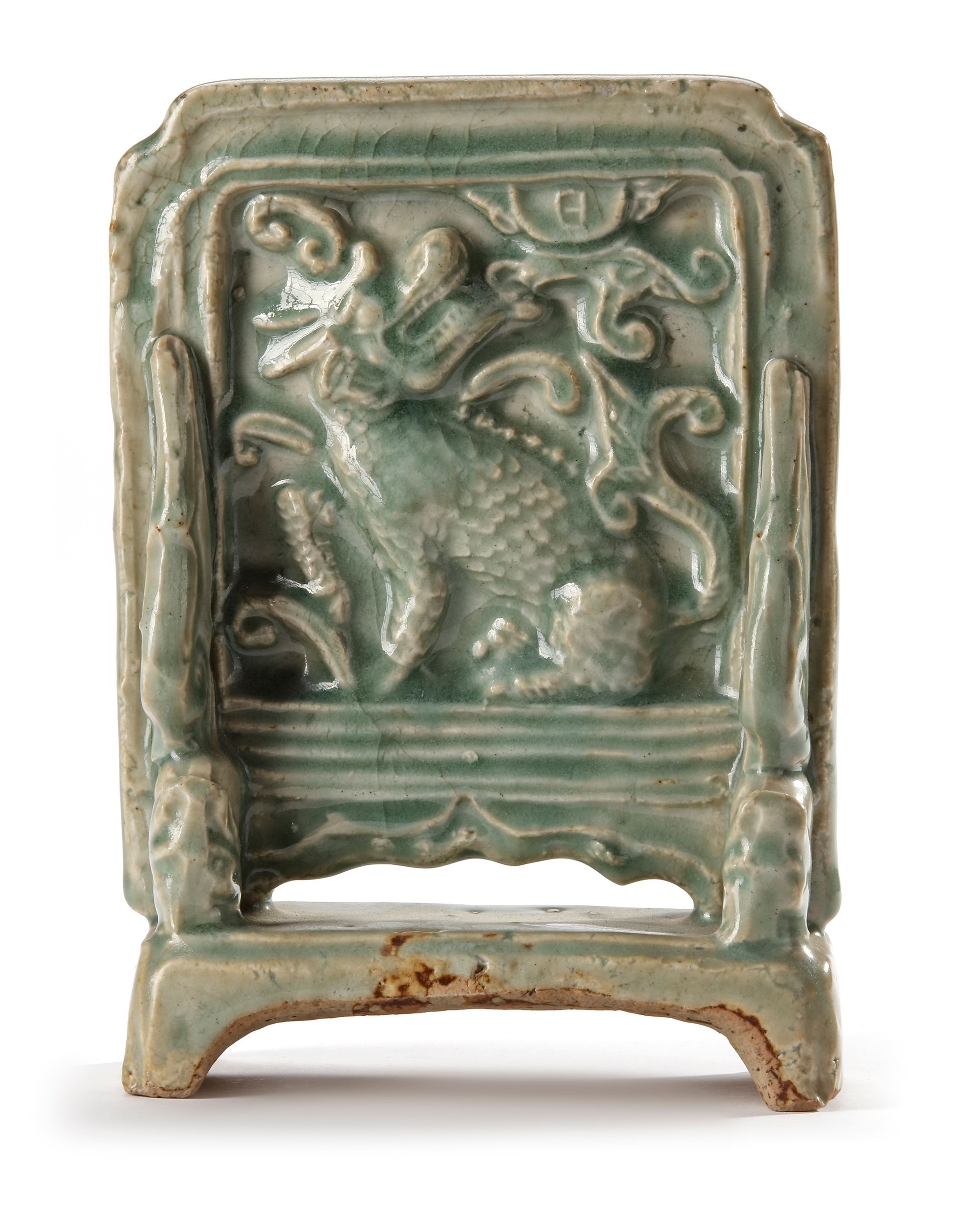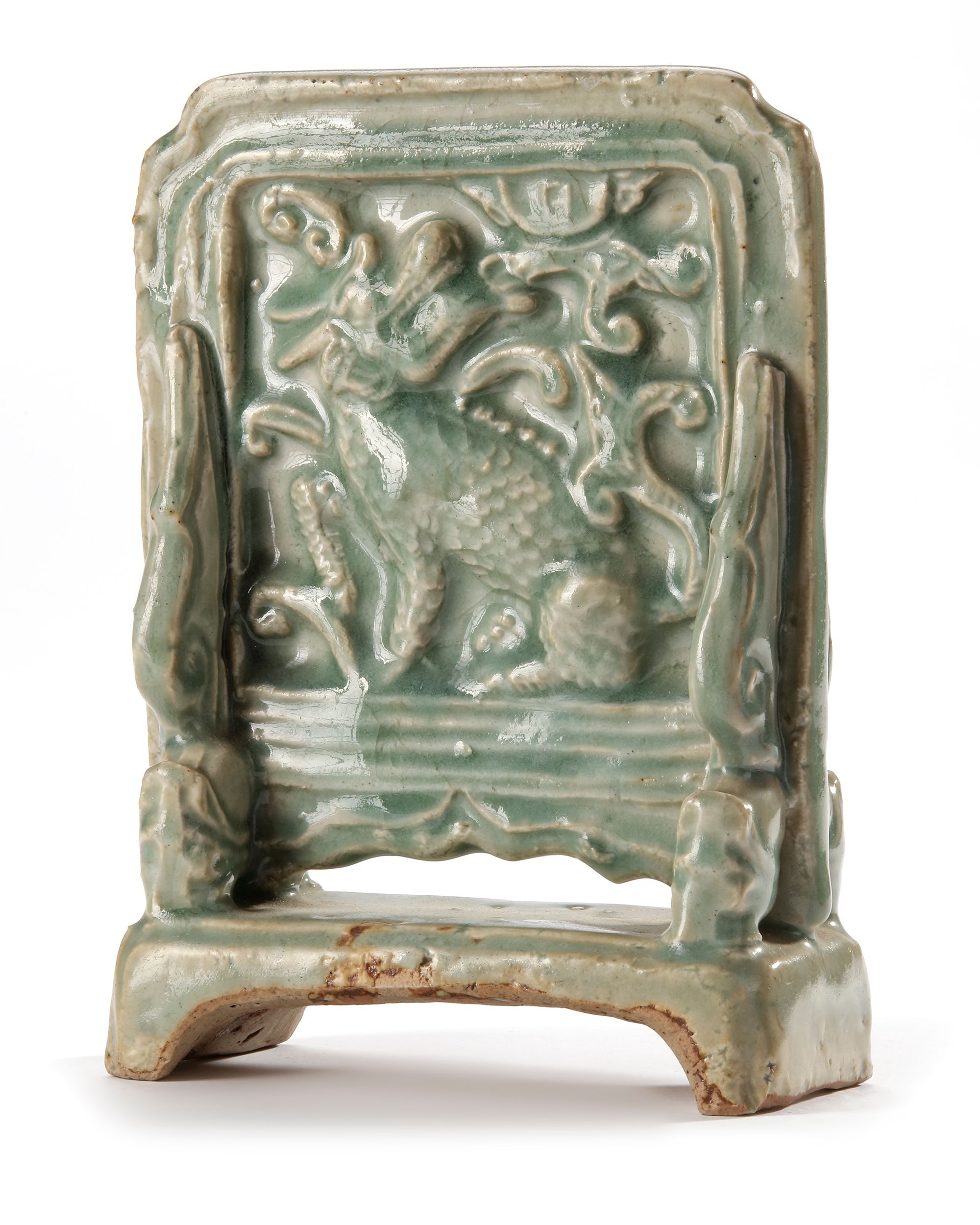 A Chinese table screen moulded on one side in low relief with a seated Qilin looking backwards to a sundisk. The other side with an incised design of a rock and leaves.