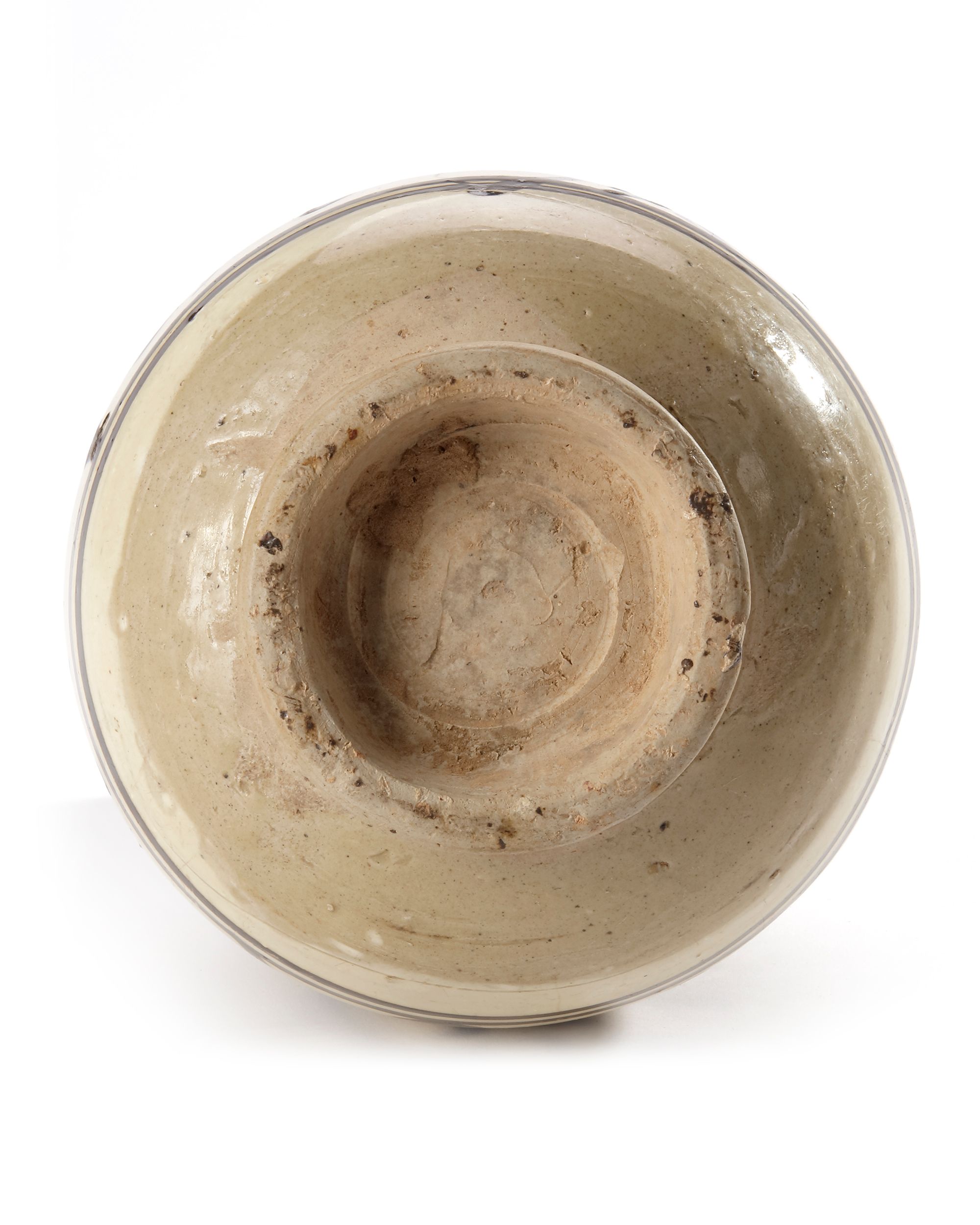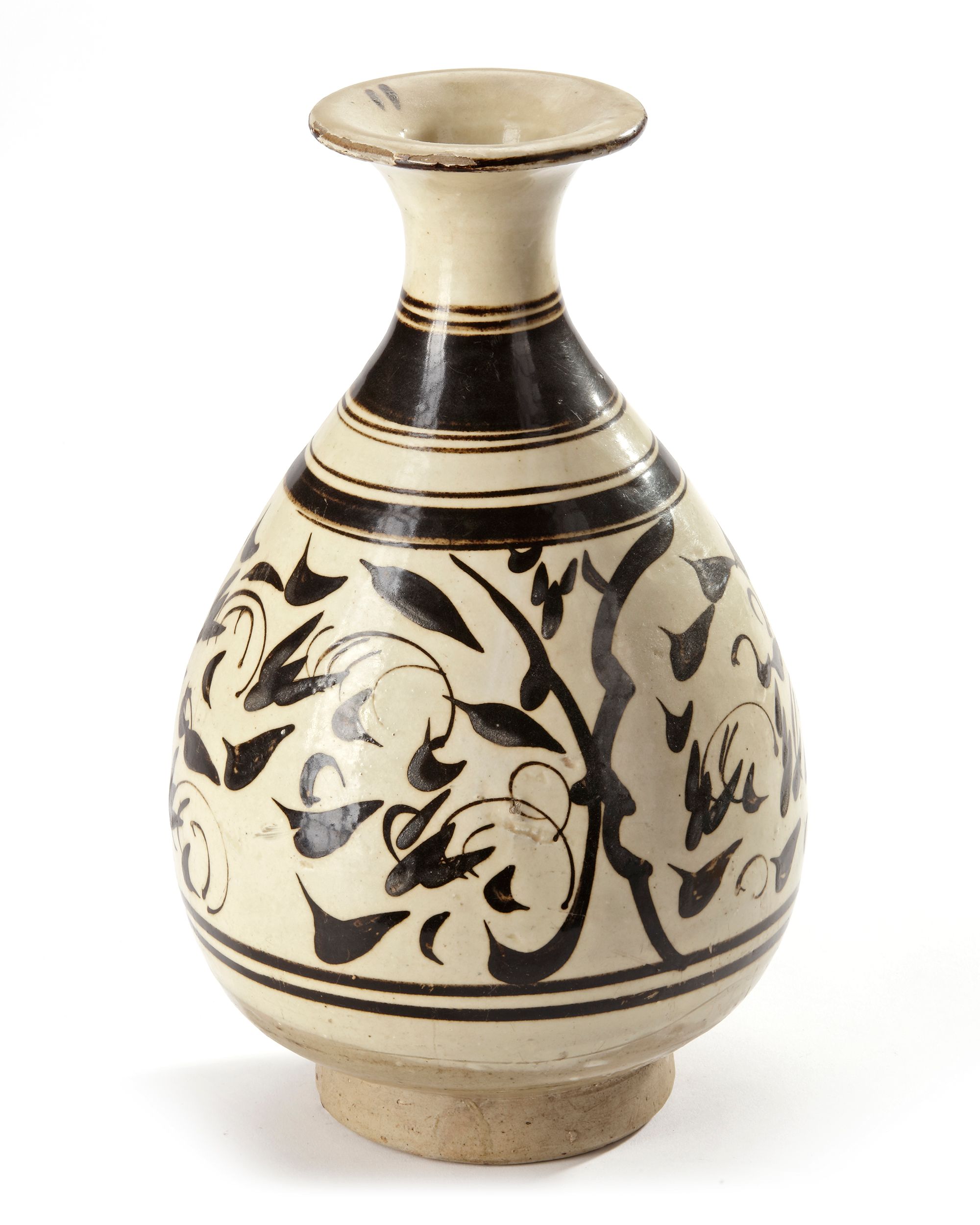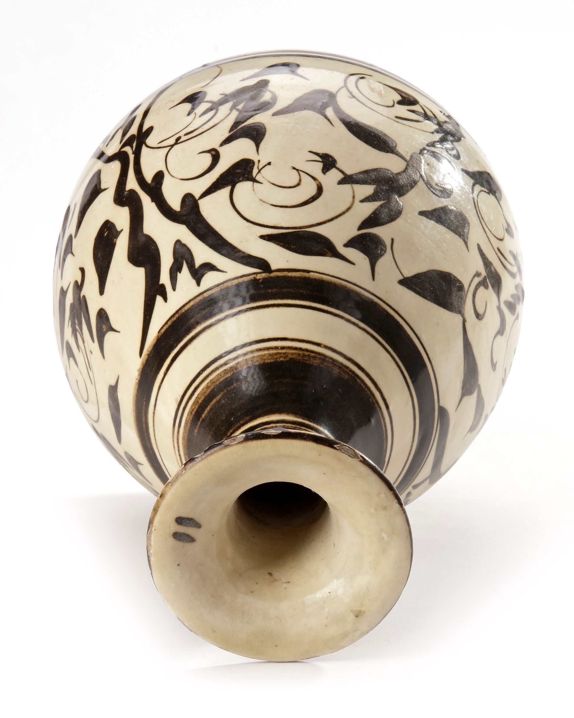 A painted Cizhou baluster vase, the pear-shaped vase surmounted by a narrow waisted neck with trumpet mouth, the granular ware applied with a white slip on the exterior and painted in brown beneath the overall lustrous ivory tinted glaze with stylized foliate sprigs and leaf motifs above a double strip encircling the lower body and below a double broad strip under the neck. The unglazed base reveling the granular ware.
