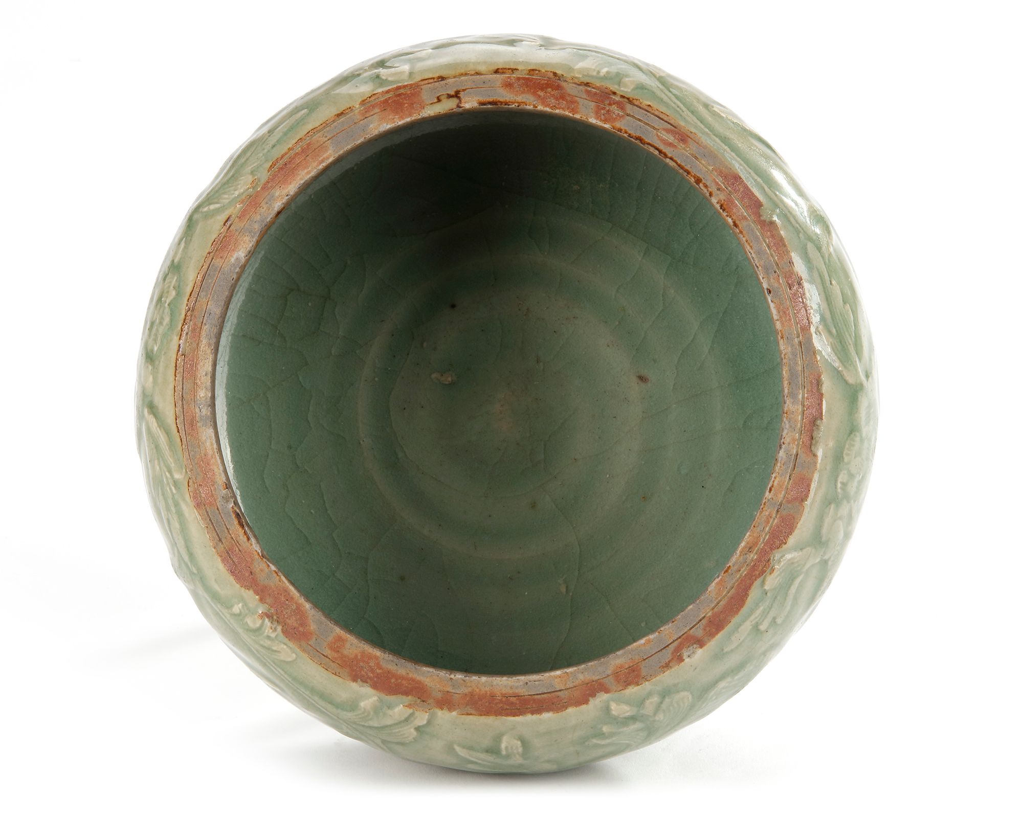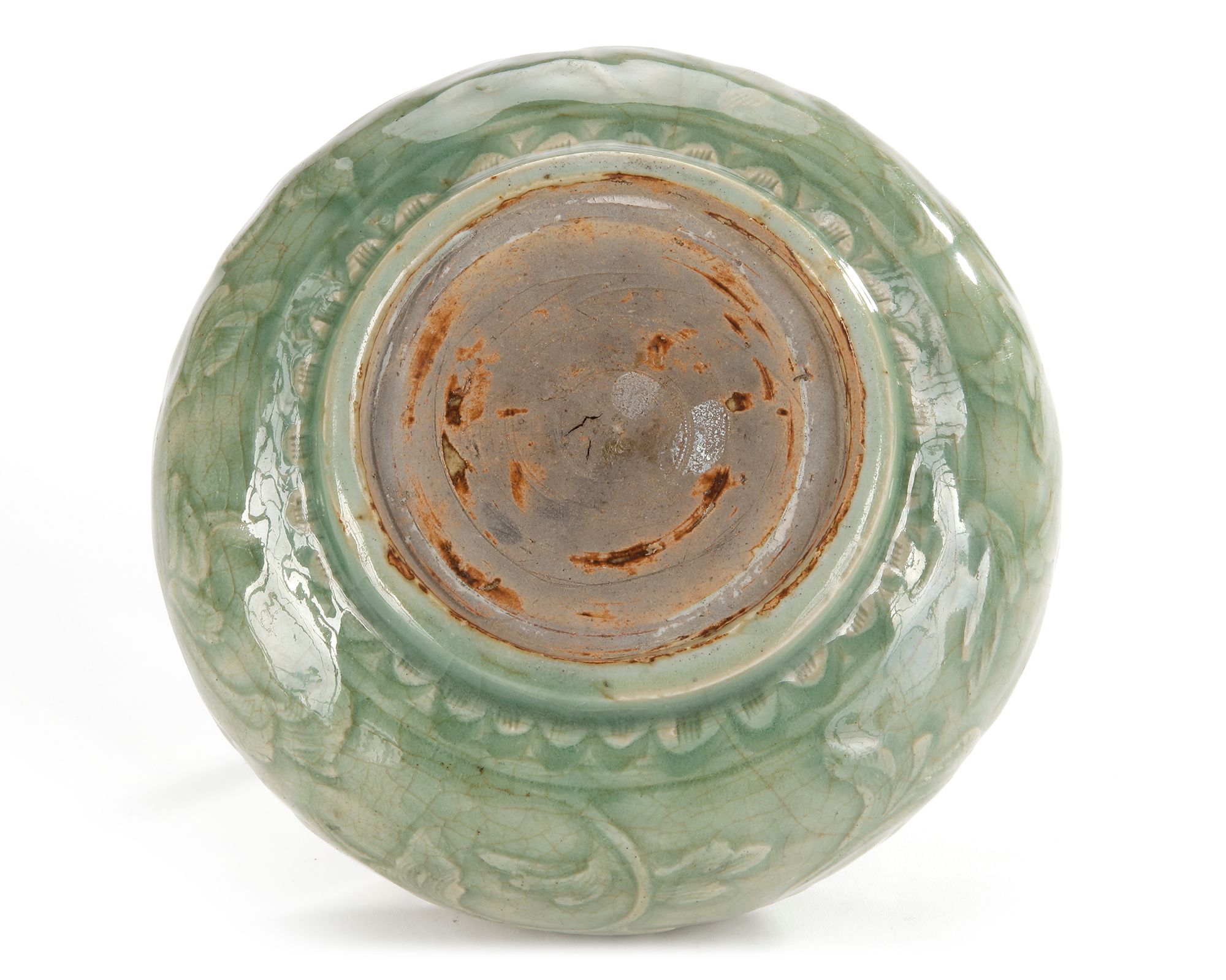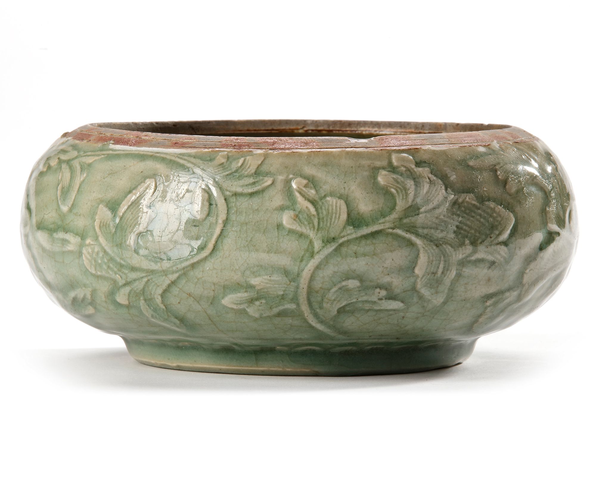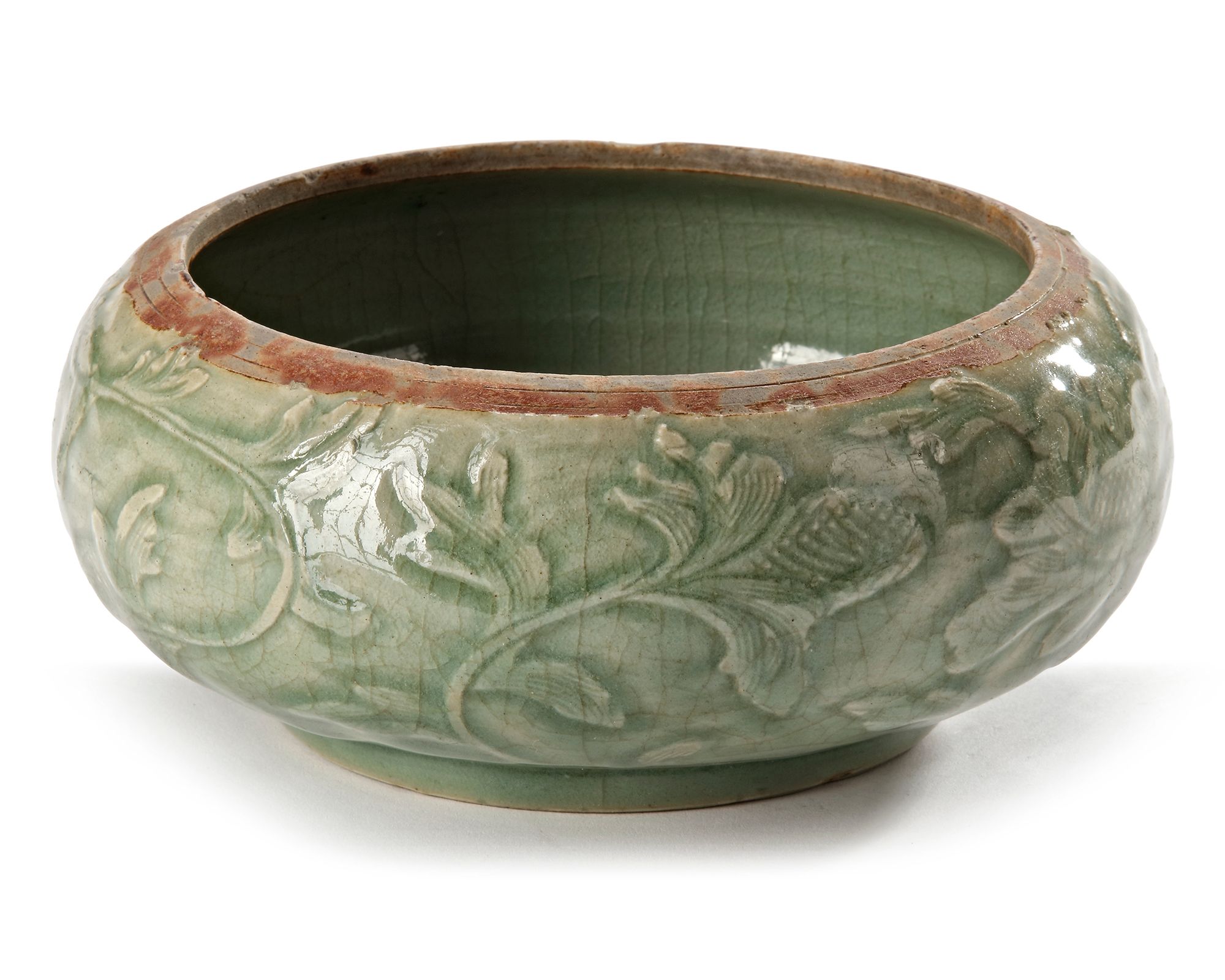 A Chinese celadon bowl with low rounded sides, the exterior carved in relief with peonies and leaves above a carved band of petals around the glaze foot. The rim and base unglazed and burnt orange in the firing.