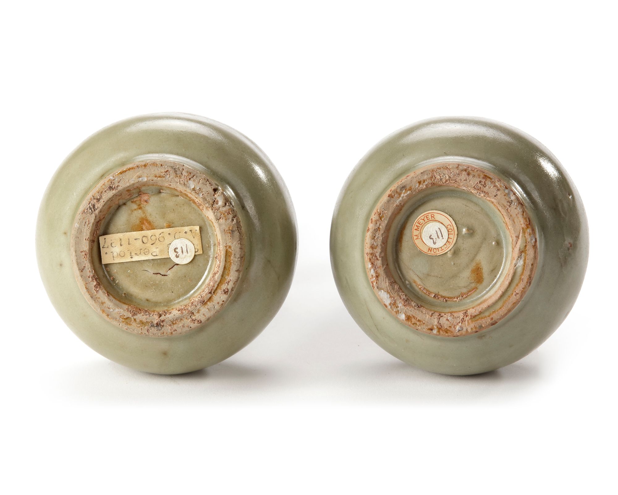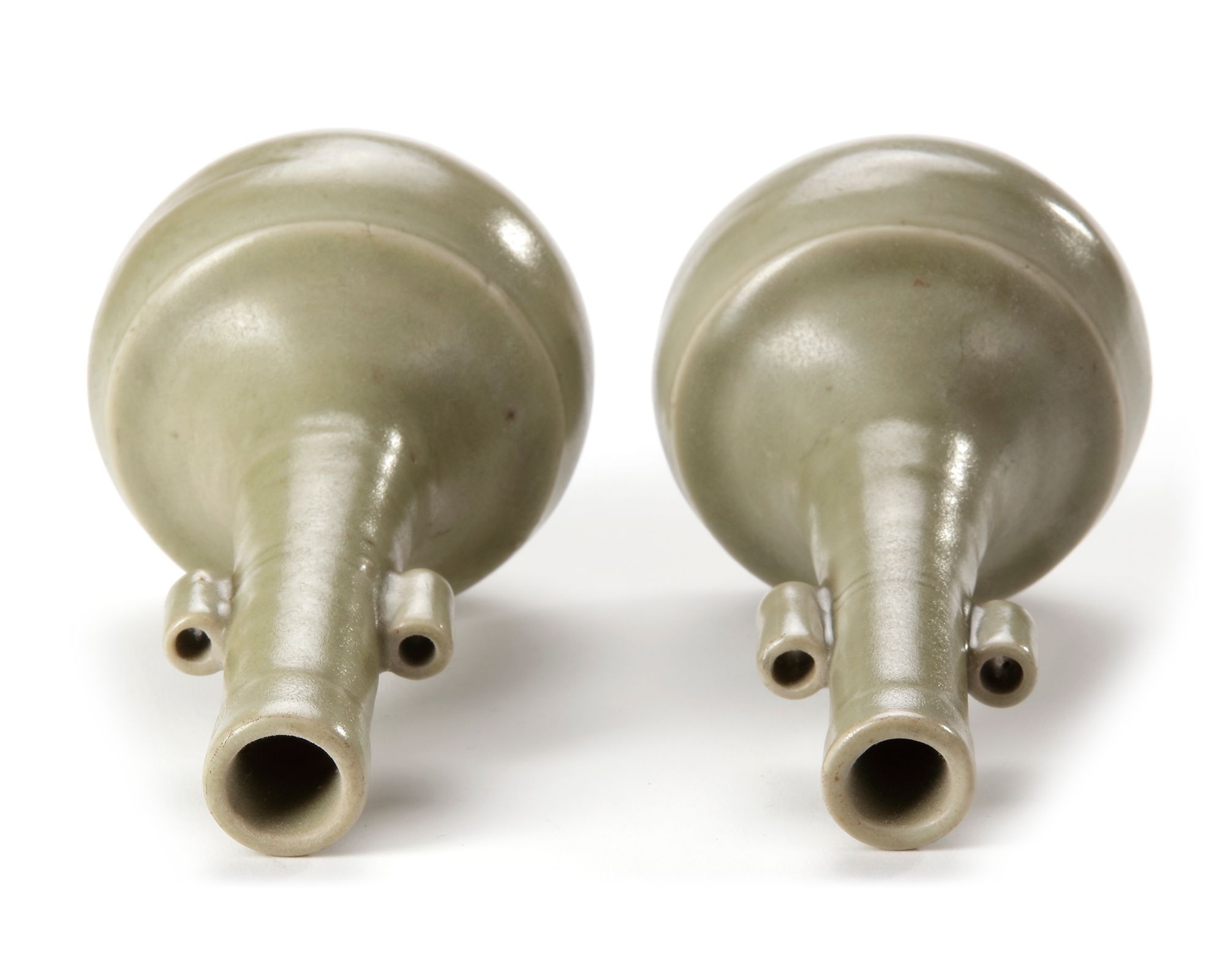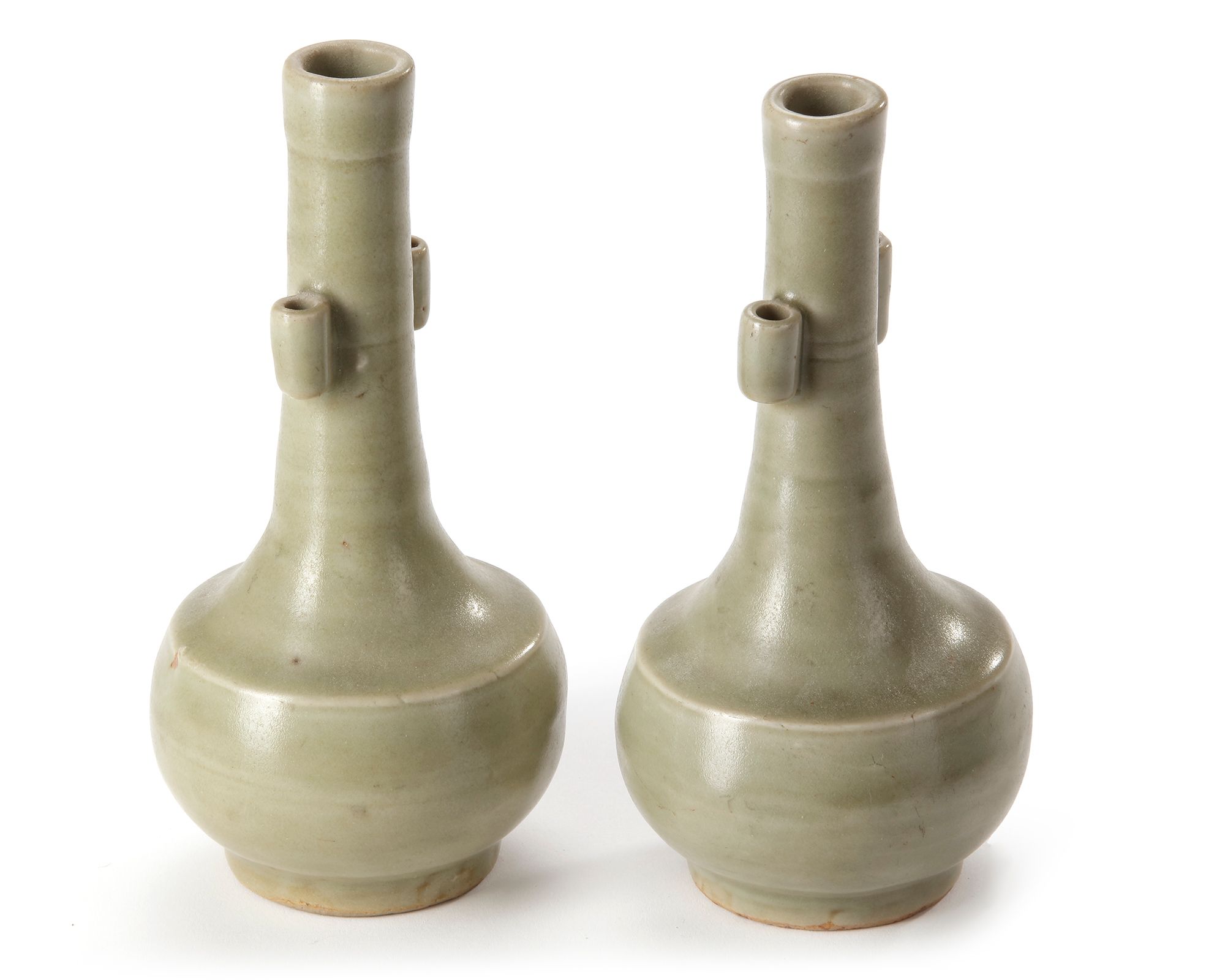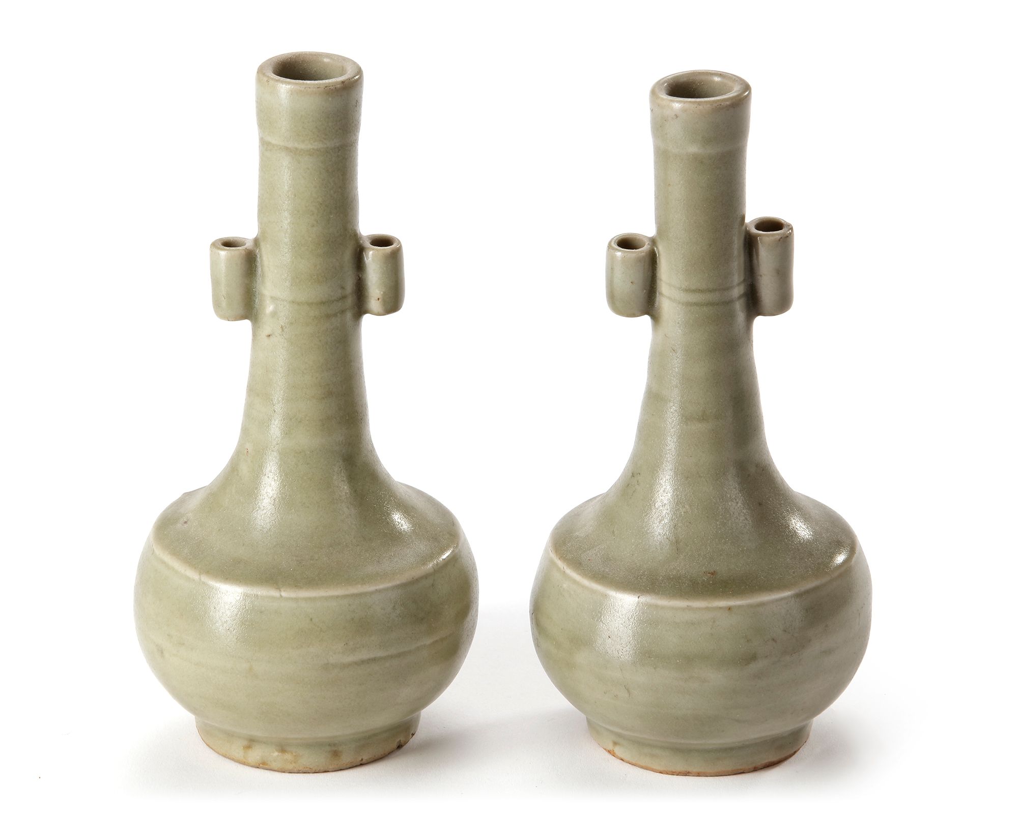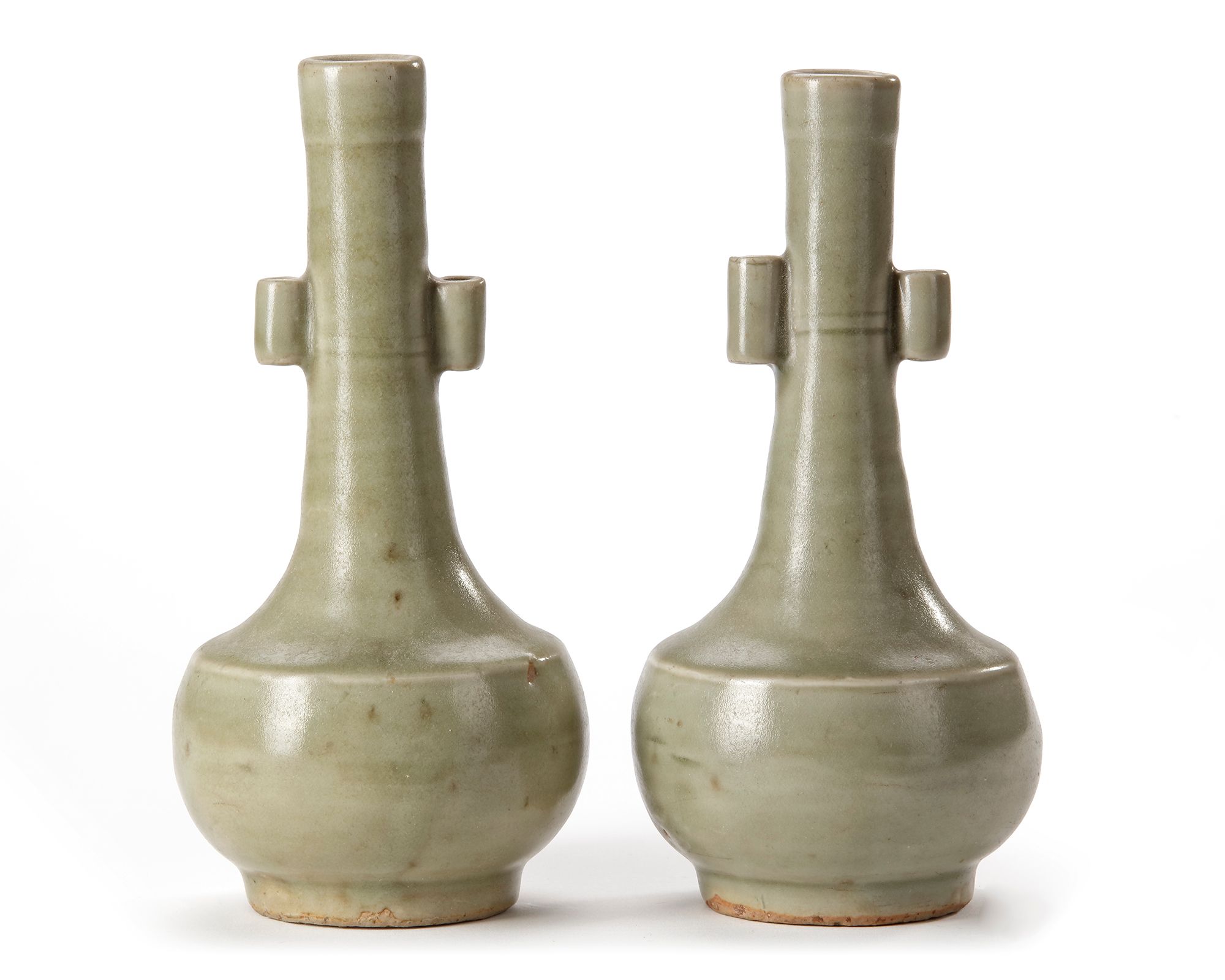 A PAIR OF CHINESE LONGQUAN BOTTLE VASES, LATE SONG DYNASTY 13TH CENTURY