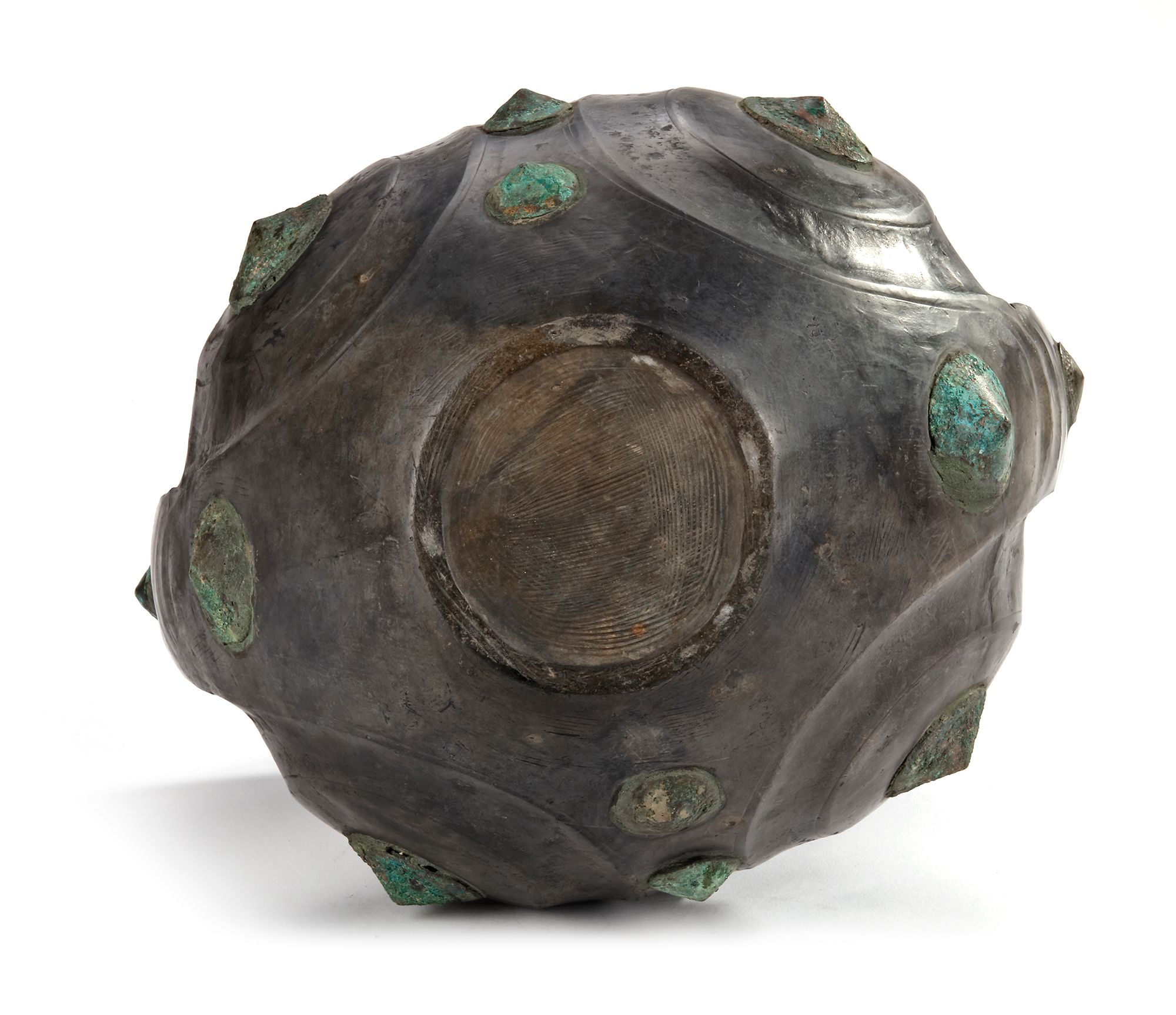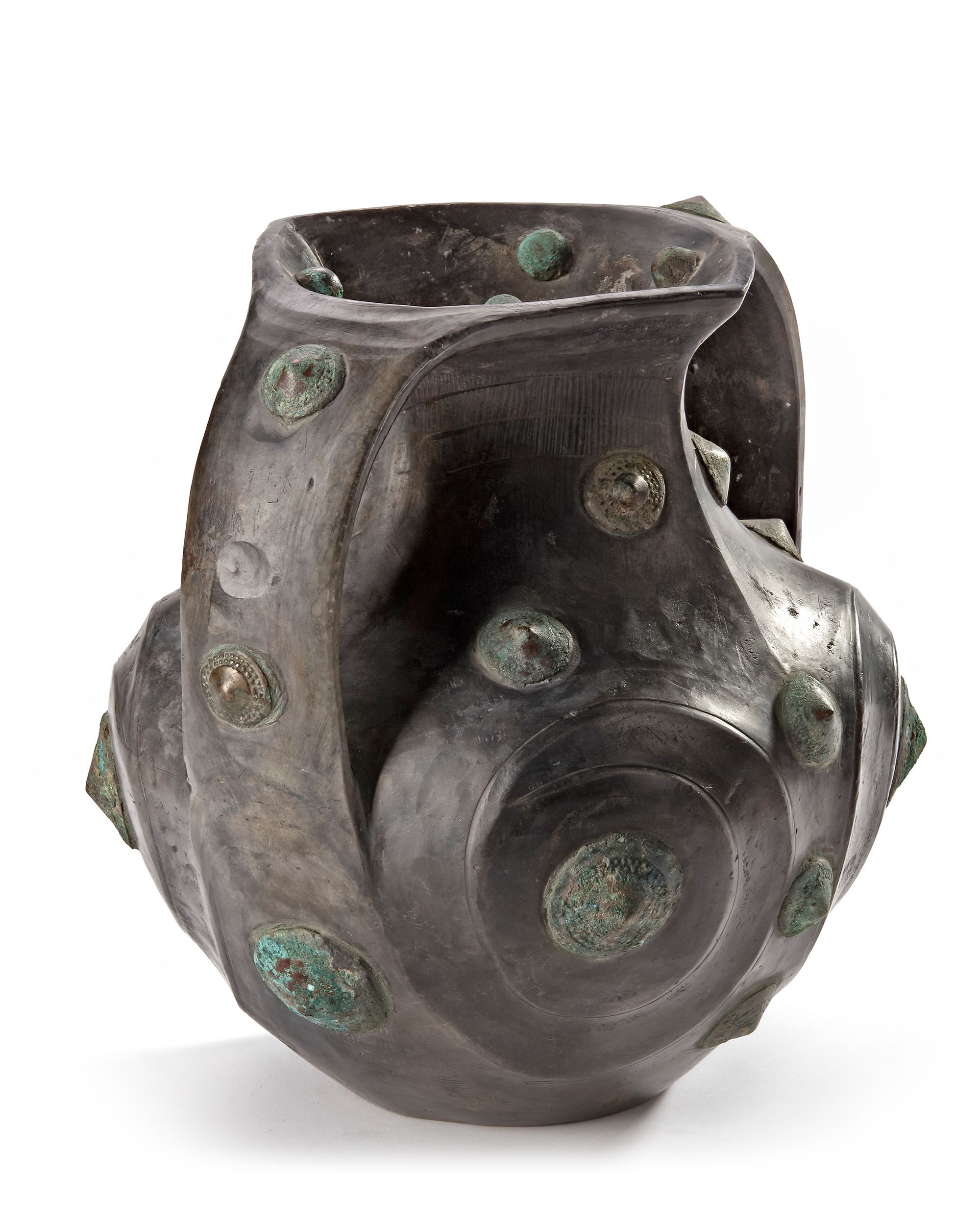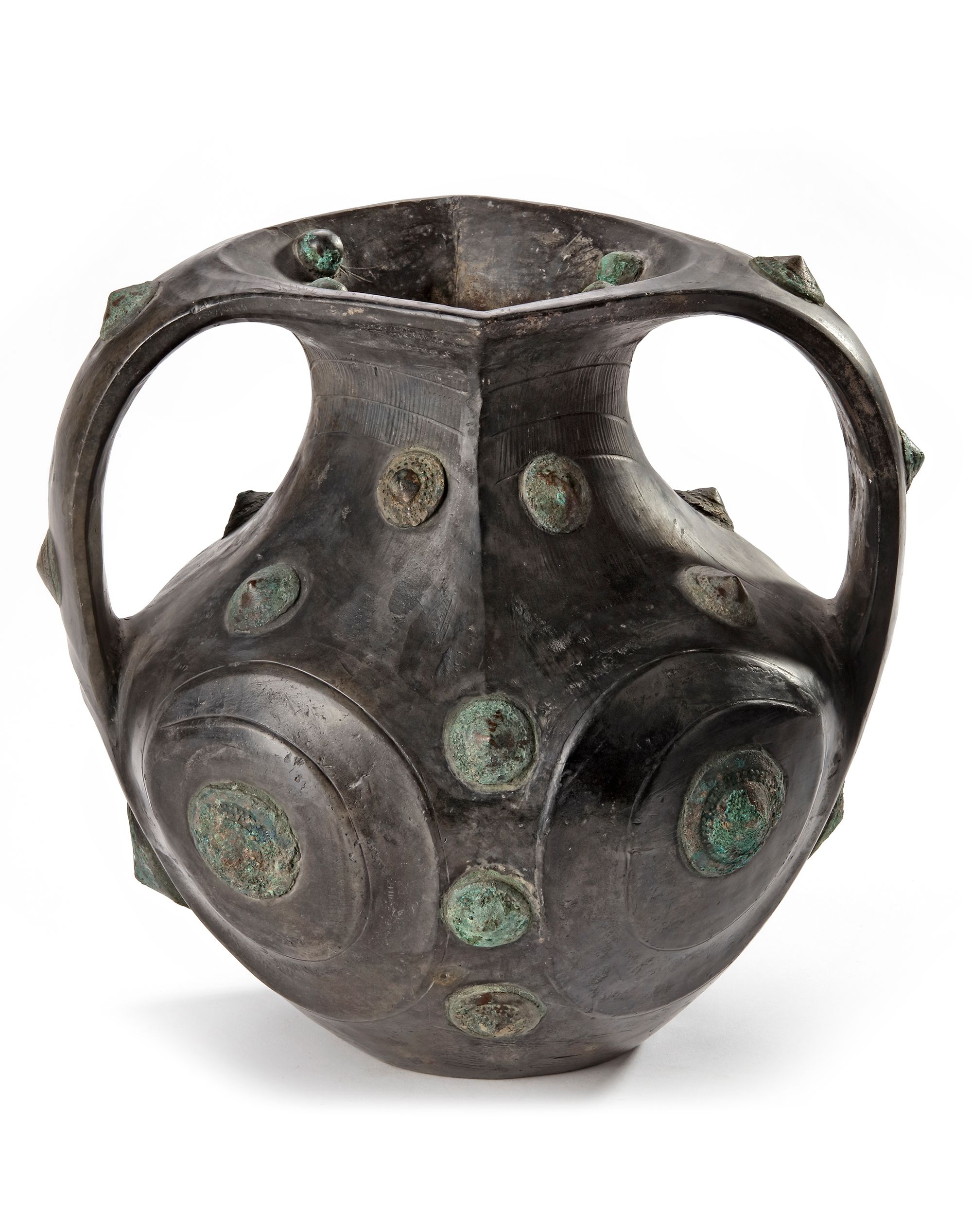The squared globular body molded on either side with two bold spirals extending into broad flattened handles joining the shoulders to the flared lozenge-shaped rim, applied with conical metal bosses, the neck etched with four rows of vertical hatching and retaining traces of orange pigment.