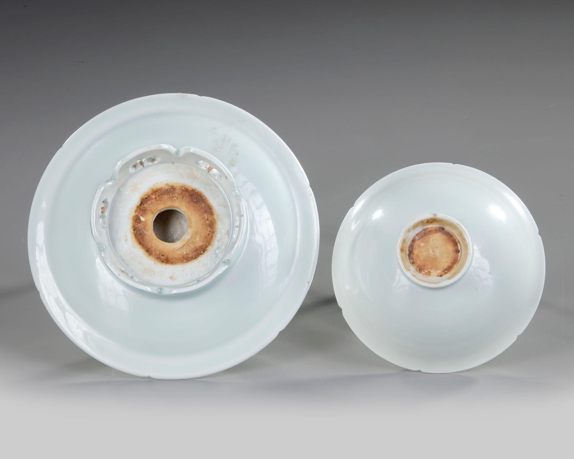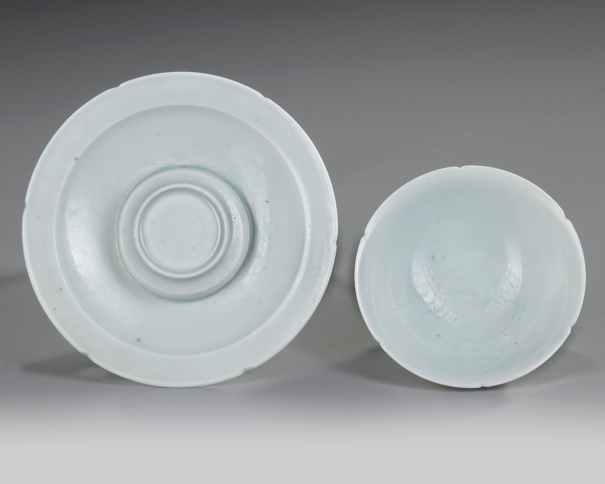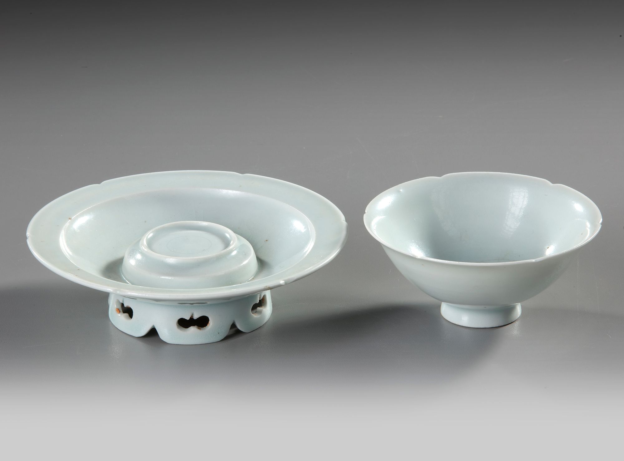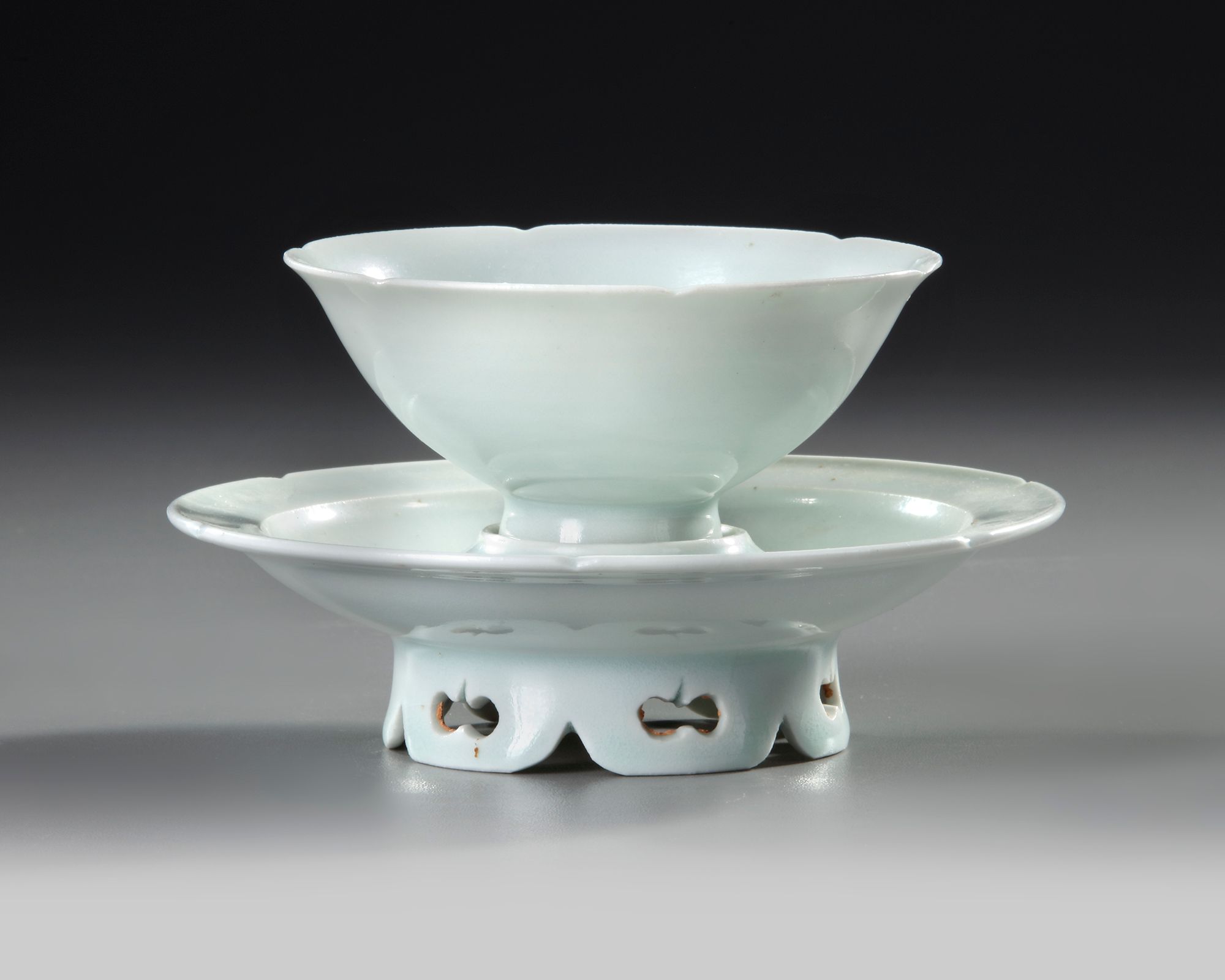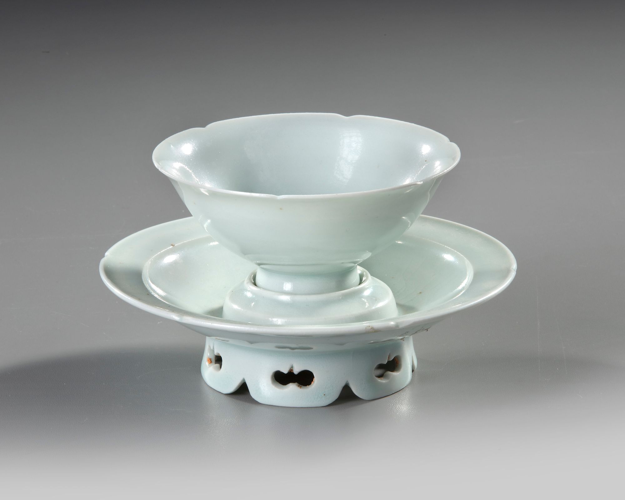 The thinly potted shallow cup rising from a short flared foot to an everted rim, the rounded sides divided into six petal lobes by notches around the rim, resting on a stand of saucer shape with a hexalobed rim and stepped pedestal in the center, all on a trefoil-pierced petal-shaped foot, both covered overall with a pale ice-blue translucent glaze.