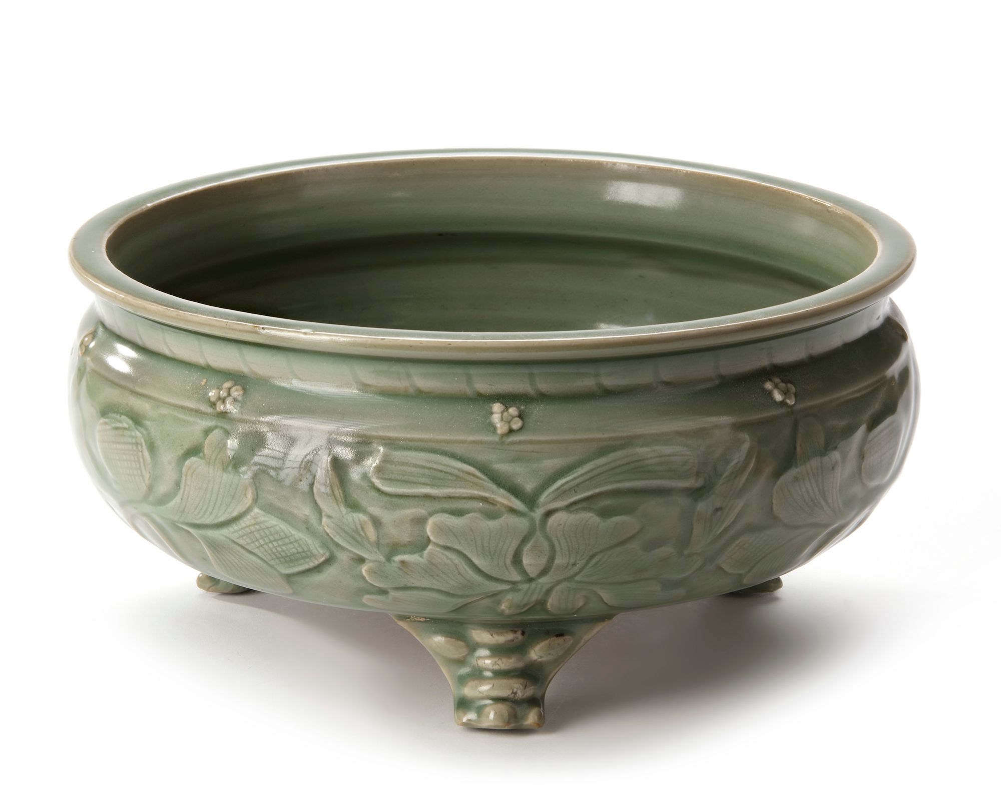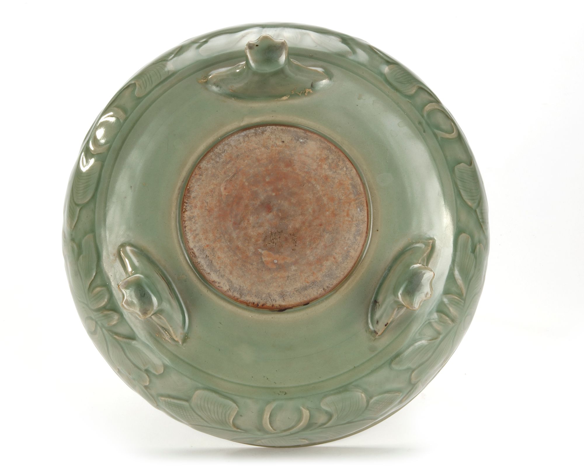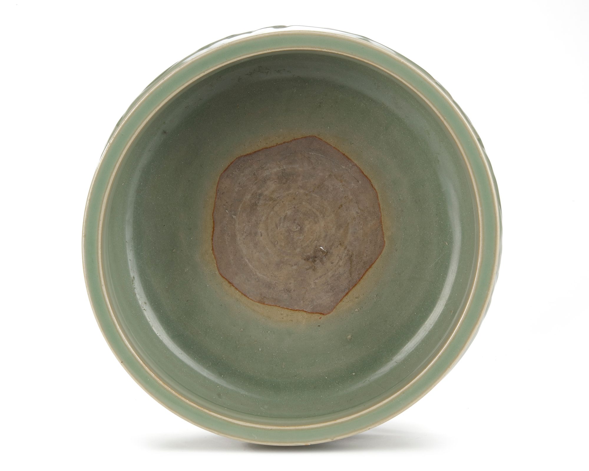 A Longquan celadon bulb bowl supported on three paw fee, everted rim with vertical ribs, the sides nicely carved with a frieze of detached peony sprays under a band applied with small flower-shaped studs, beneath a fine, translucent sea-green glaze, the base of the bowl and a part in the centre of the interior unglazed.