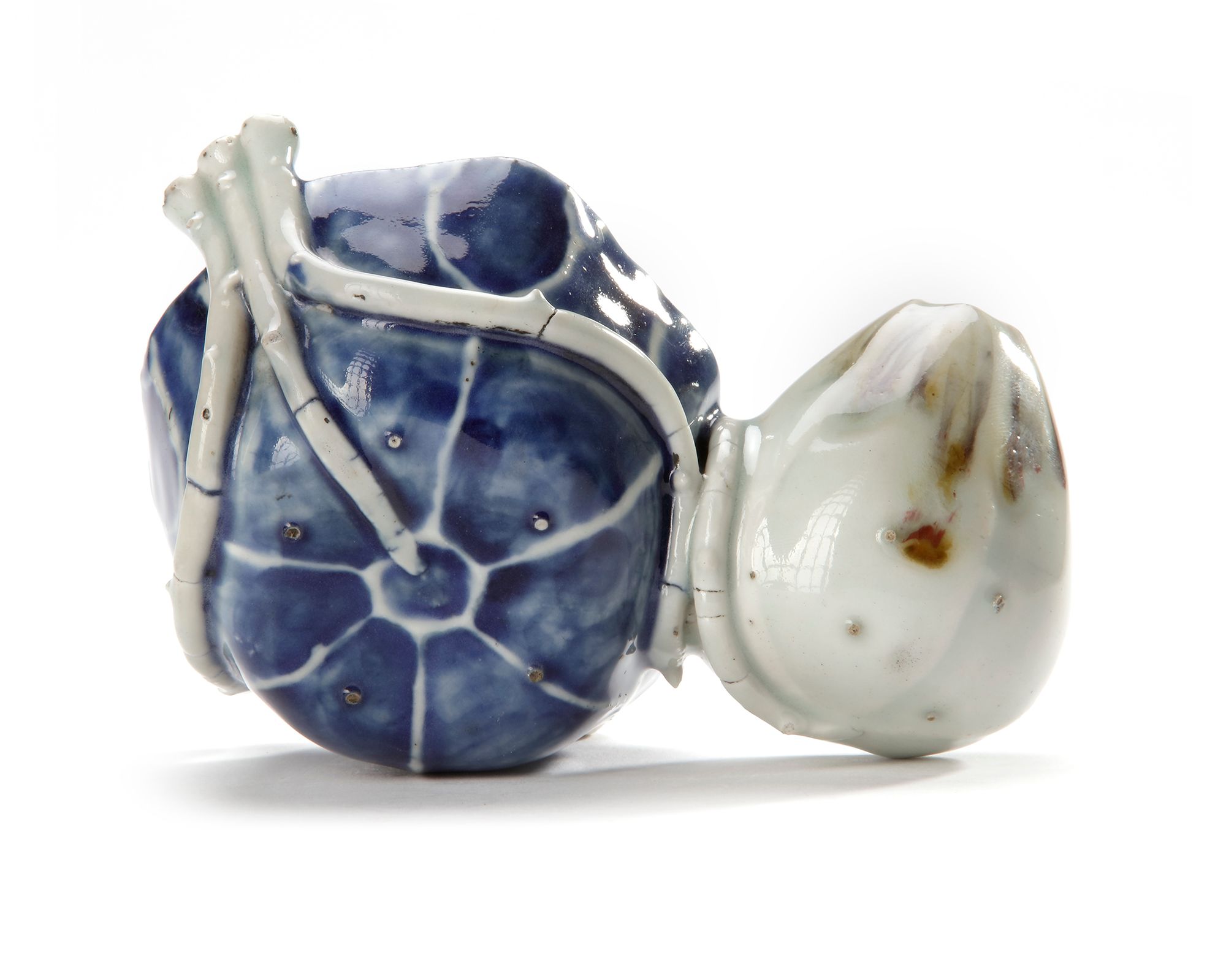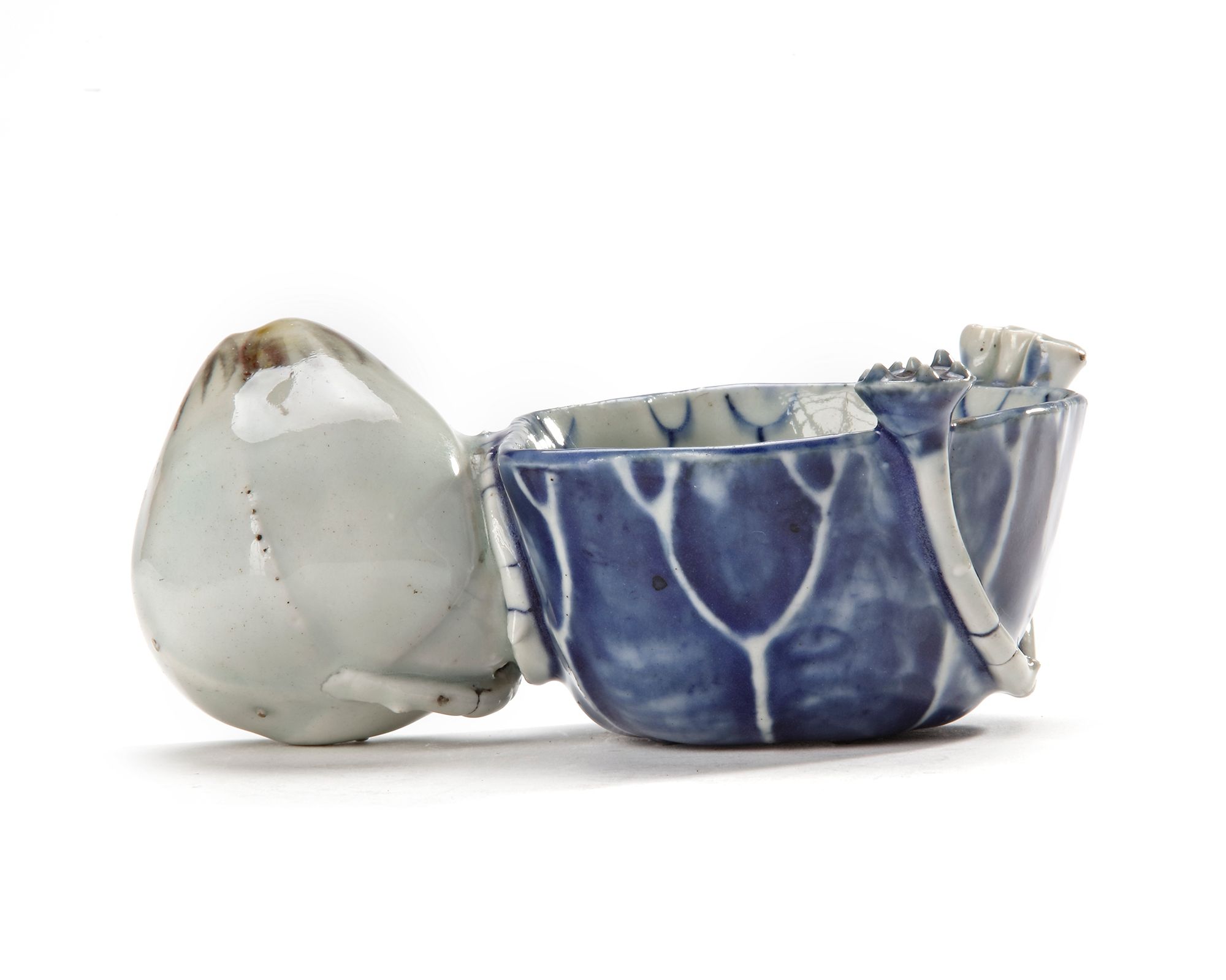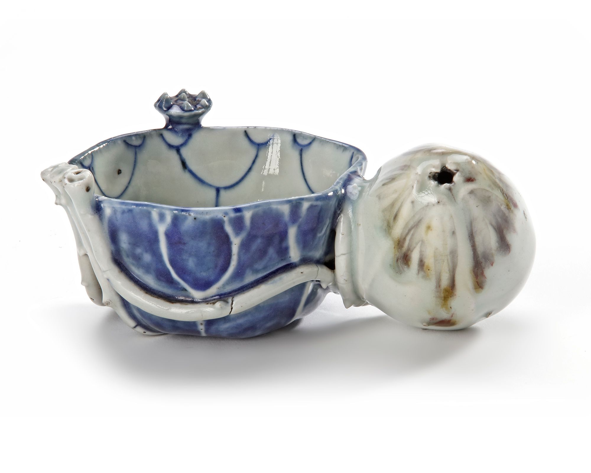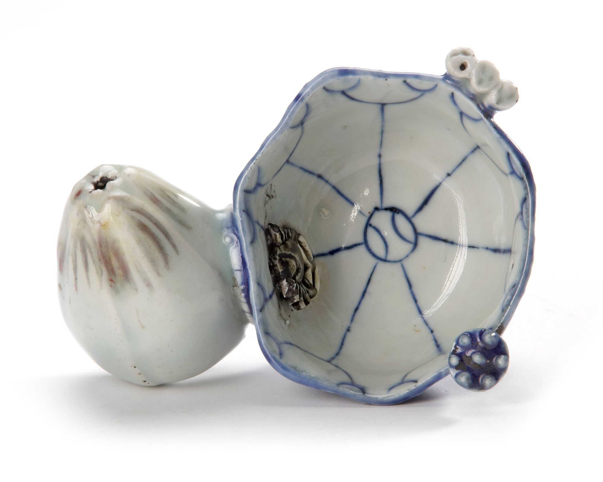 The watercup and dropper combined in the shape of a lotus leaf and seed-pod, the stem forming a short handle, a small pod the brush rest. The two parts have a communicating water channel masked by a black crab. All done in underglaze blue, the dropper with a few touches of copper red.