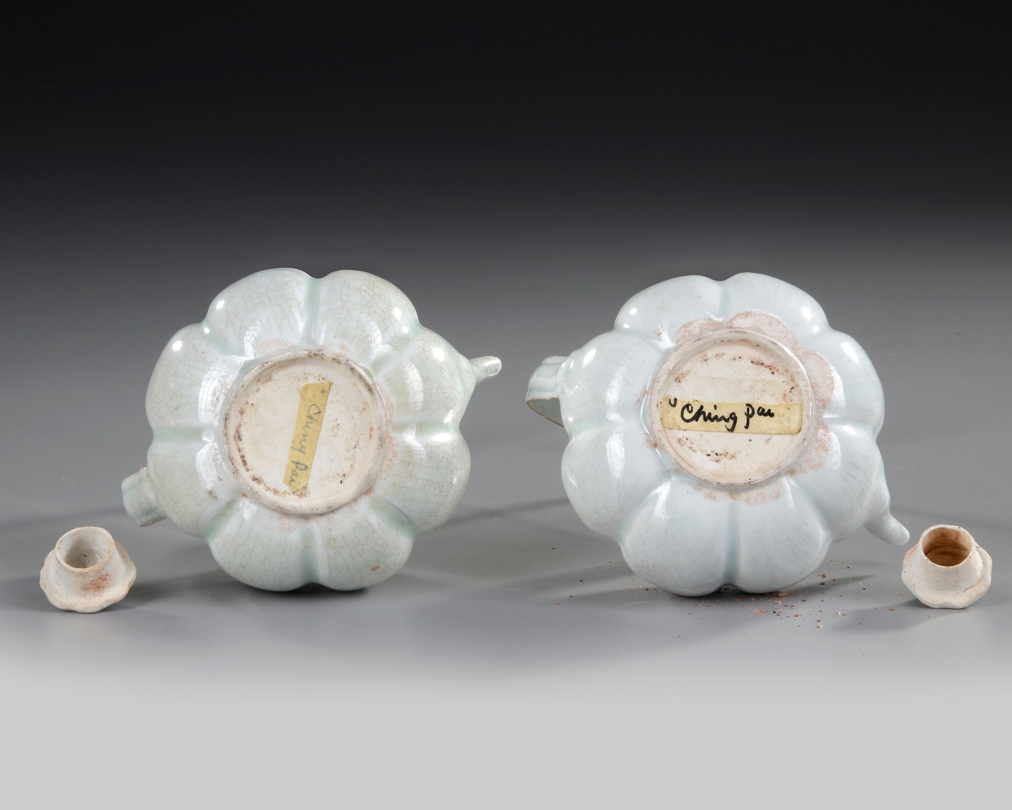 Two Chinese teapots, with stemmed lid, melon shaped body, small spout and a handle, covered with a bluish Qingbai glaze.