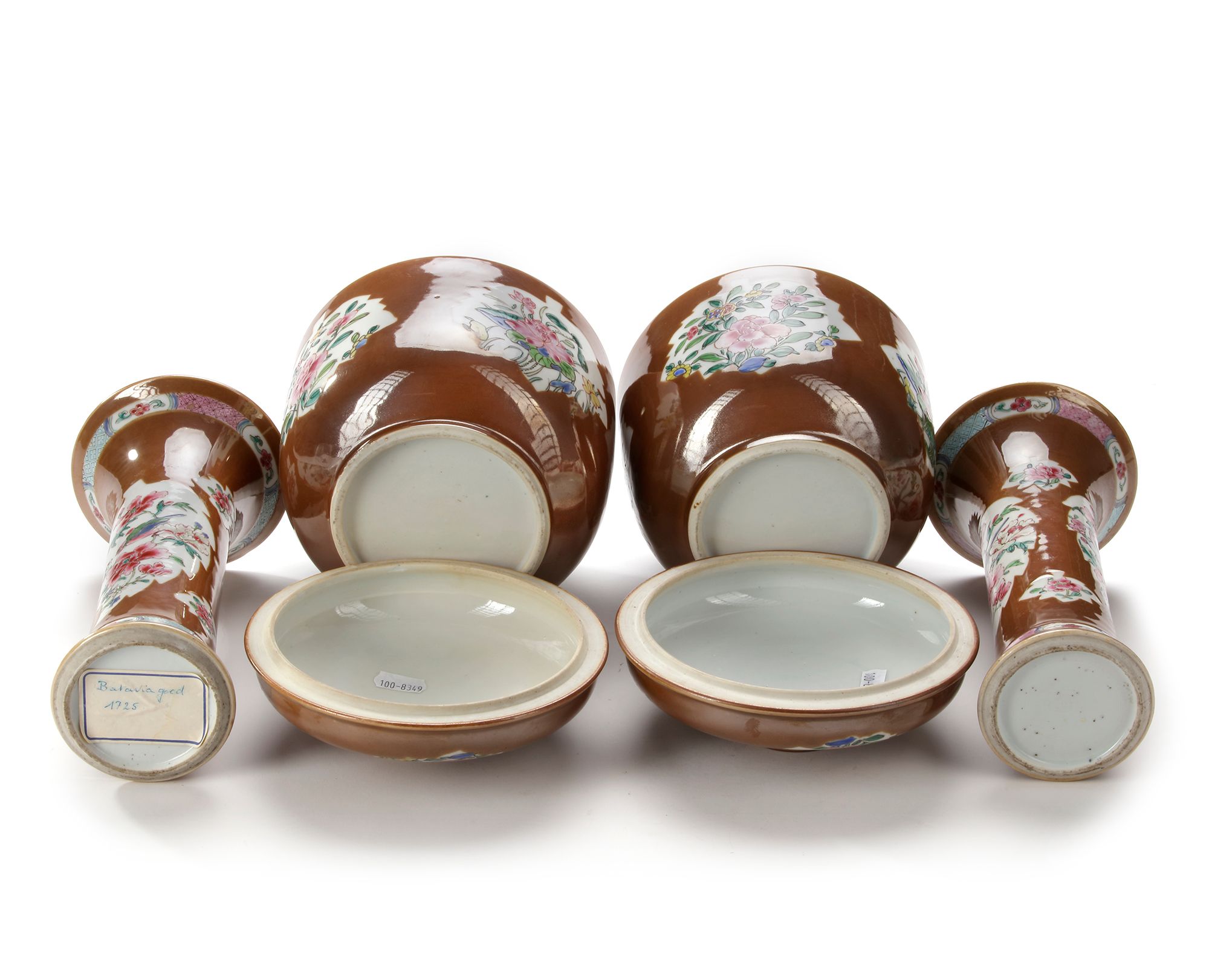 One pair of brown ground ginger jars and covers decorated with floral famille rose floral panels.